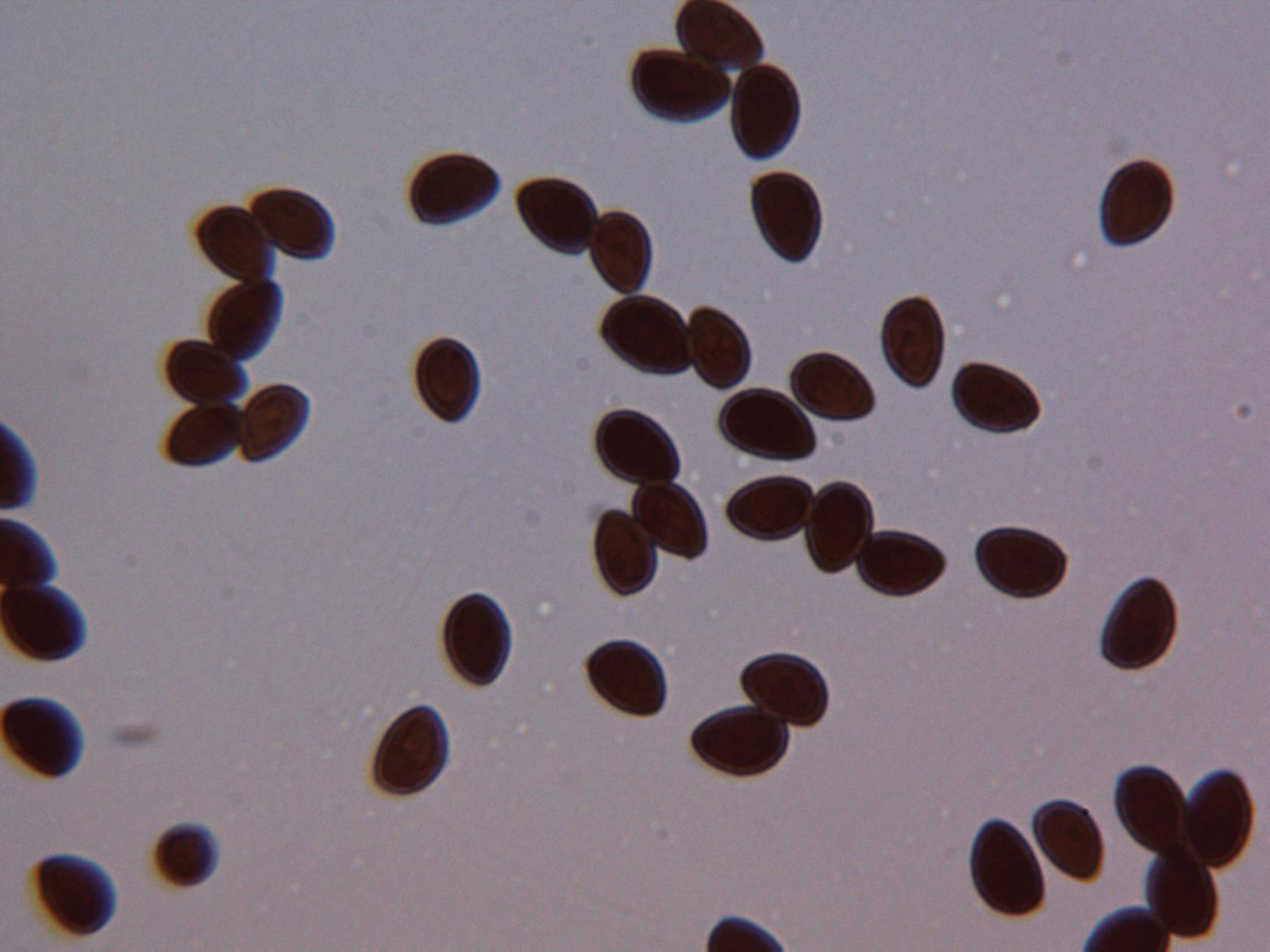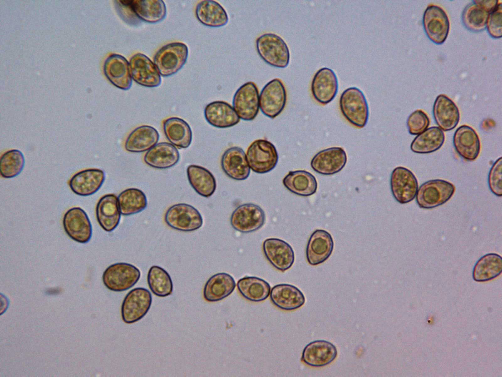 Esporas entre elipsoidales y almendradas, con un extremo más redondeado donde se aprecia una discreta apícula lateral, con contenido granuloso y una pared muy tímidamente rugosa. Existe una gran variabilidad en cuanto al tamaño esporal que debe presentar en función del autor consultado, aunque mi propuesta se encuentra dentro del rango de la especie.