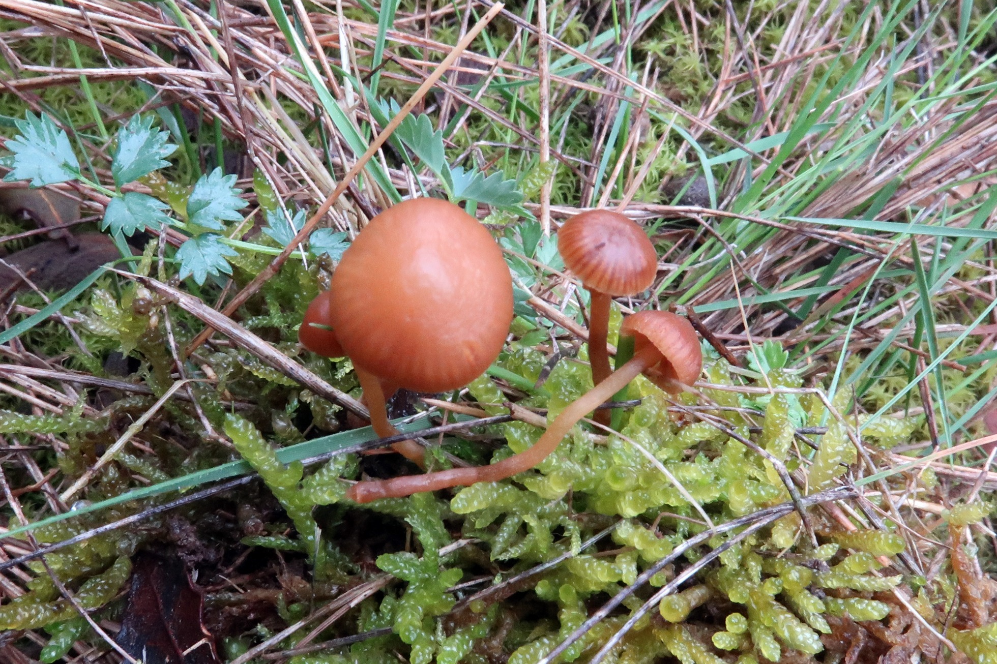 Pequeños ejemplares de menos de 2 cm., de sombrero convexo, color marrón anaranjado, superficie lisa y seca y transparencia radial de las láminas.