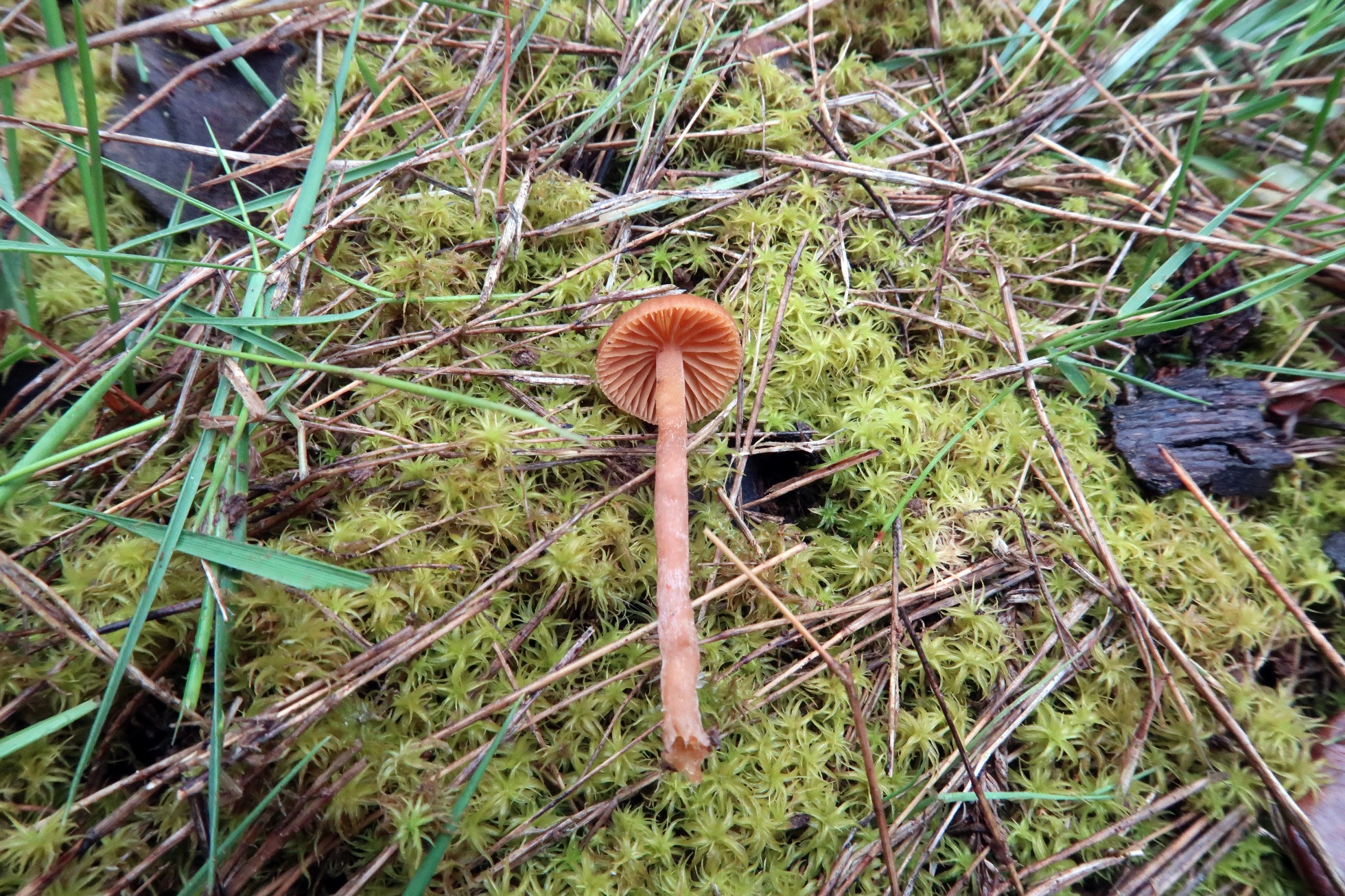 Pié largo y fino, hueco con un diámetro de apenas 1,5 a 2 mms., concoloro con el sombrero y con una pruina blanquecina en su superficie. Láminas adnatas, de color ocráceo, bastante espaciadas, ventrudas y con lamélulas.