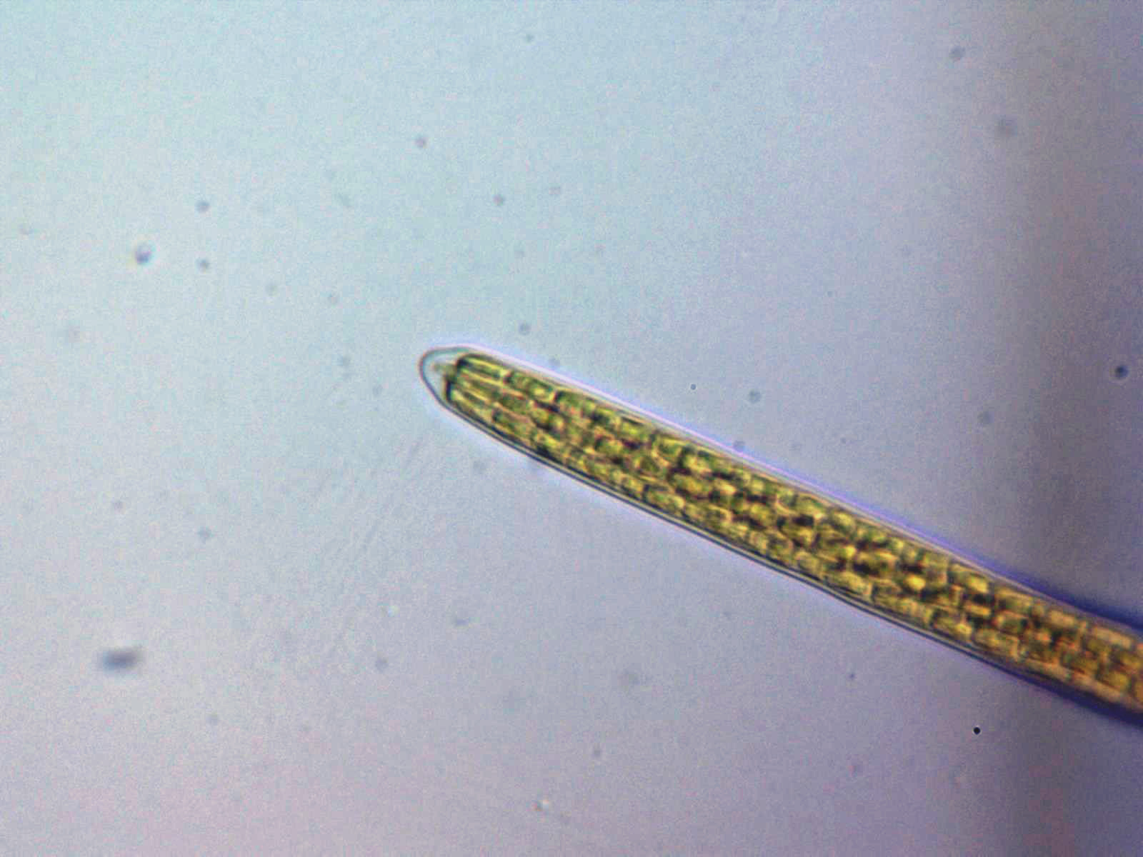 Extremo de una asca a 1000 aumentos en solución de agua destilada, con una anchura de entre 7,7 a 8,9 µm., en su interior se pueden observar las esporas.