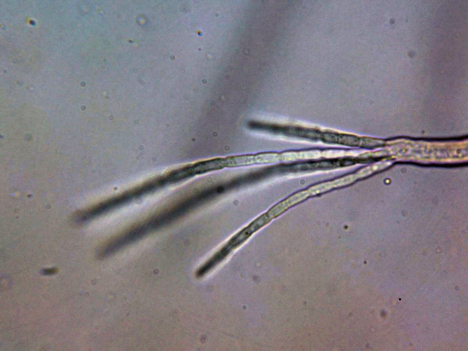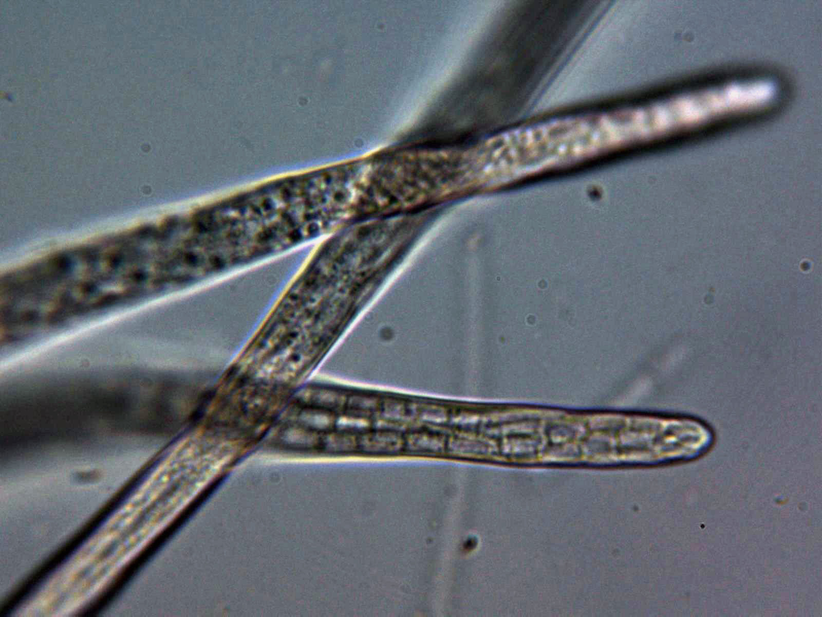 Detalle de las esporas a 1000 aumentos, septadas y con una anchura de entre 2,1 a 2,6 µm.
