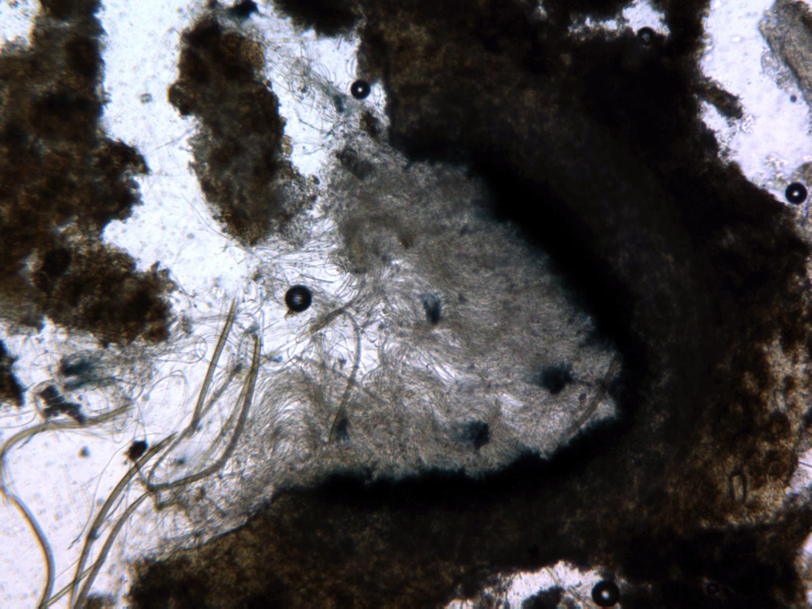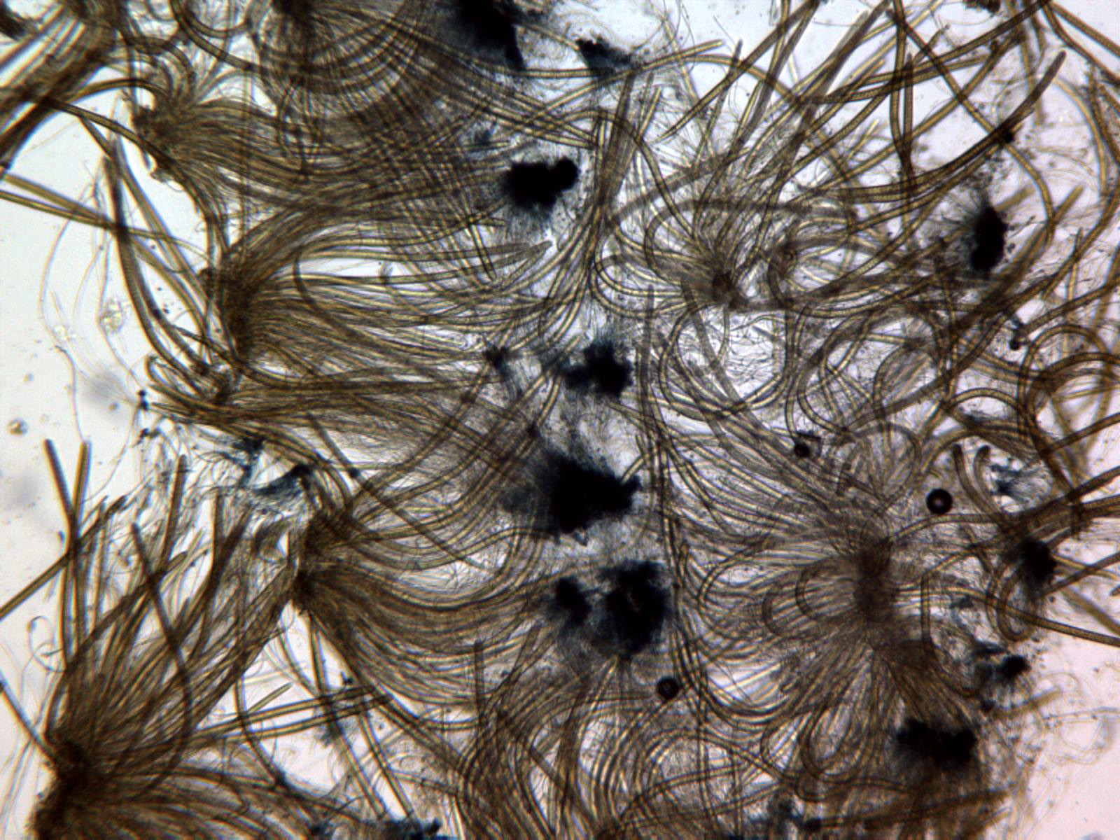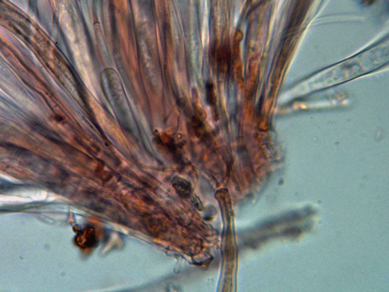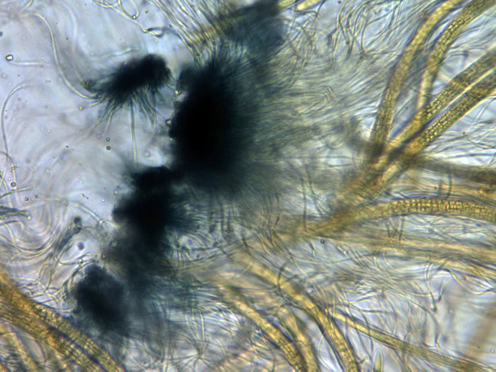 Sección del mismo a 100 aumentos en solución de Melzer, se observa la base de las ascas una fuerte reacción amiloide virando a azul oscuro.