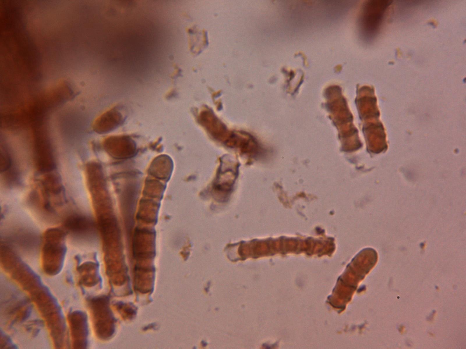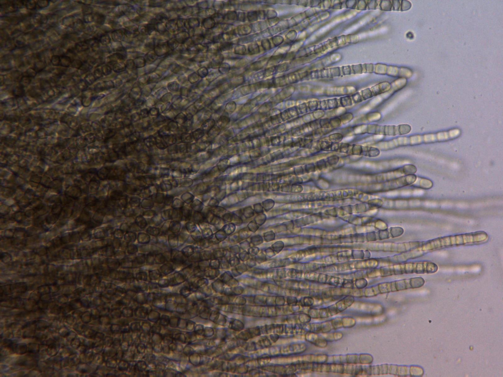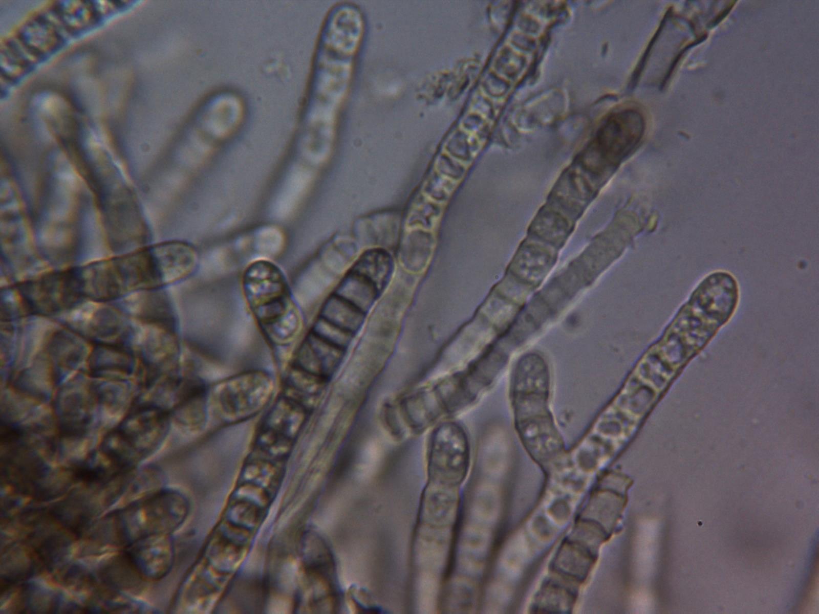 No se observan ni basidios ni ascas, solo las terminaciones que se rompen en fragmentos a modo de esporas, como si de conidios se tratara.