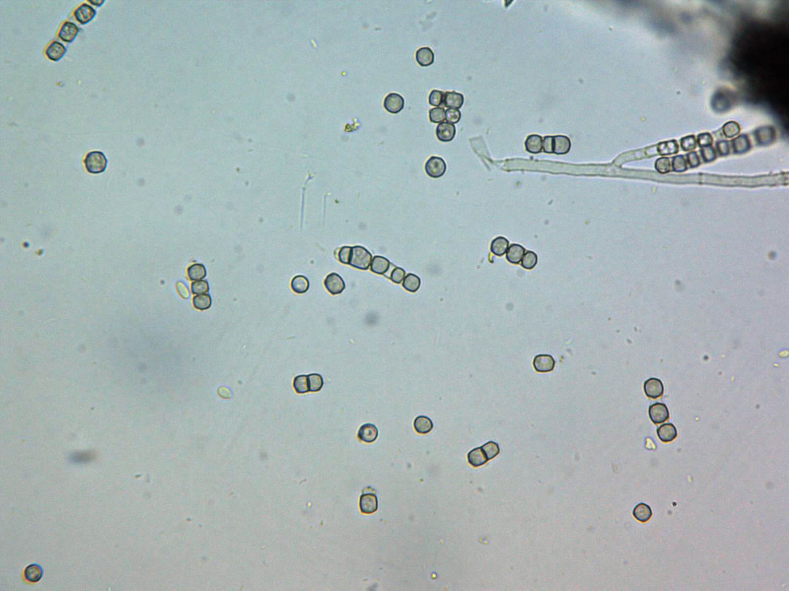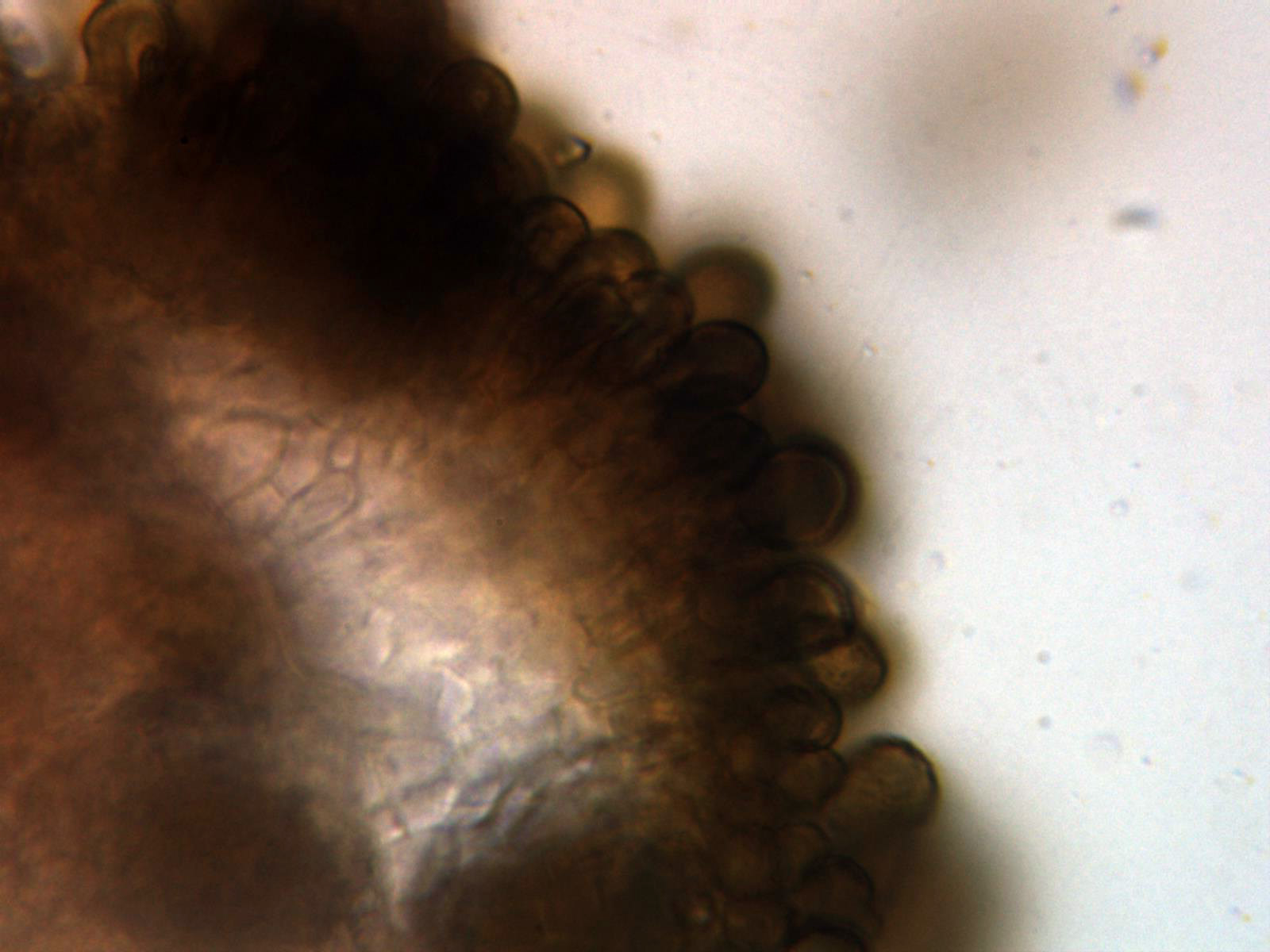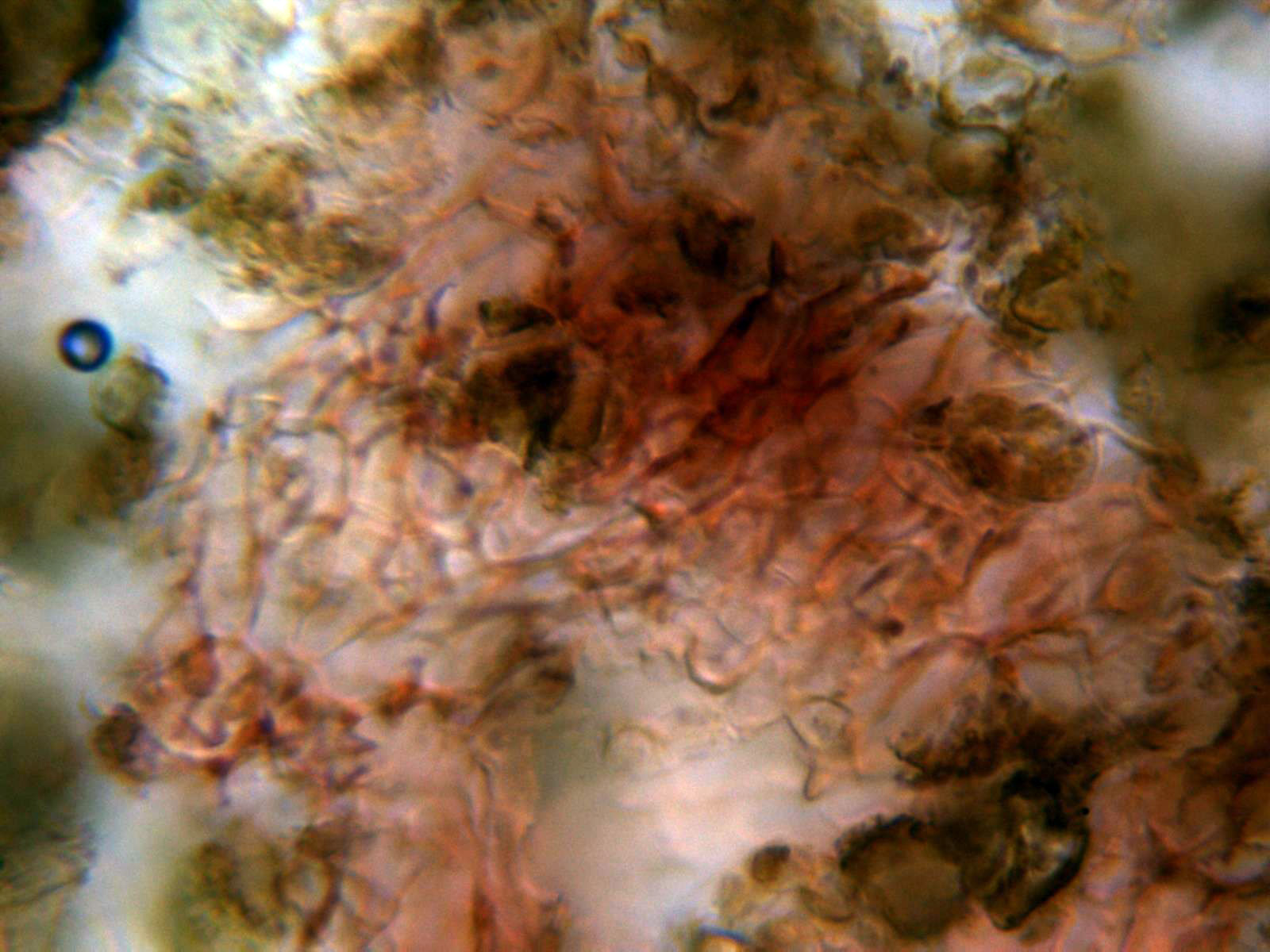 No se observan ni basidios ni ascas, solo las terminaciones que se rompen en fragmentos a modo de esporas, como si de conidios se tratara.