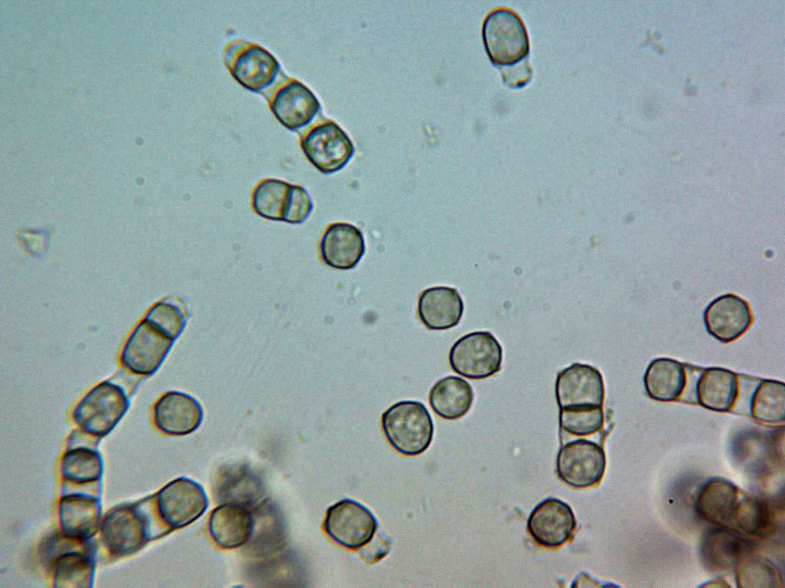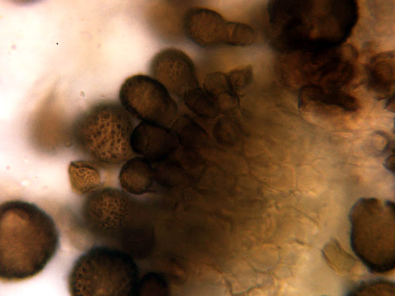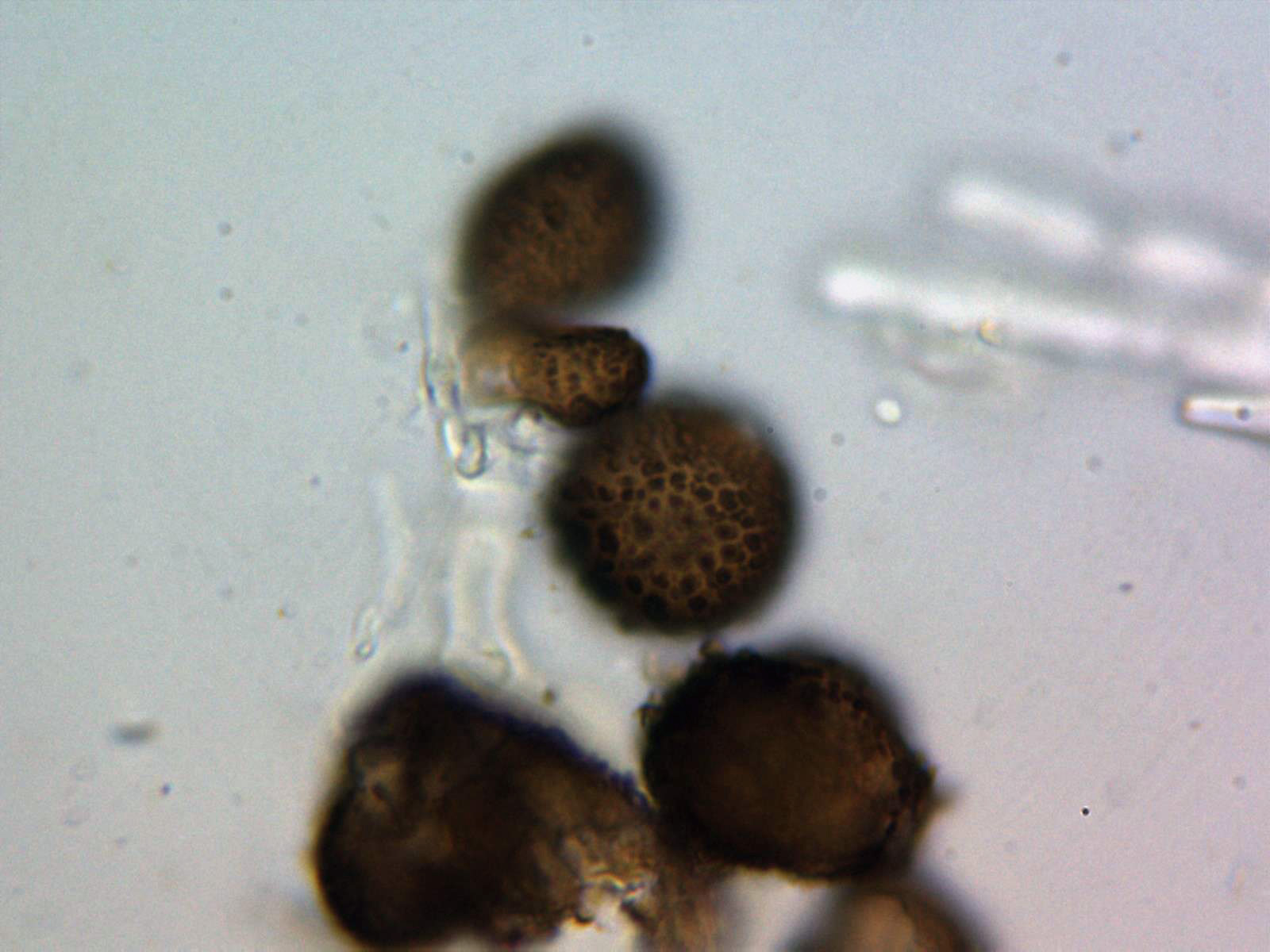 Conidios verrucosos de color marrón oscuro, entre globosos y piriformes, con una célula basal de color mas claro en un extremo. En mis mediciones de 18,4;26,8 X 17,8;25 µm., totalmente acorde con la bibliografía de la especie (11,5 a 28,5µm.)