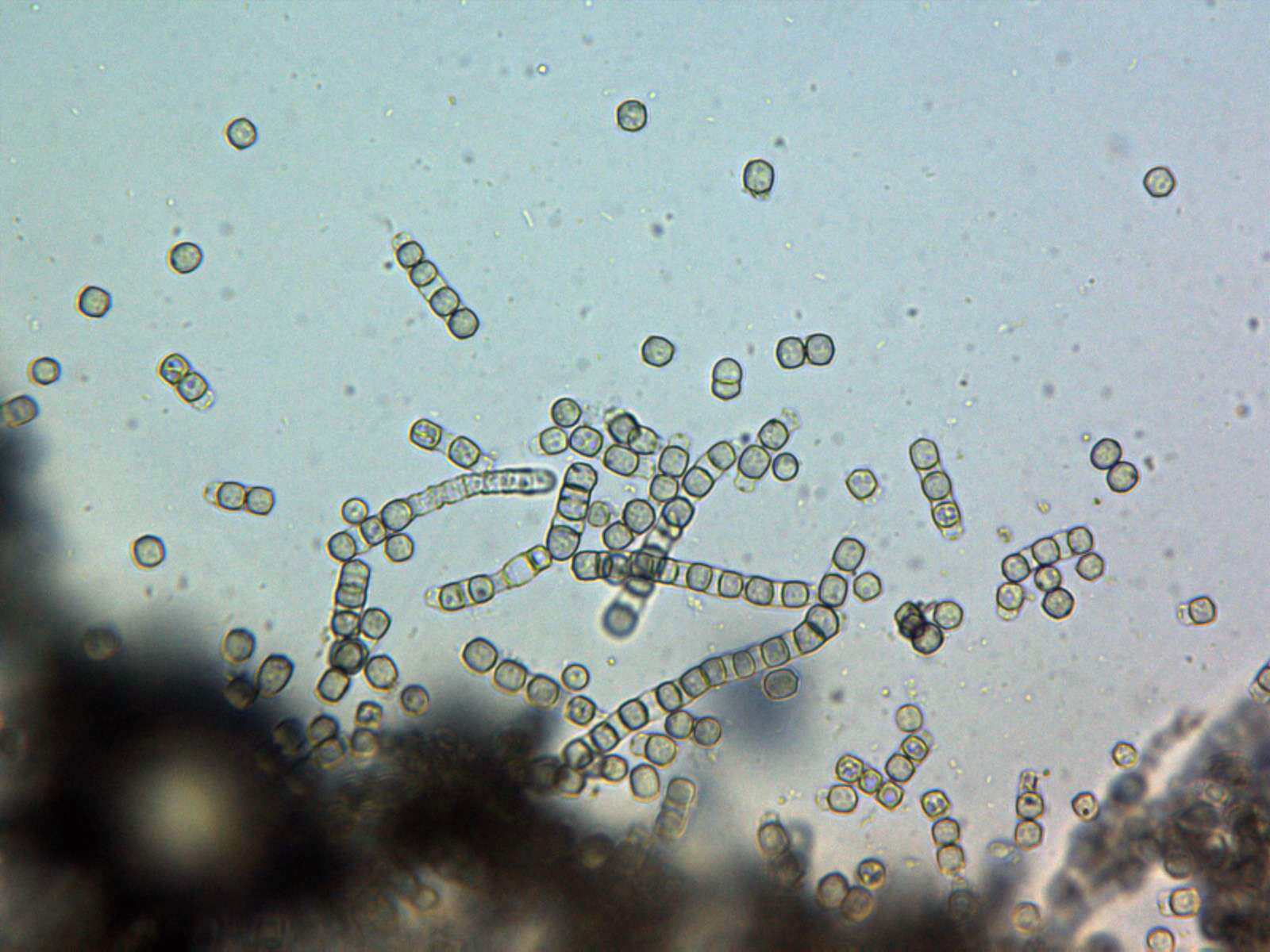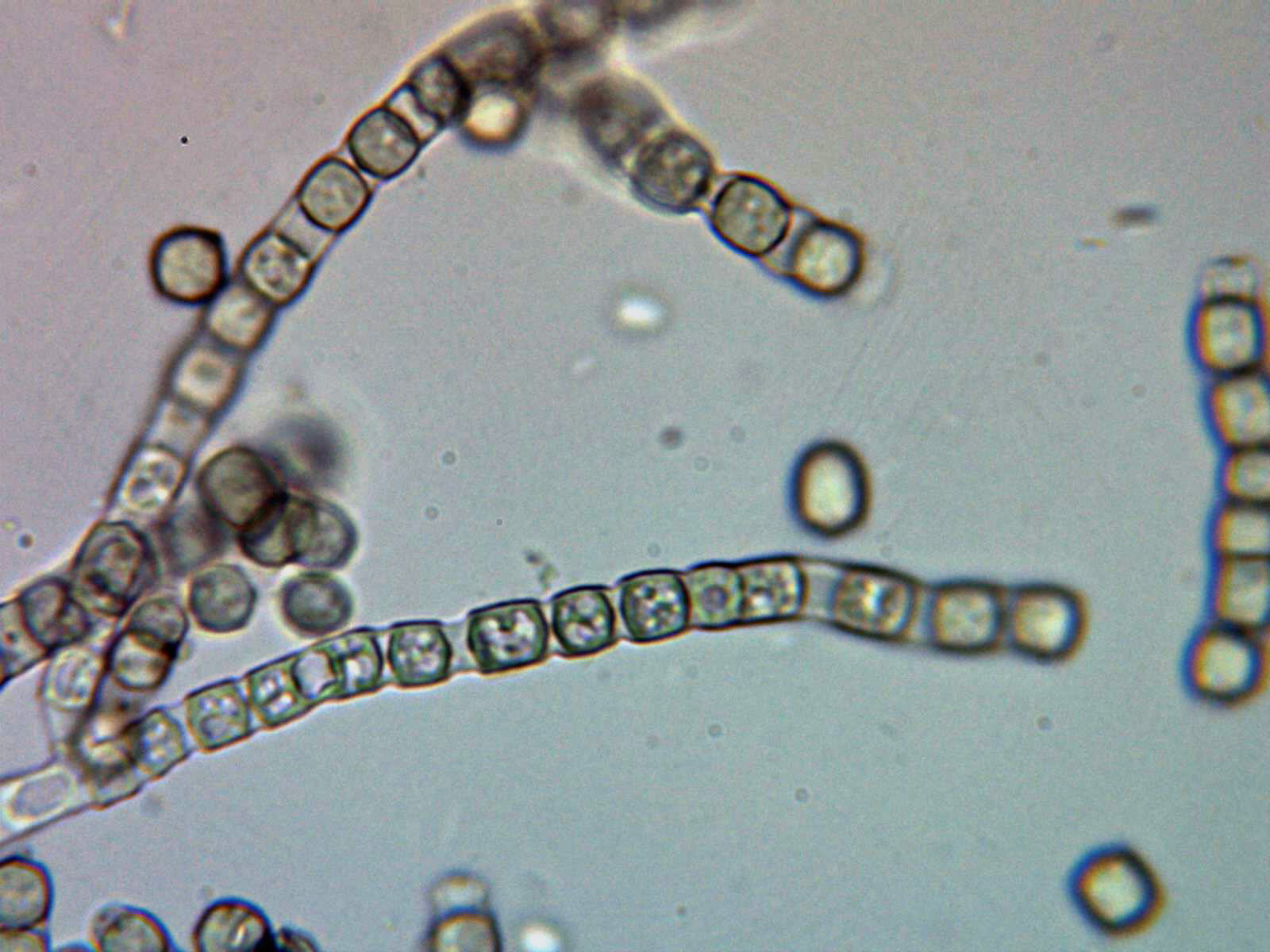 Gracias Juan Andrés, esta se me antoja pero que muy complicada, ayer mismo la pase de nuevo por el micro, las tonalidades verde azuladas de los ejemplares adultos son producidas por la esporulación. Dejo unas nuevas imágenes de su microscopía, en este caso todas en solución de agua destilada.