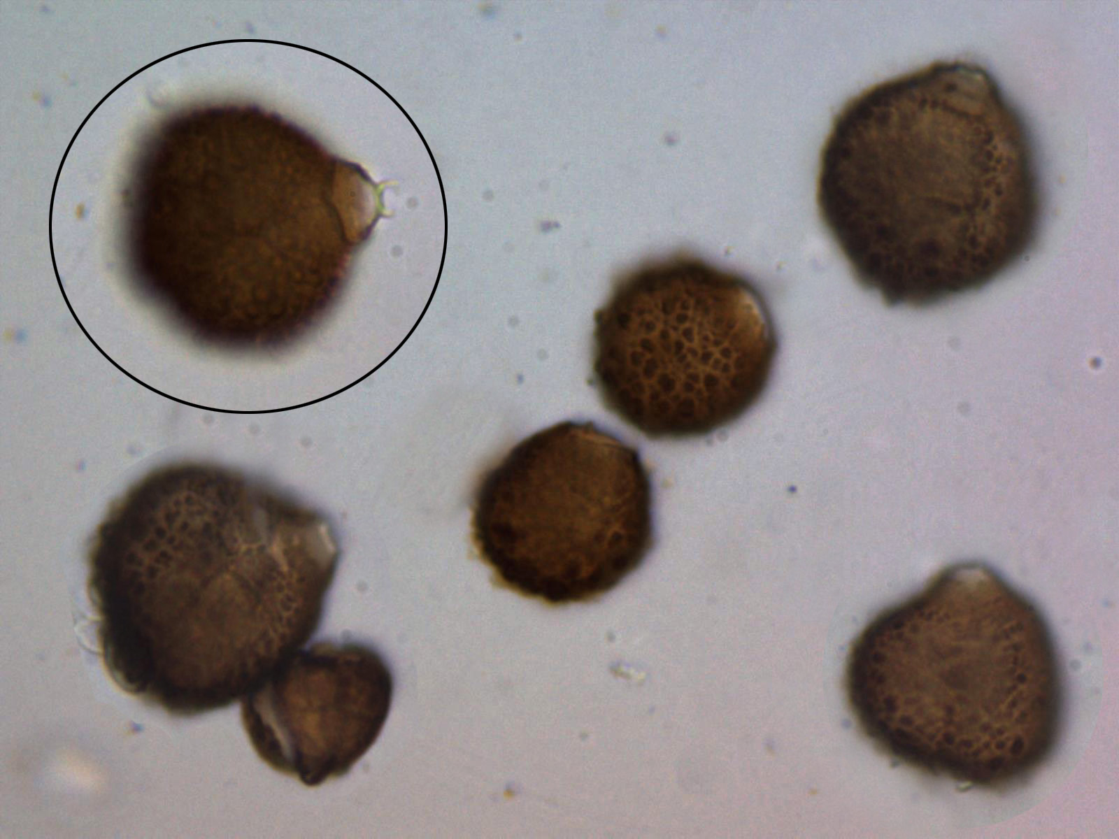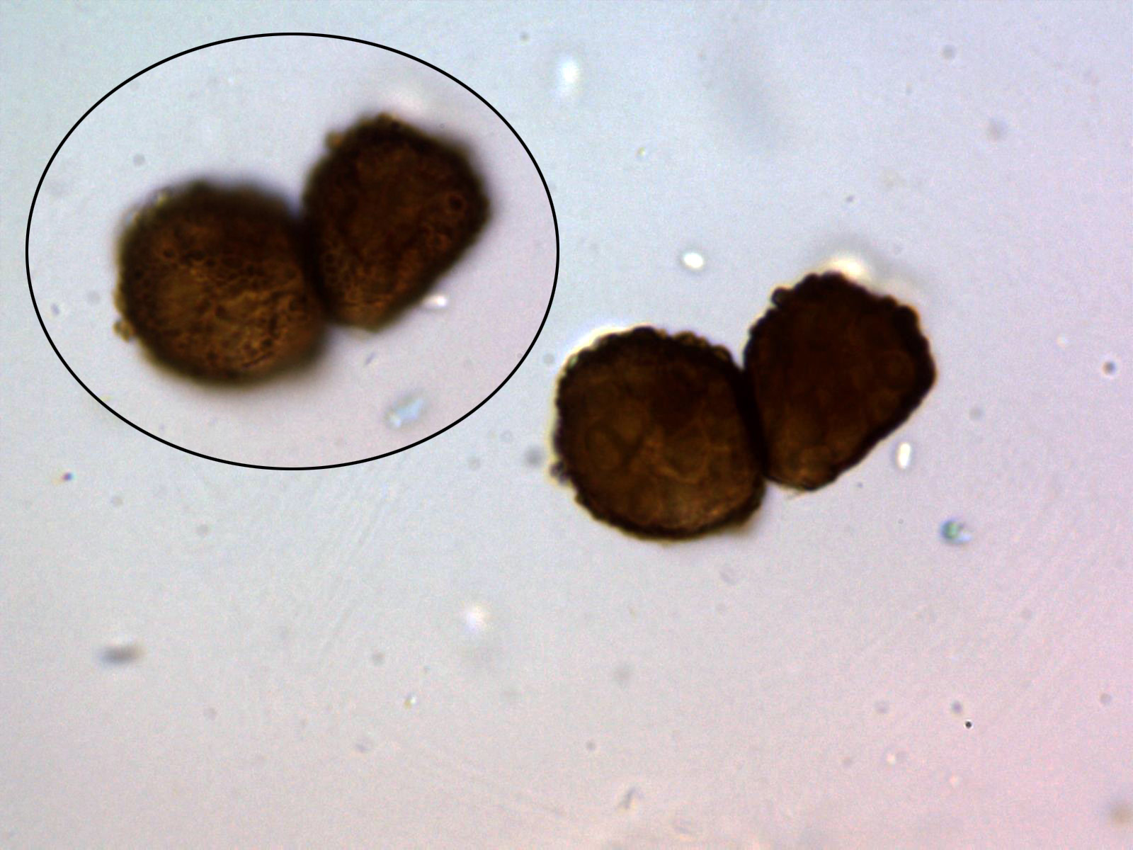 Dos planos diferentes de los mismos conidios en solución de KOH, en los de la imagen principal se observa una retícula en la superficie de los mismos.