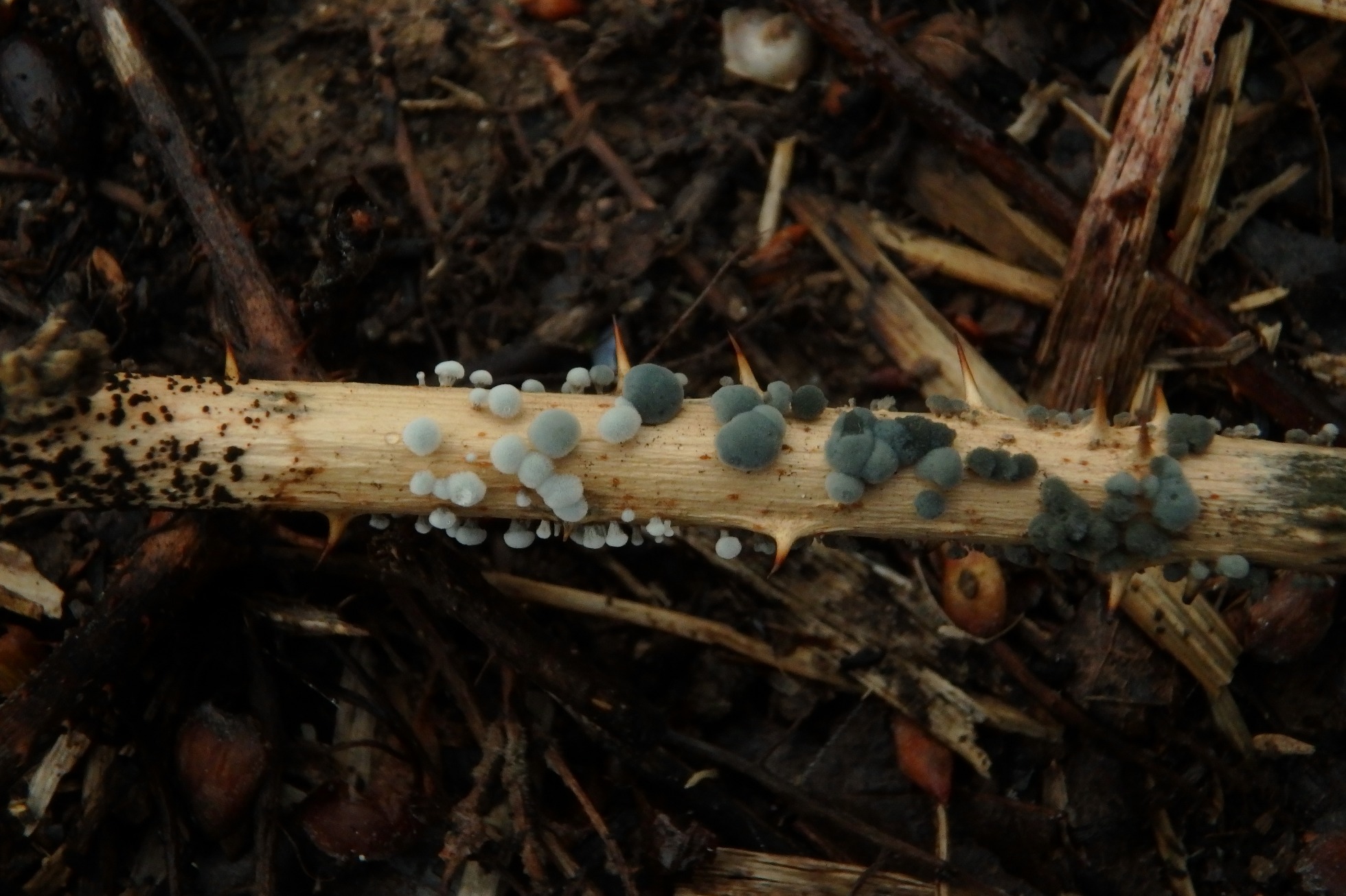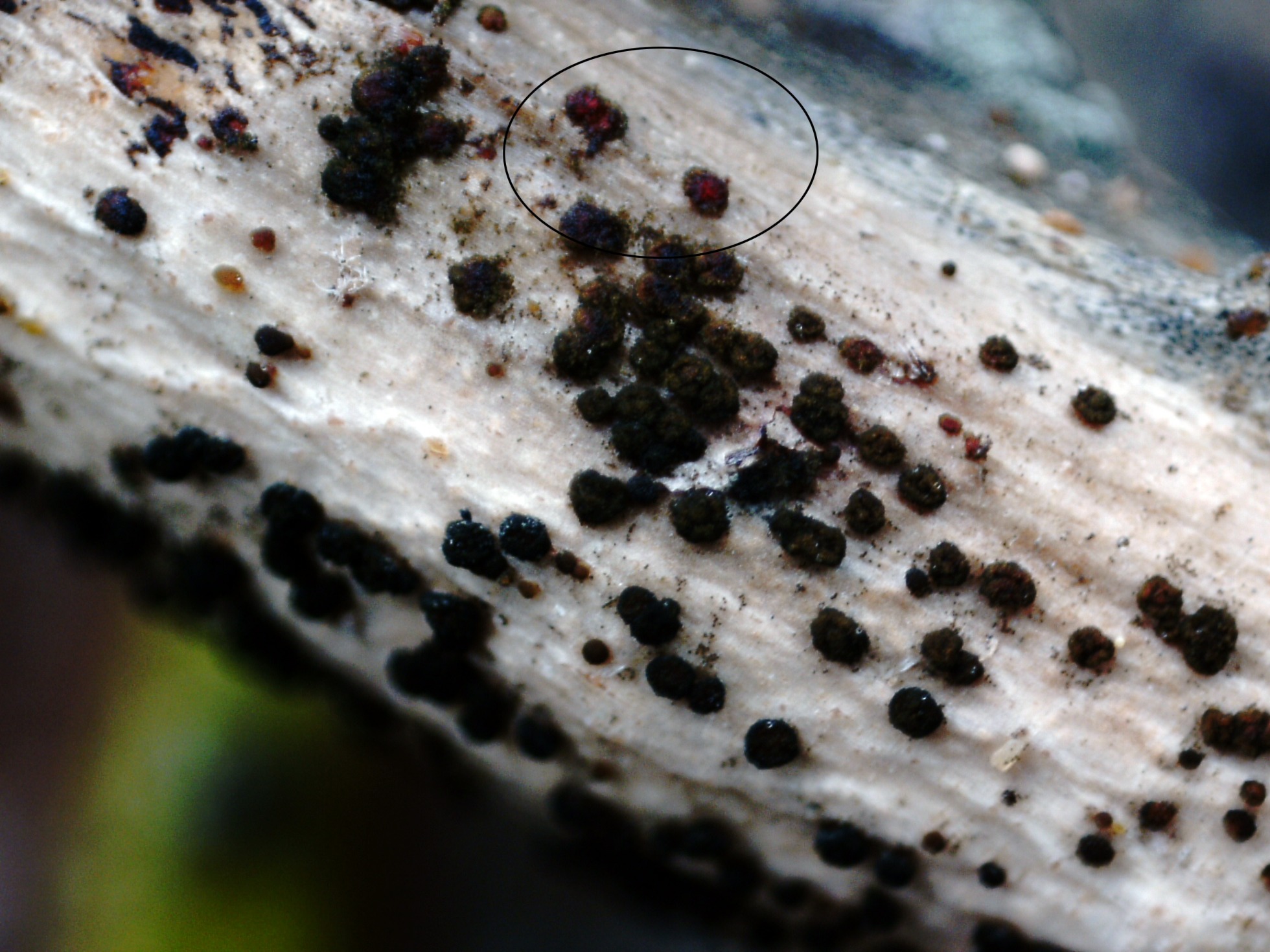 Pequeñas fructificaciones de tan solo 0,3 a 0,5 mm.,en formas más o menos globosas y agrupándose entre ellas hasta formar grupos de 1,5 a 2 mm.