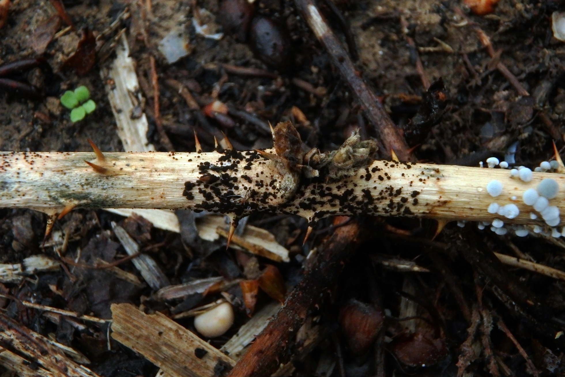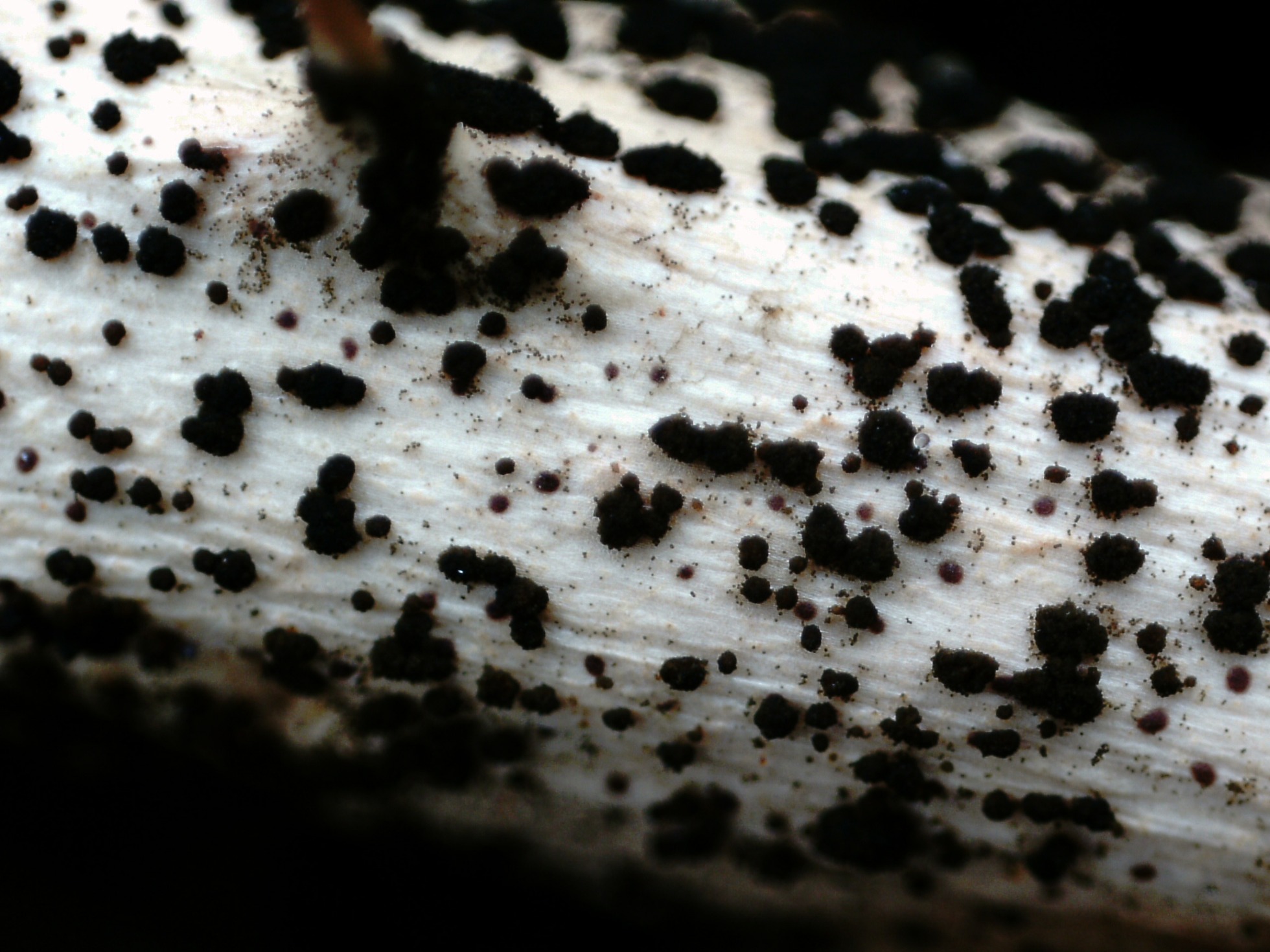 Se trata de los puntitos negros del centro de la imágen, el hongo que aparece a su derecha hasta el momento no he sido capaz de identificarlo, lo único que tengo claro es que no se trata ni de un Mixo y tampoco de un Basidiomiceto. Cualquier sugerencia será bienvenida.