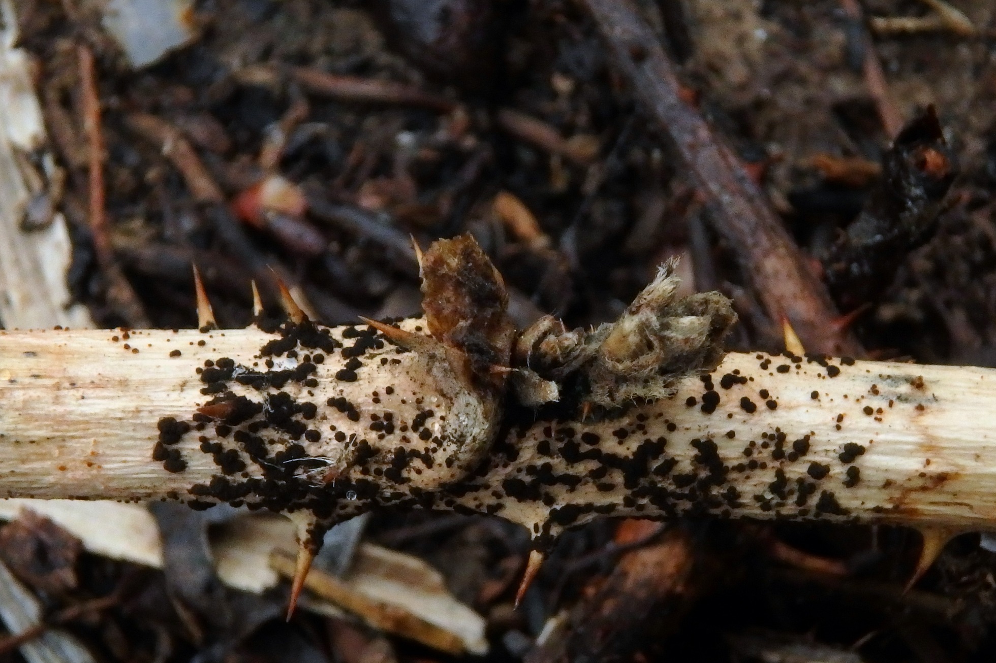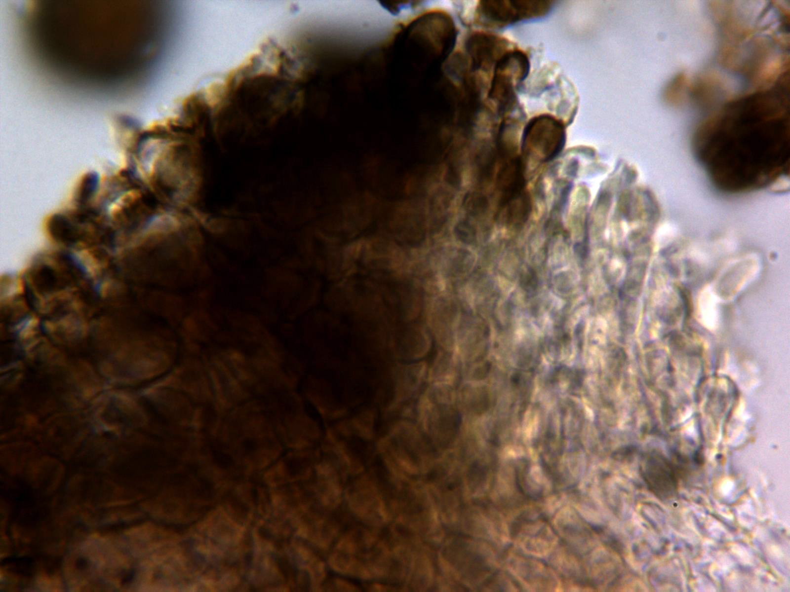 Hasta el momento no tengo nada clara su identidad, creo que empezaré a buscar por los Dothideomicetos, la microscopía me recuerda a Taeniolella sp., aunque no me cuadra el aspecto macro.