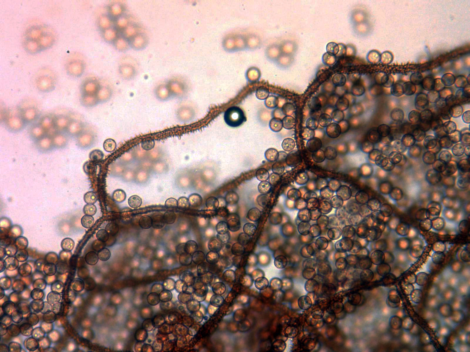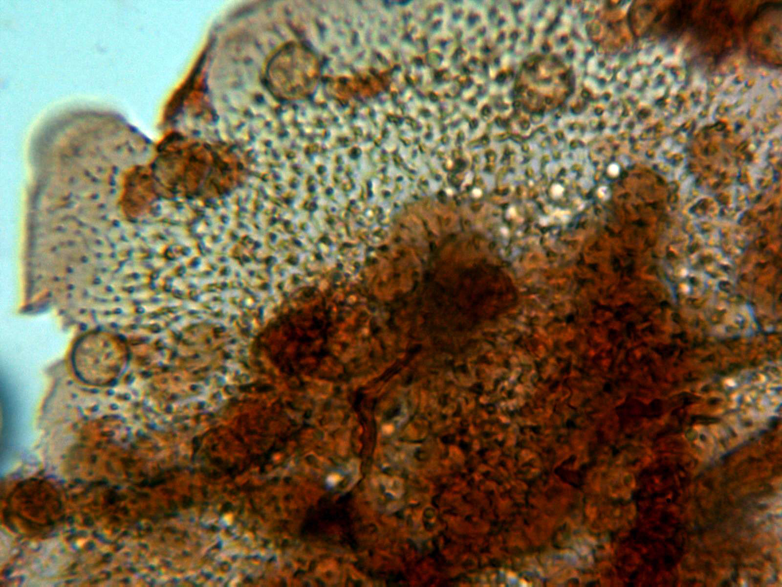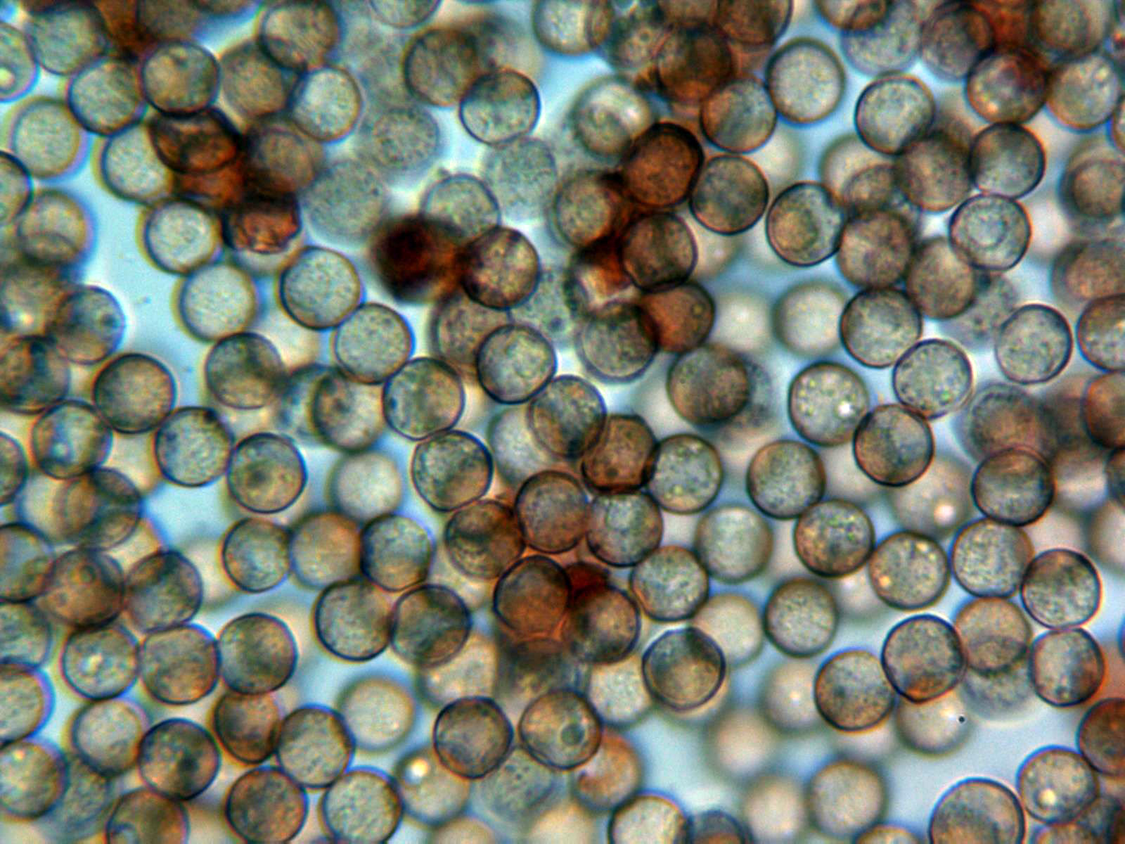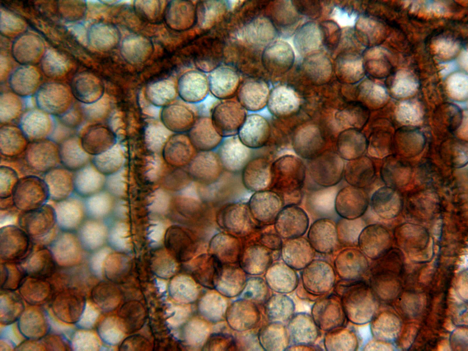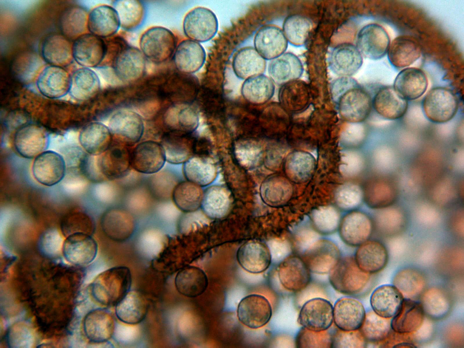 Las esporas globosas, con una muy ligera coloración gris ocrácea, timidamente verrucosas y con unas medidas de entre 8,1 a 9,8 micras.