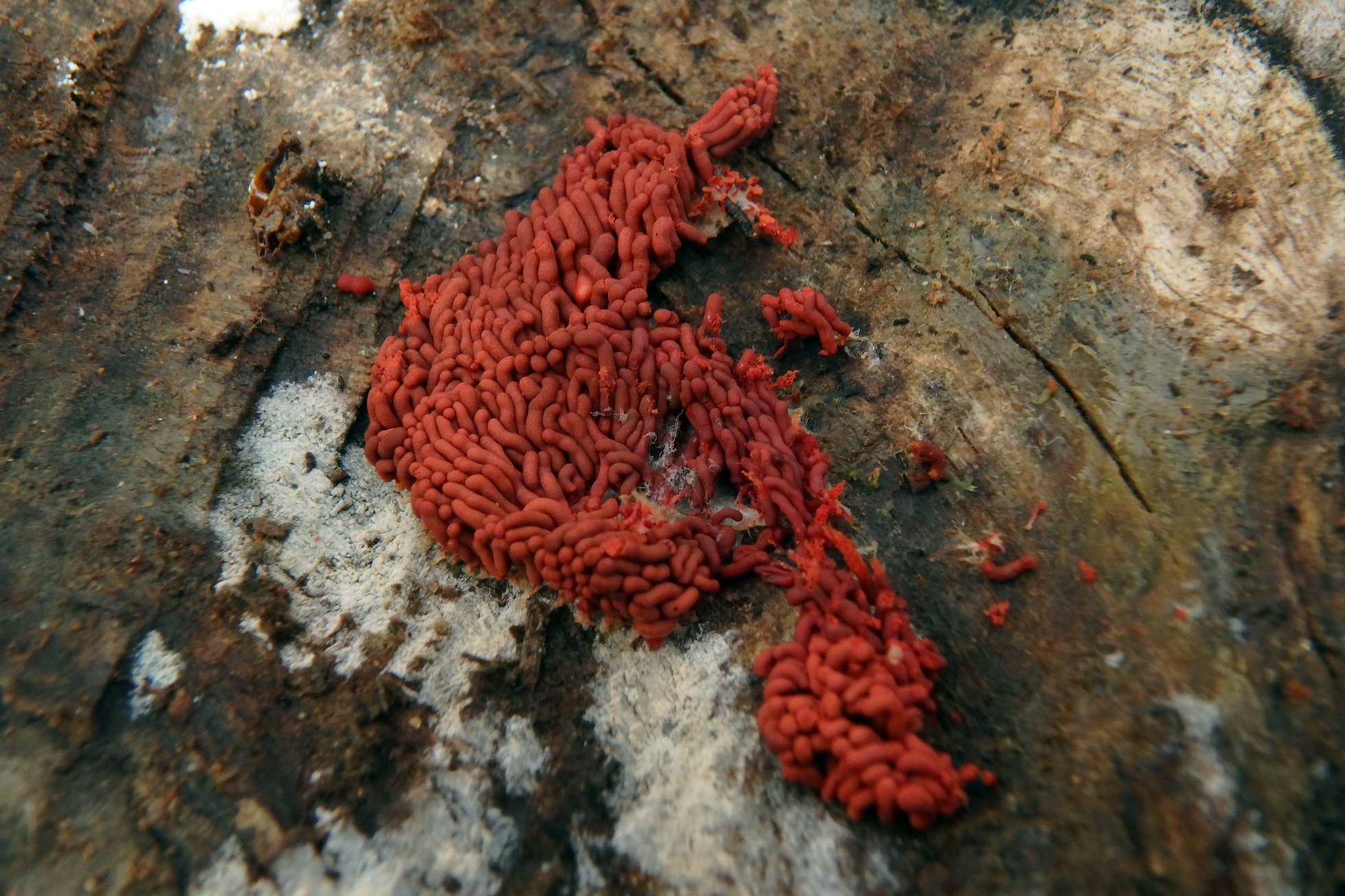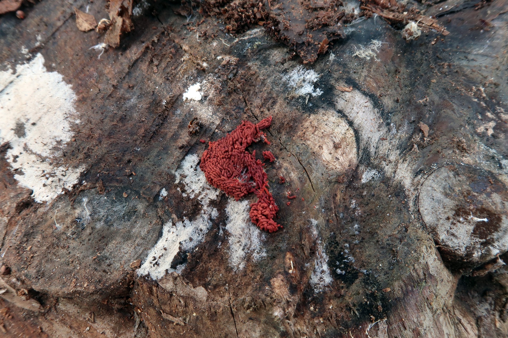 Pequeñas fructificaciones muy agrupadas, color marrón rojizo con plasmodium blanco.