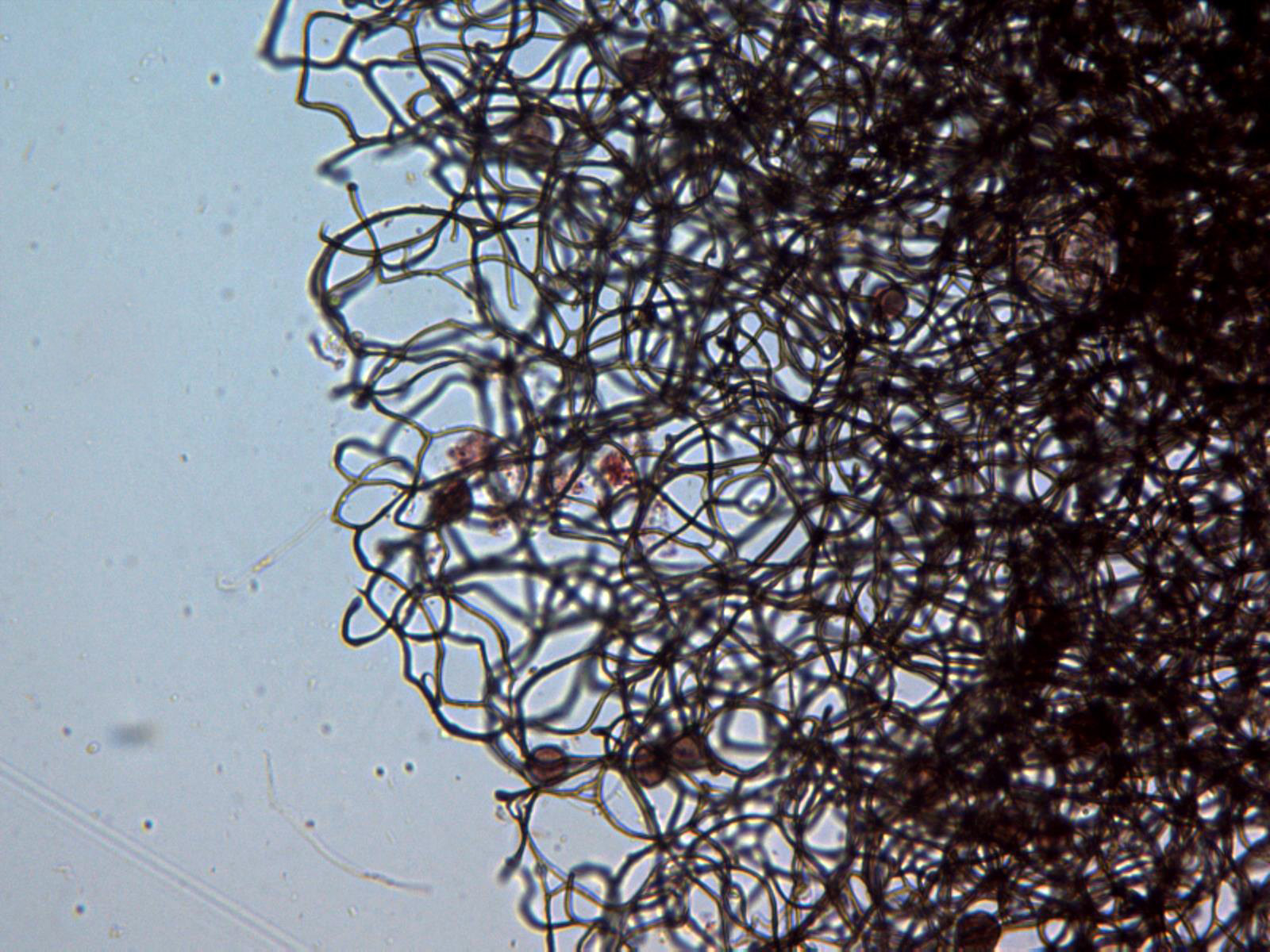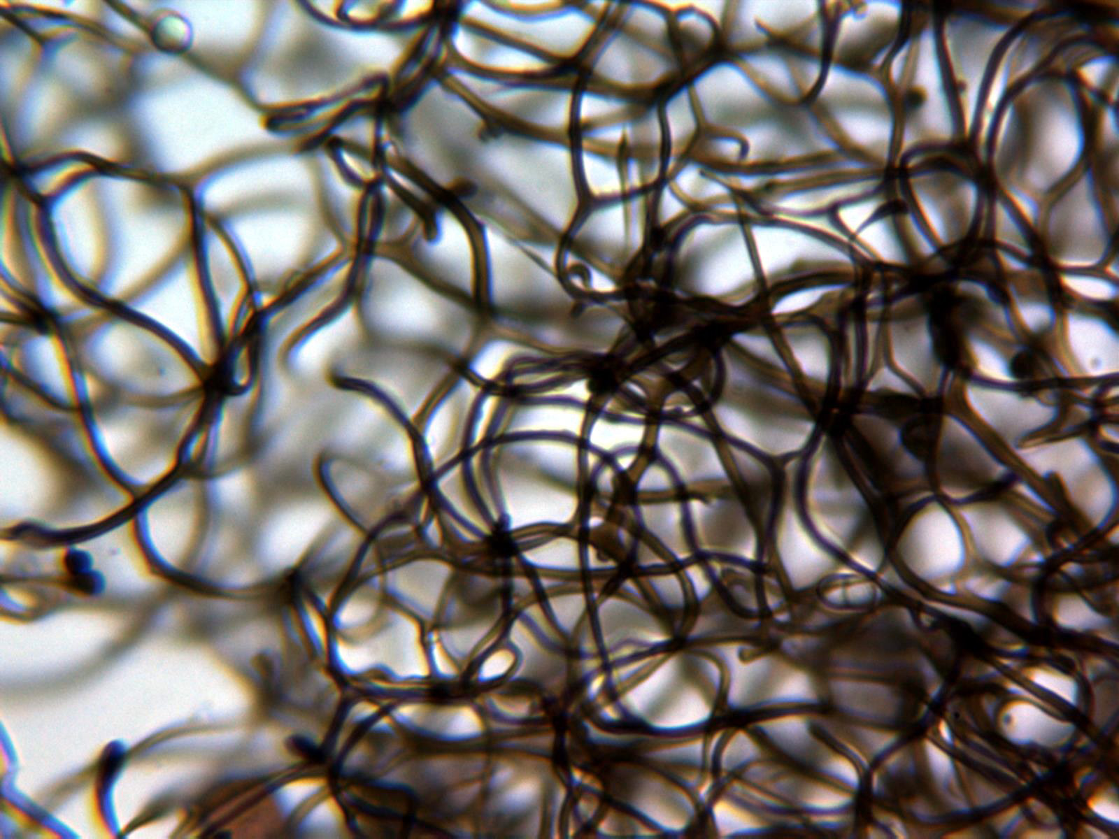Capilicio a 1000 aumentos, capilicio formado por una densa red de mallas de color marrón y muy poca anchura, con algunos extremos libres a modo de púas.