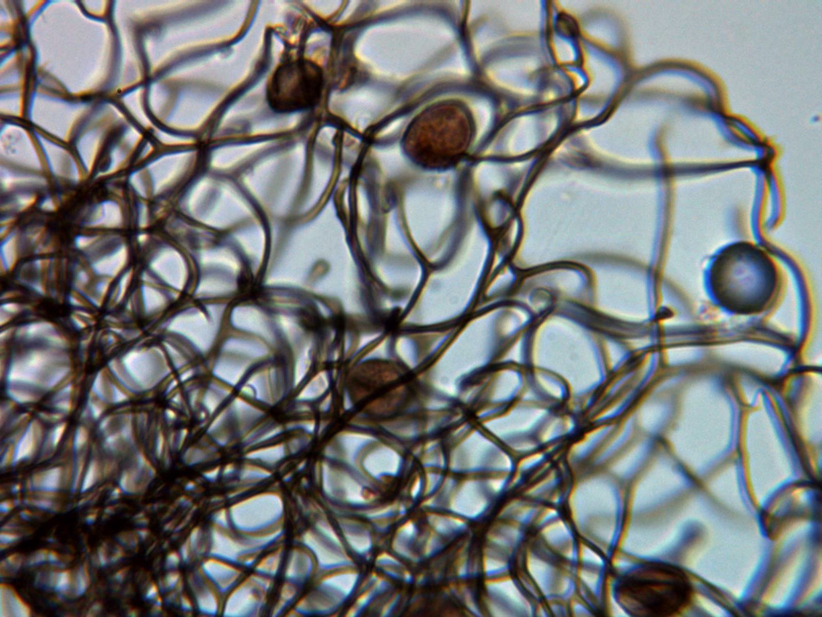 Muy pequeños apotecios, de tan solo unos pocos milímetros de altura con forma globosa y con un largo pié tan fino como un pelo y de color negro.