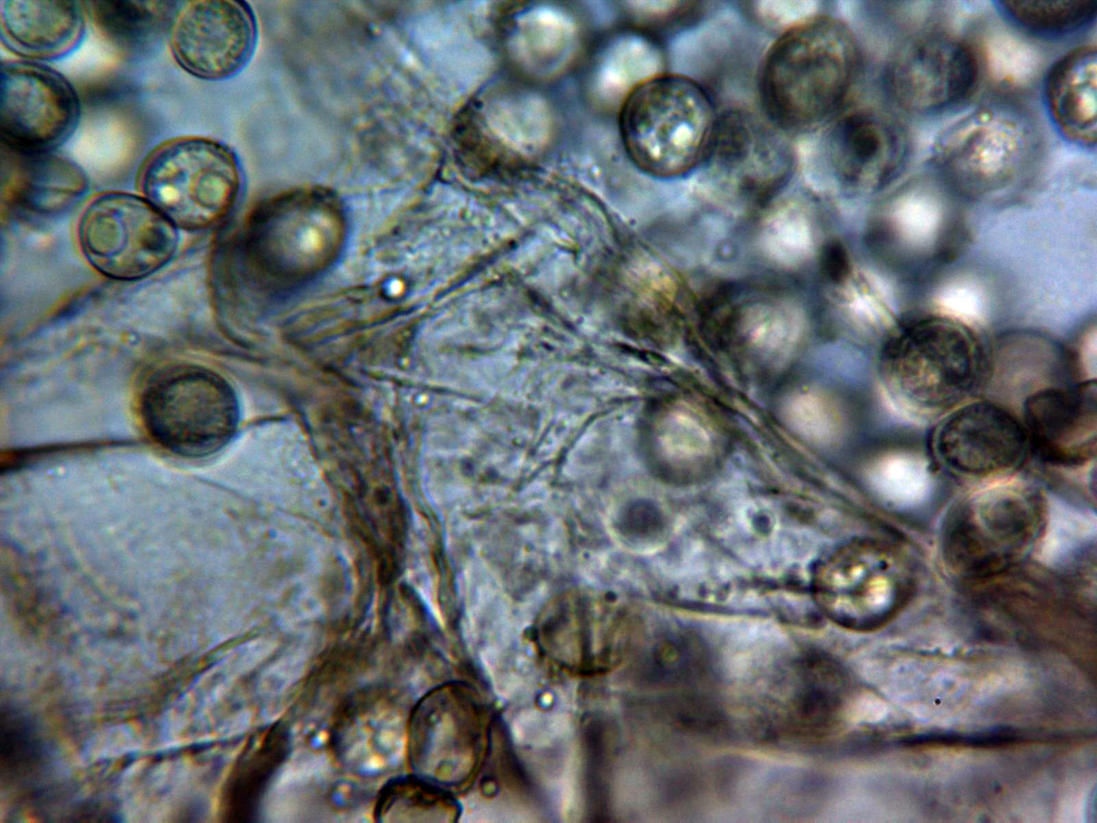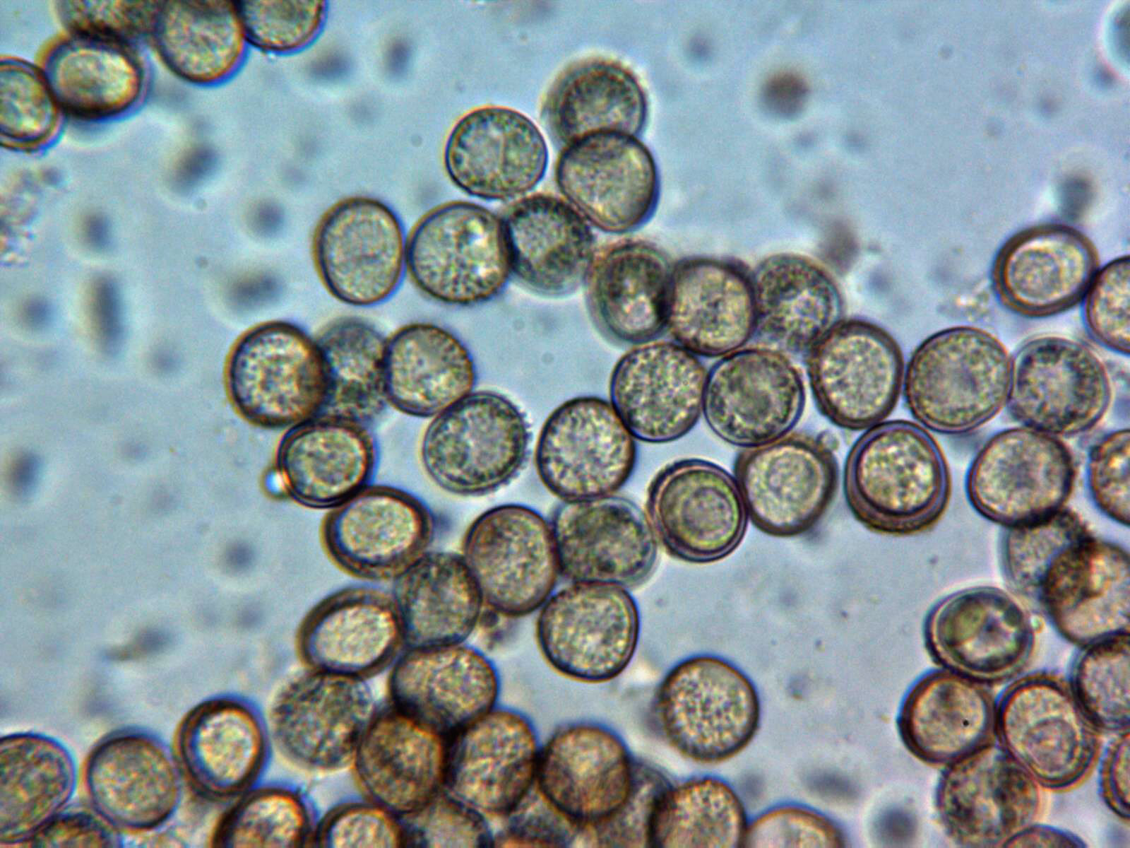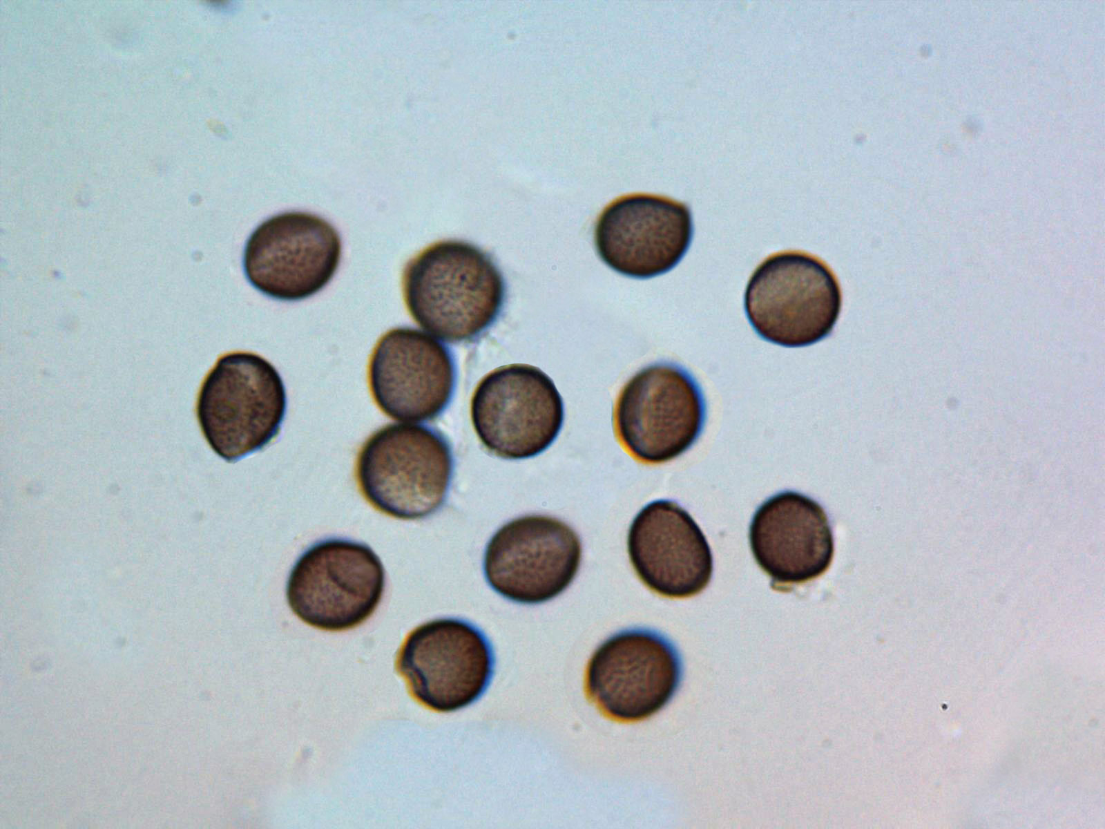 Esporas globosas, de color ocráceo, según el plano obtenido parecen de pared gruesa y con muy finas y abundantes espinas en su superficie, en mis mediciones de entre 9,8 a 12,5 micras.