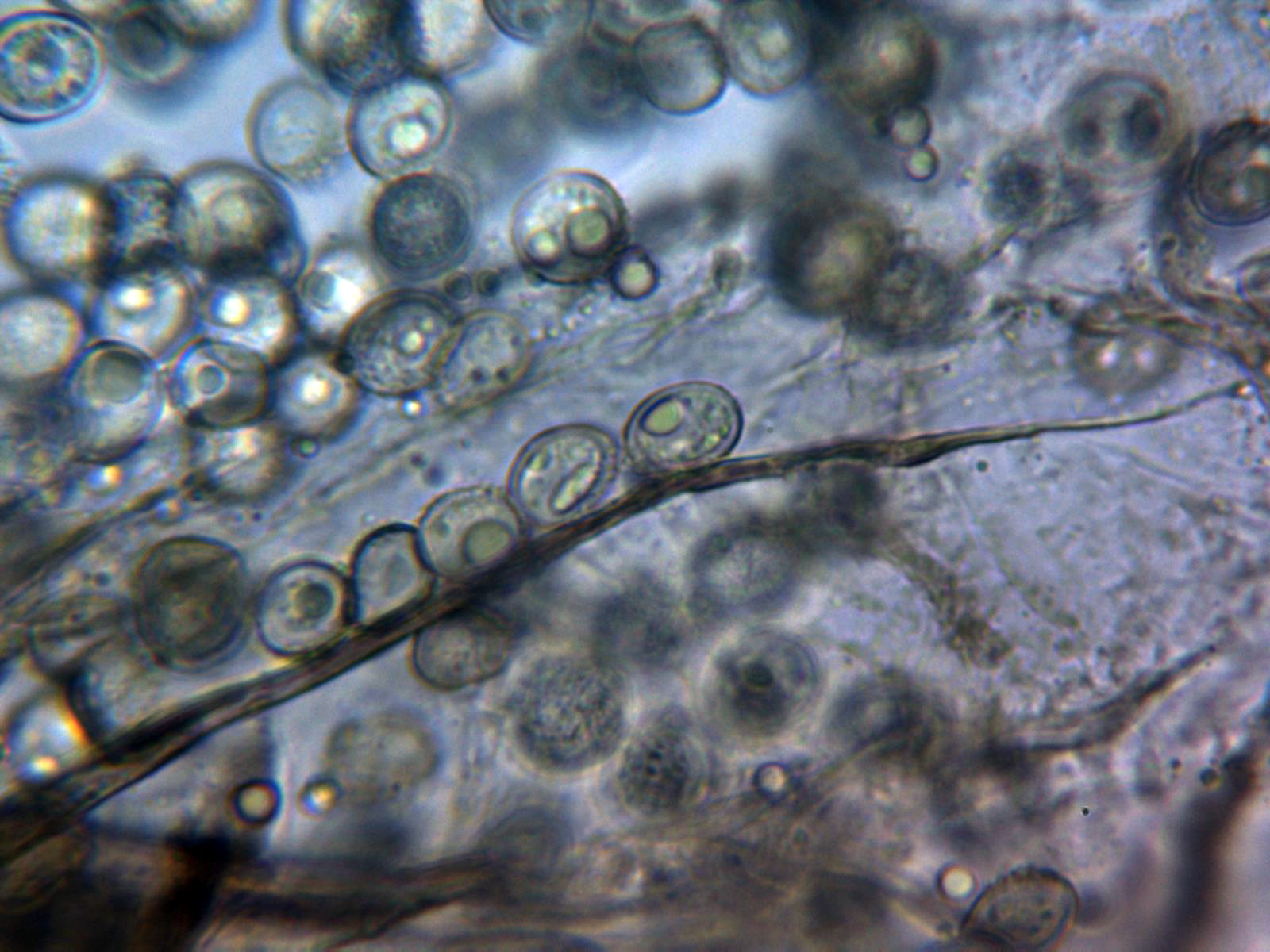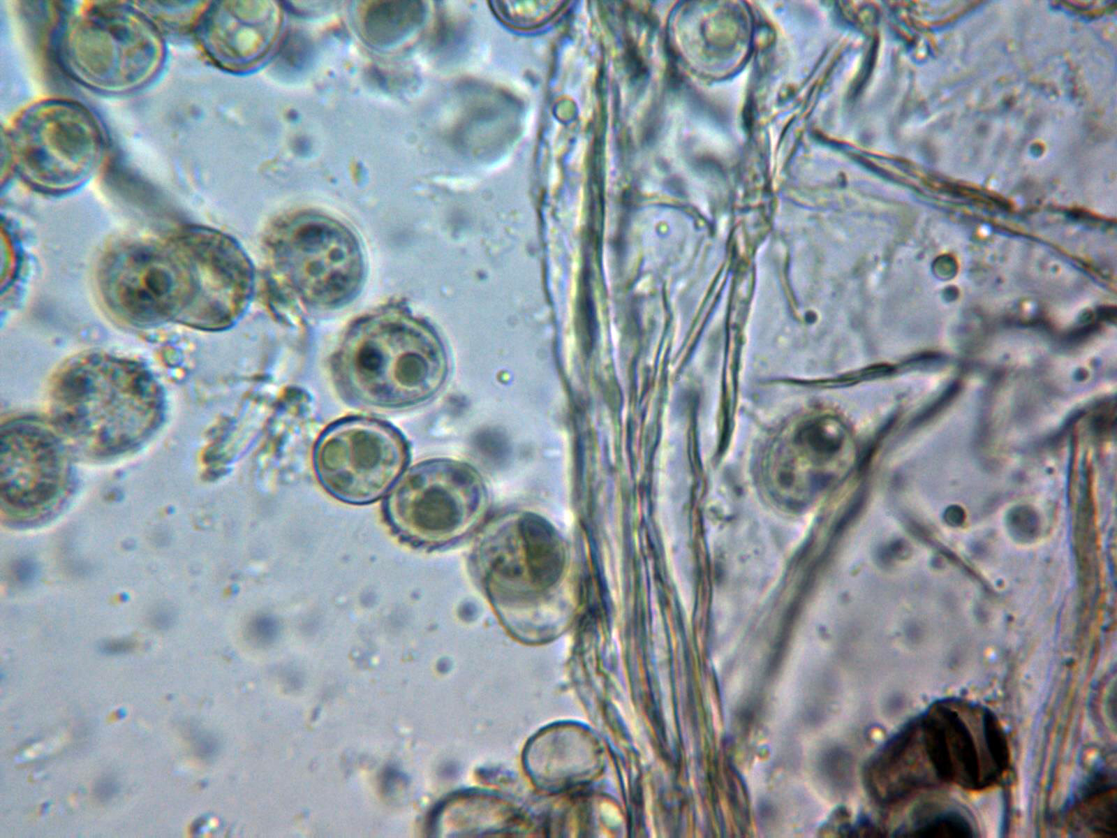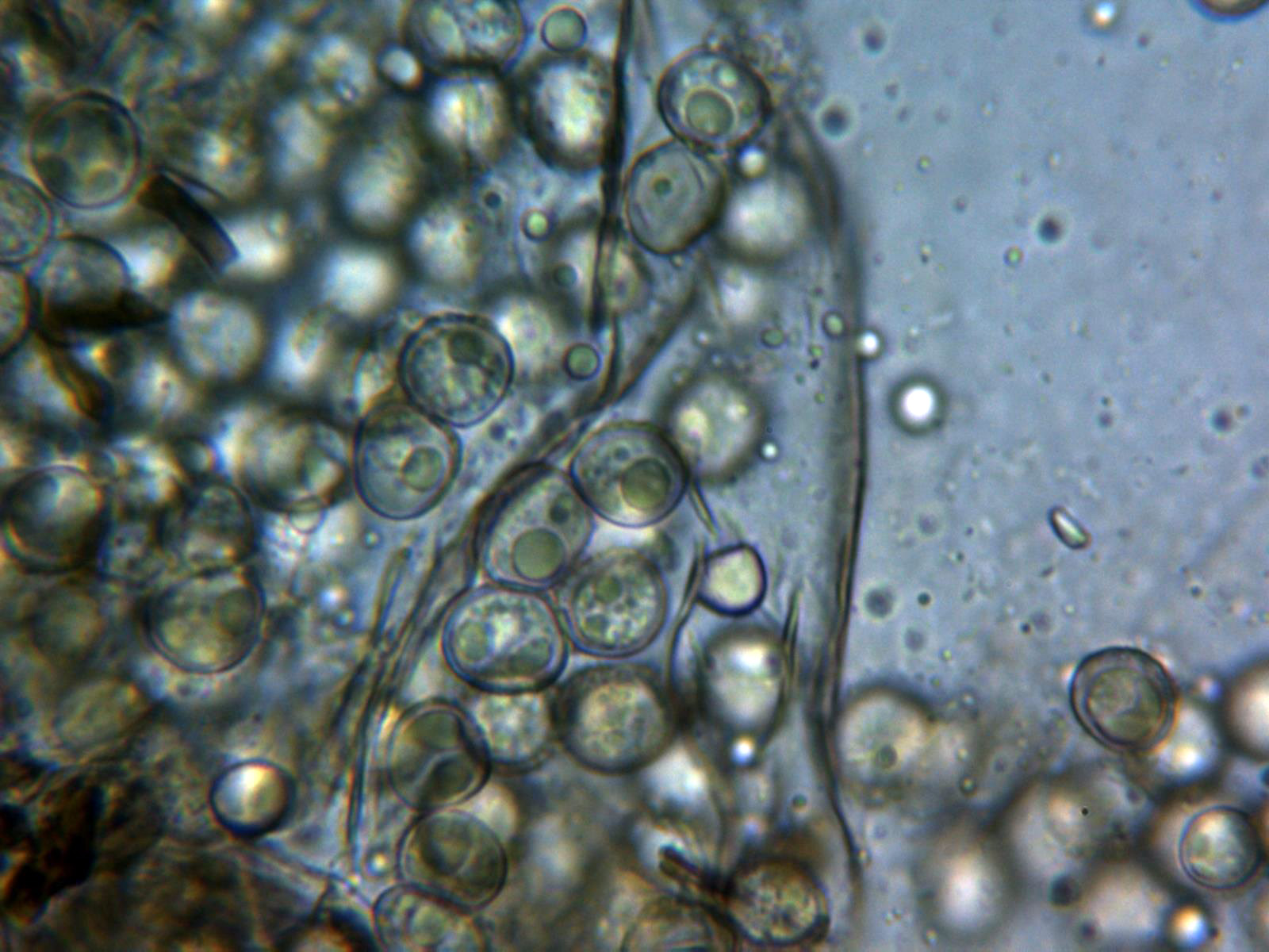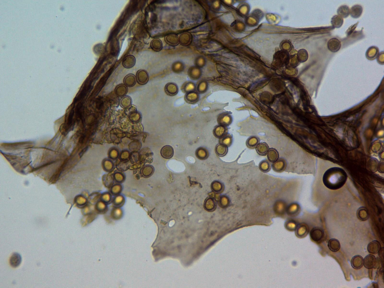 Esporas globosas, de color ocráceo, según el plano obtenido parecen de pared gruesa y con muy finas y abundantes espinas en su superficie, en mis mediciones de entre 9,8 a 12,5 micras.