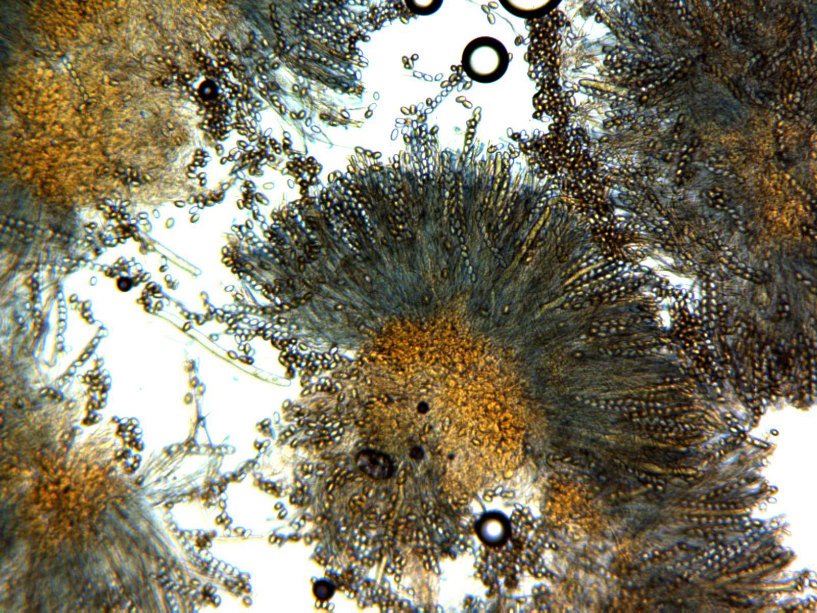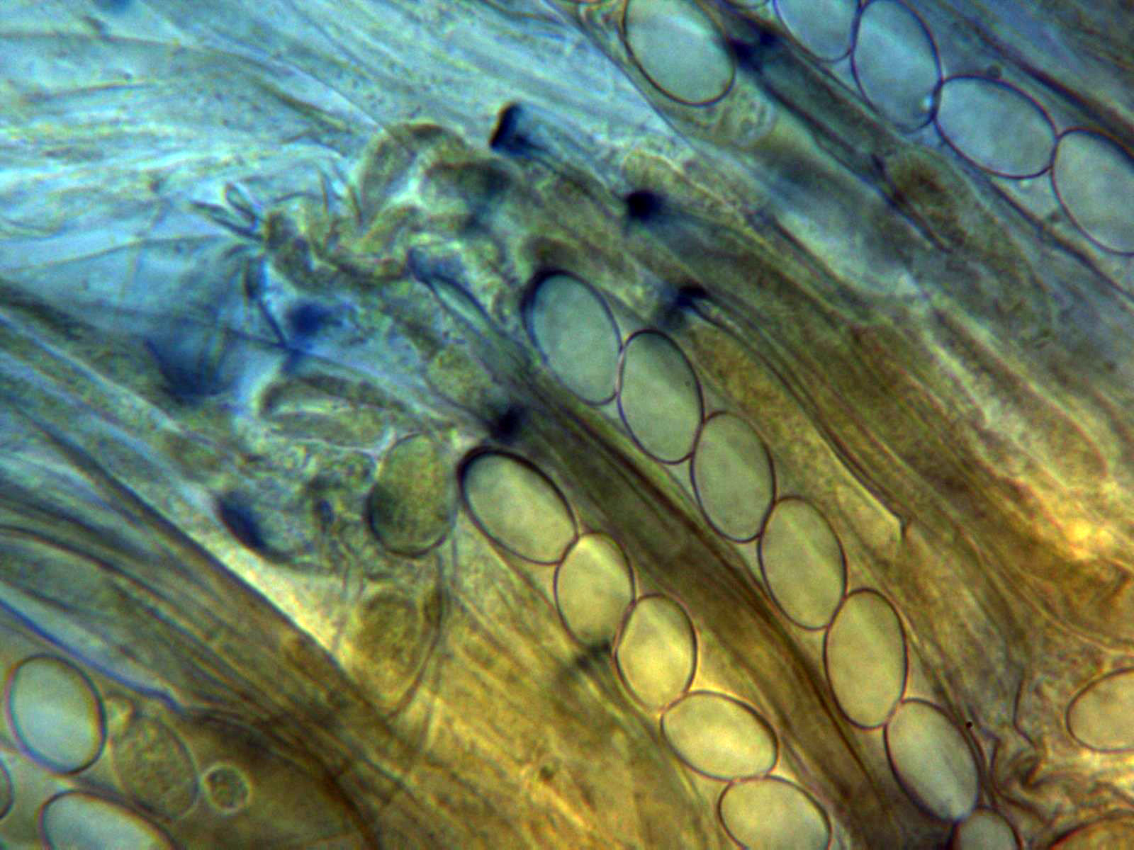 Ascas en reactivo de Melzer, que se tiñen de azul por la presencia de almidón en las mismas.
