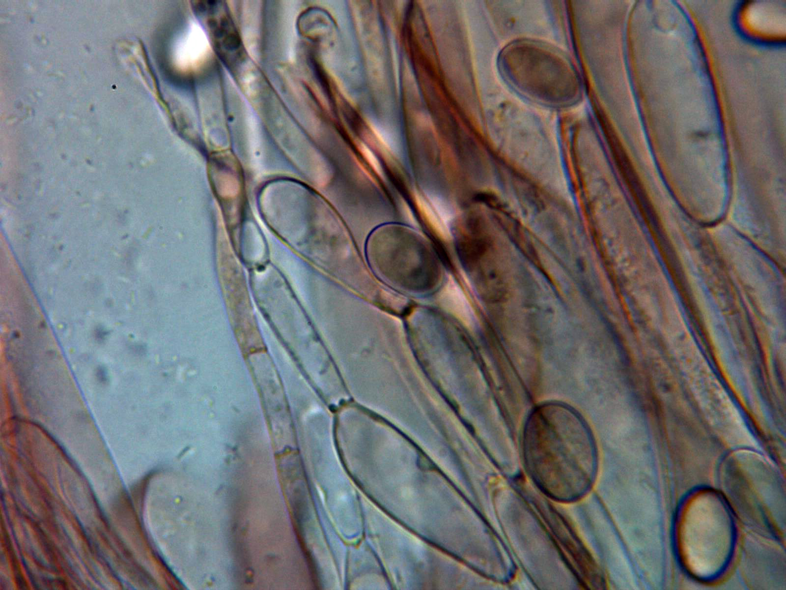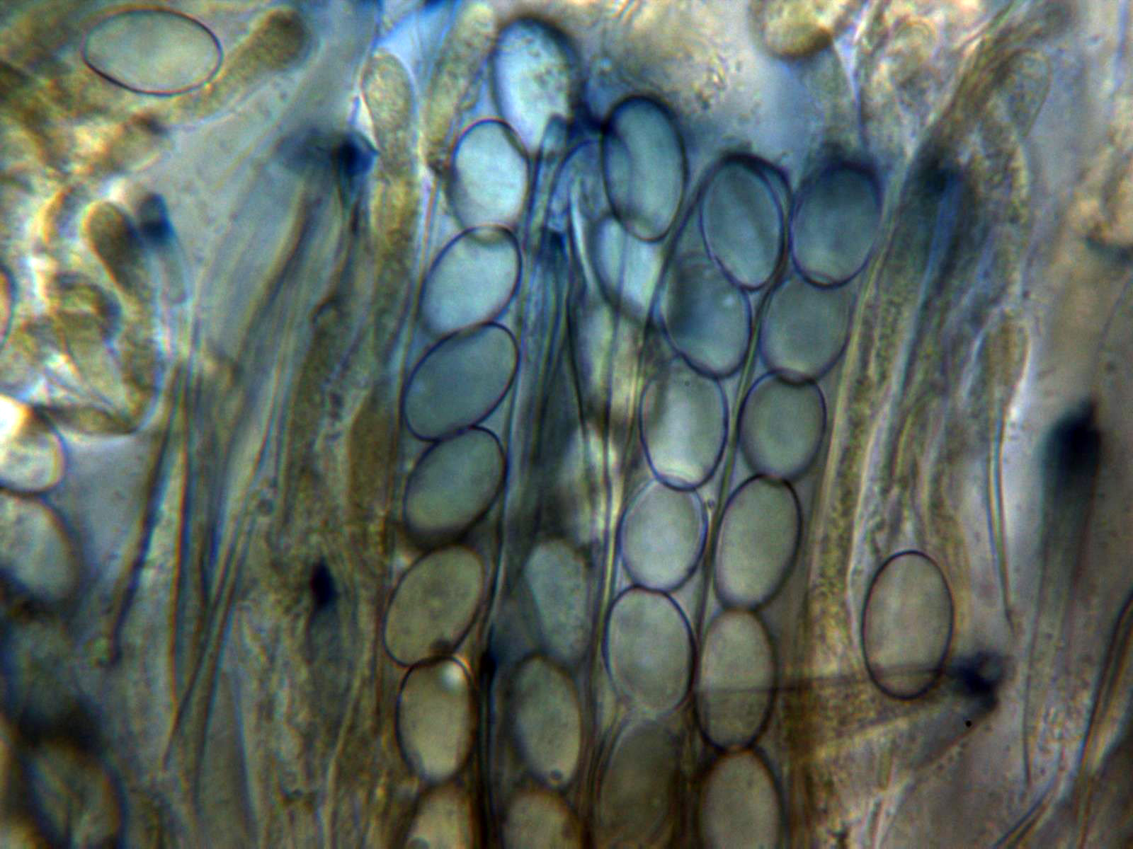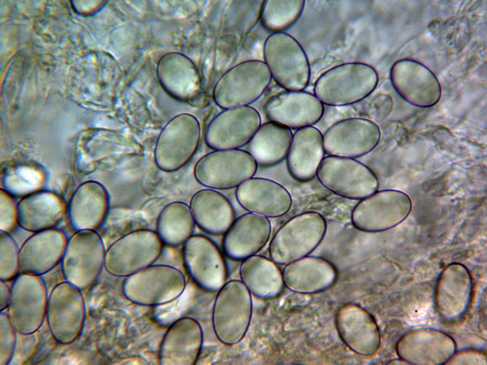 Esporas hialinas, elipsoidales y sin contenido en su interior, en mis mediciones de (13,6) 15,1;16 X 9,2;9,7 micras.