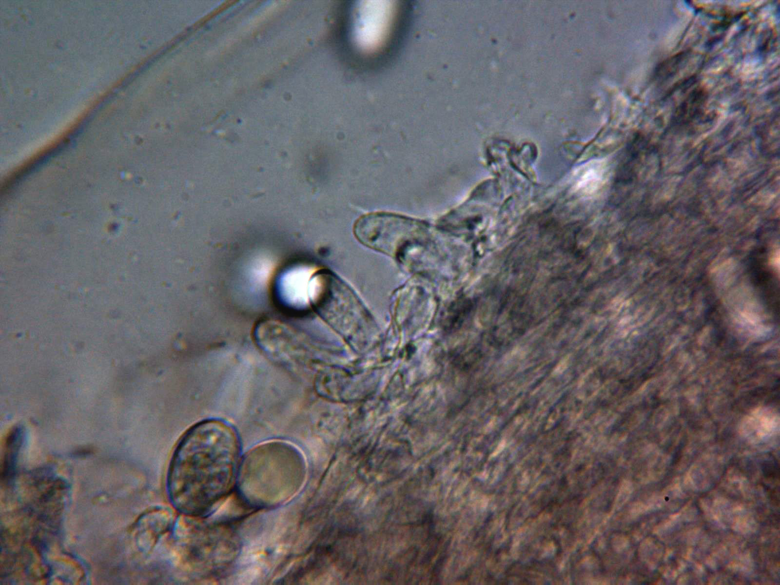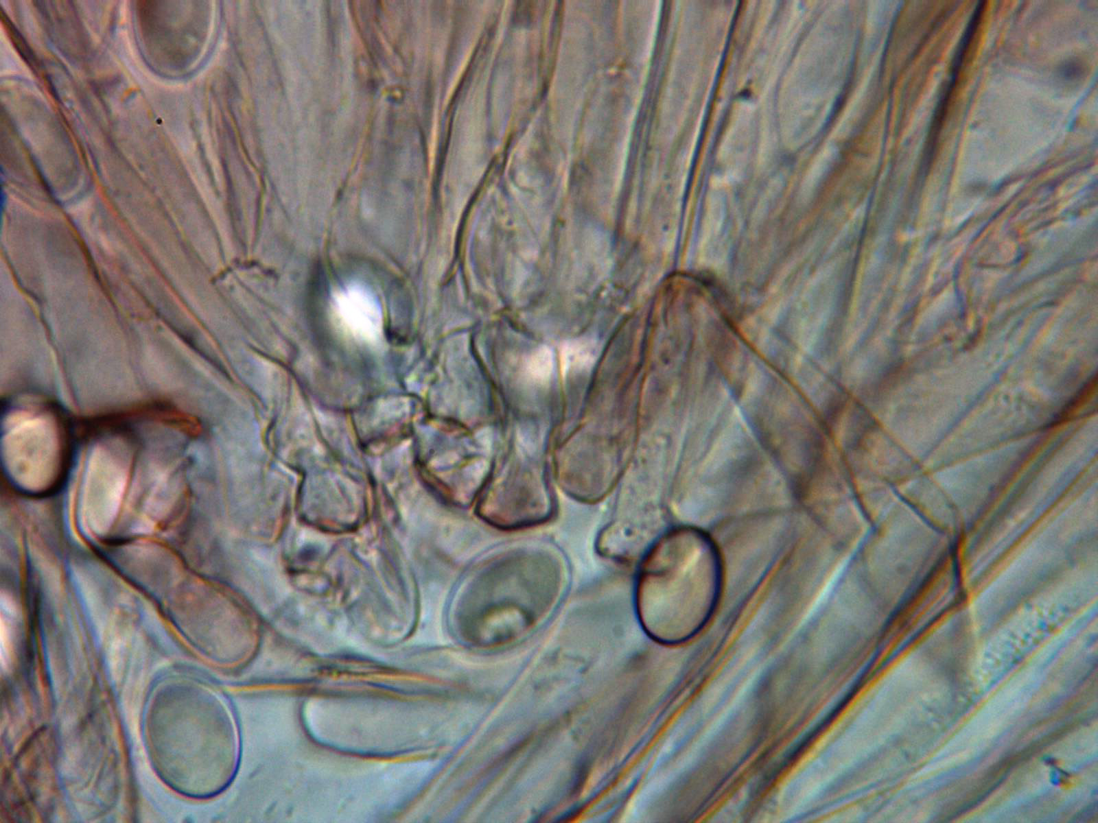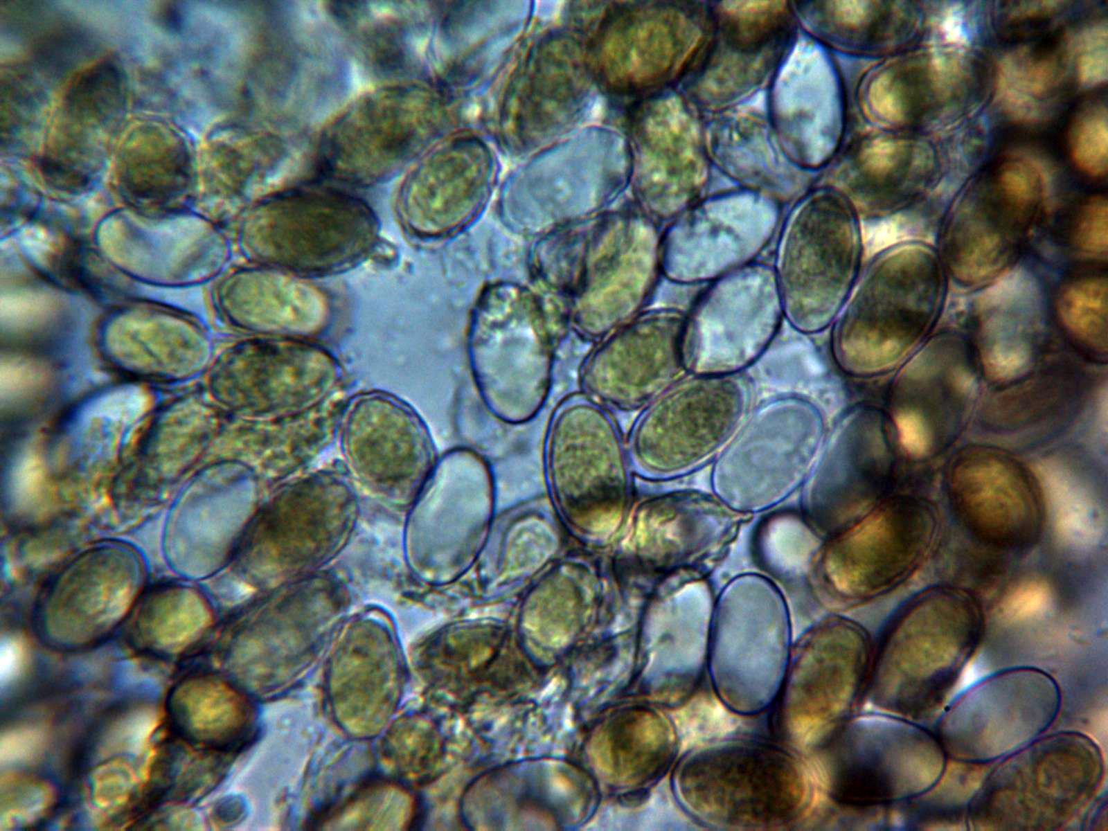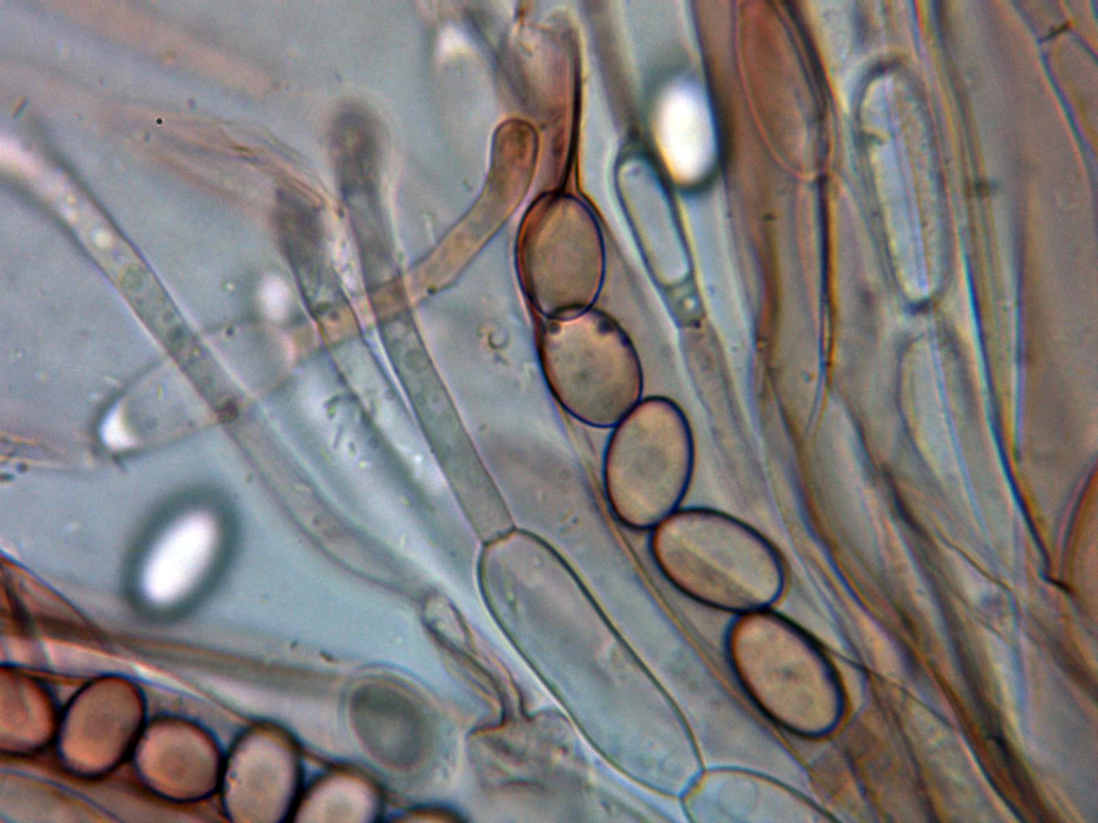 Esporas hialinas, elipsoidales y sin contenido en su interior, en mis mediciones de (13,6) 15,1;16 X 9,2;9,7 micras.