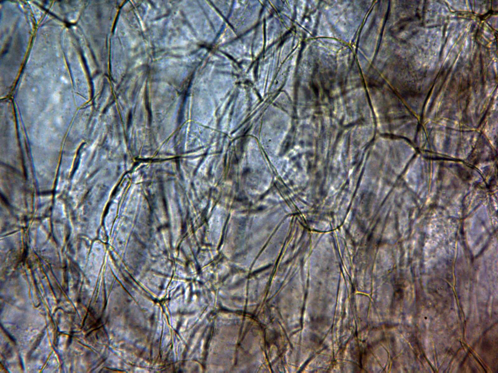 Por debajo de la anterior, nos encontramos con una capa fina de hifas estrechas y filamentosas, enredadas y entrelazadas entre sí.