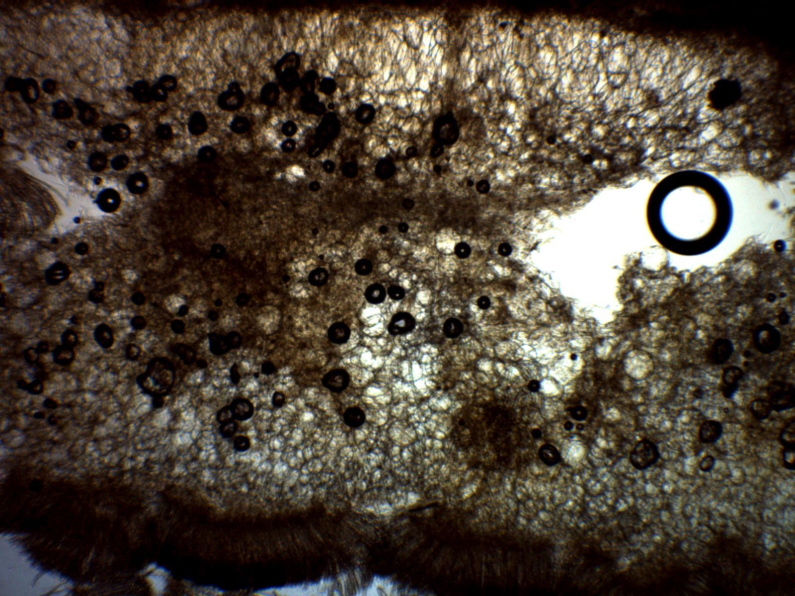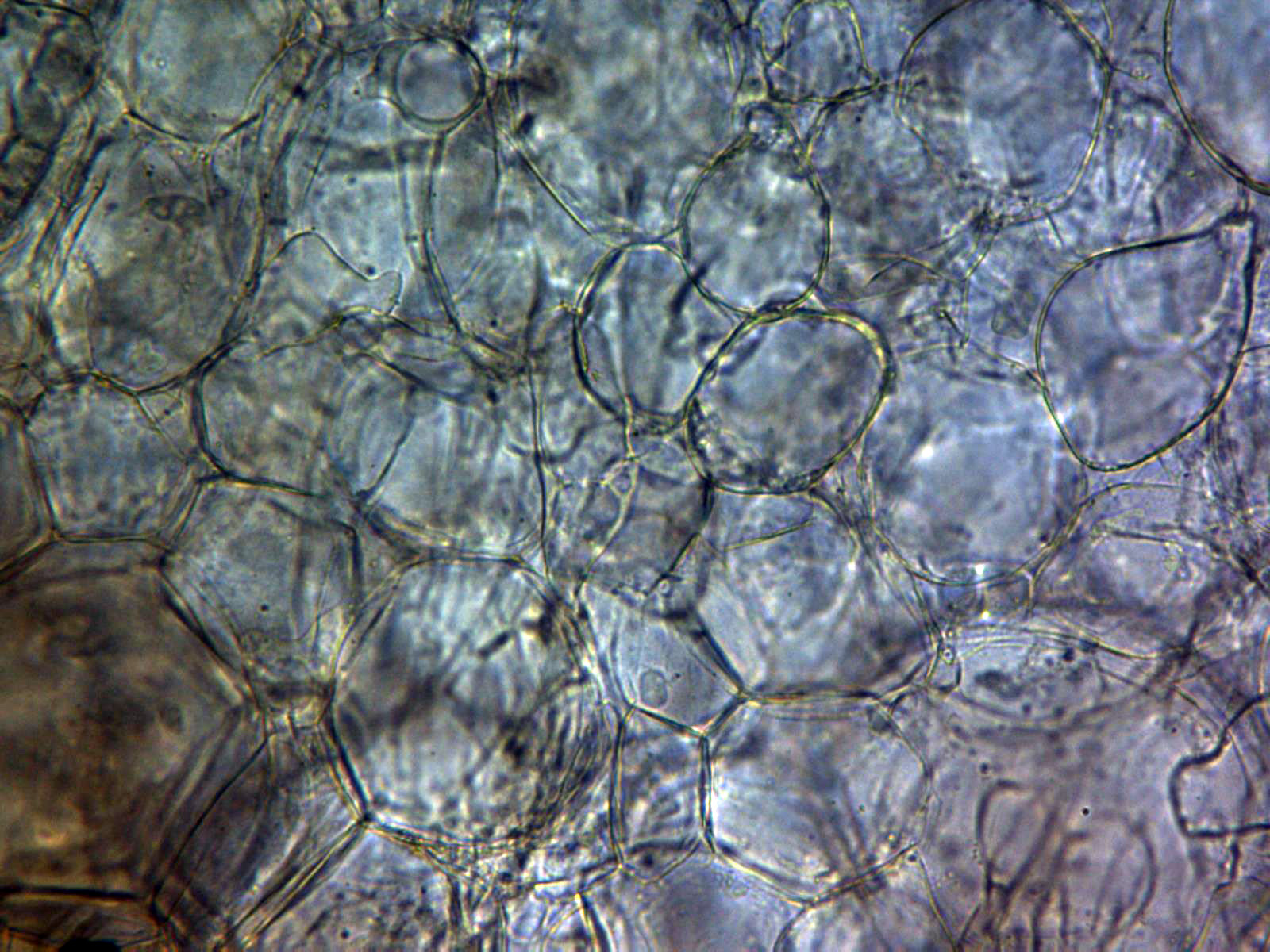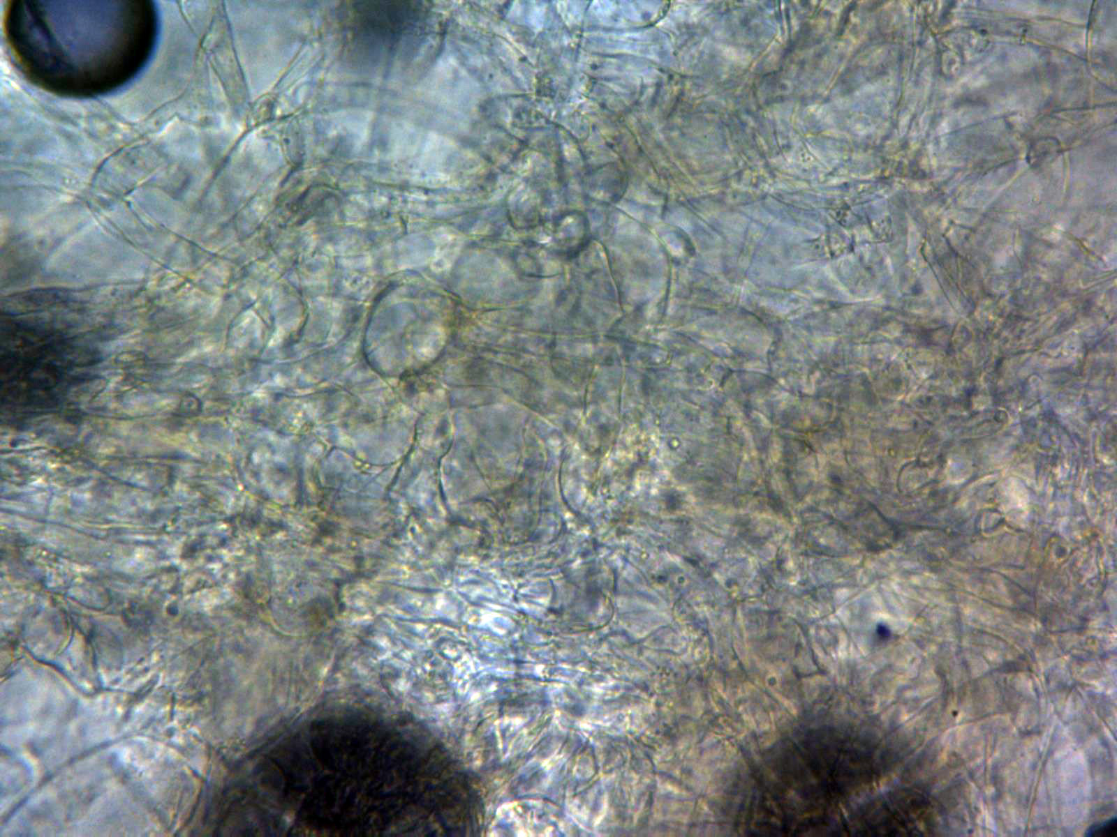 Debajo de la anterior de nuevo unas hifas de grandes dimensiones, entre globosas y algo angulares, de aspecto celulósico.