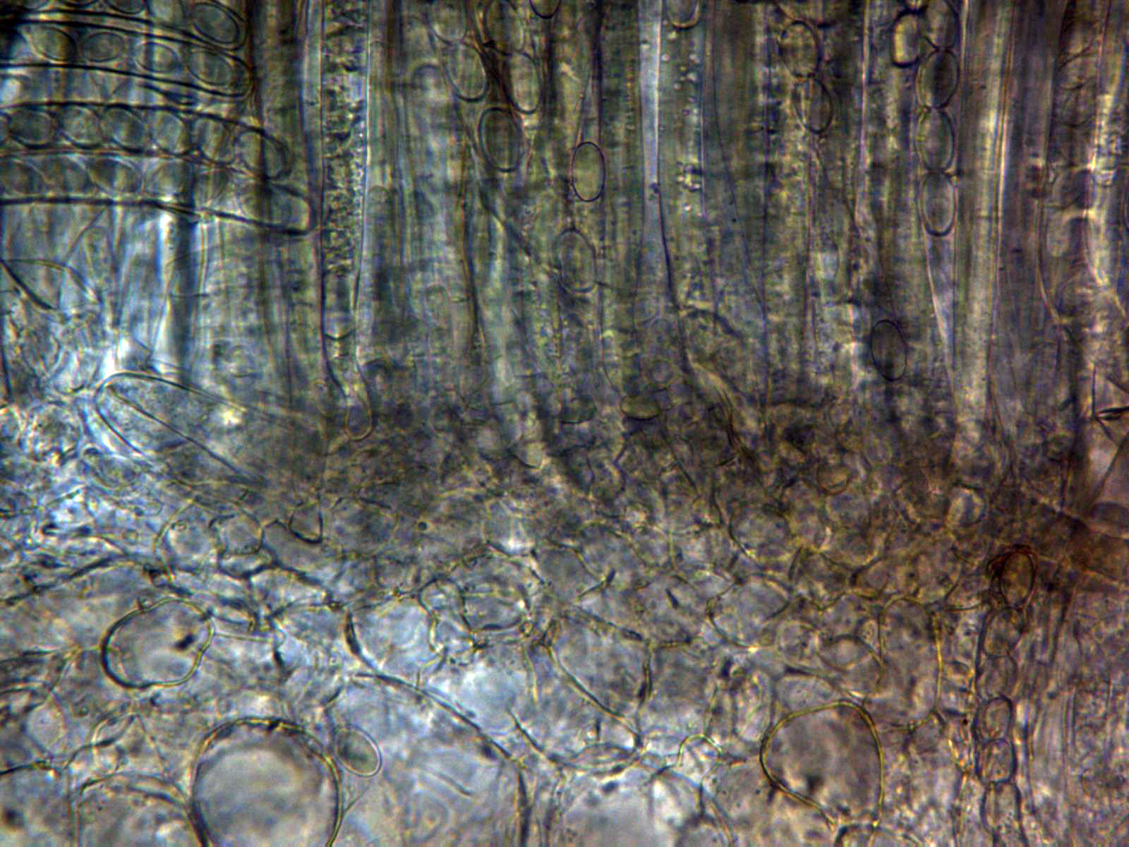 Por debajo de la primera, está la segunda capa, con hifas de grandes dimensiones, entre elipsoidales y angulares y de paredes muy finas.