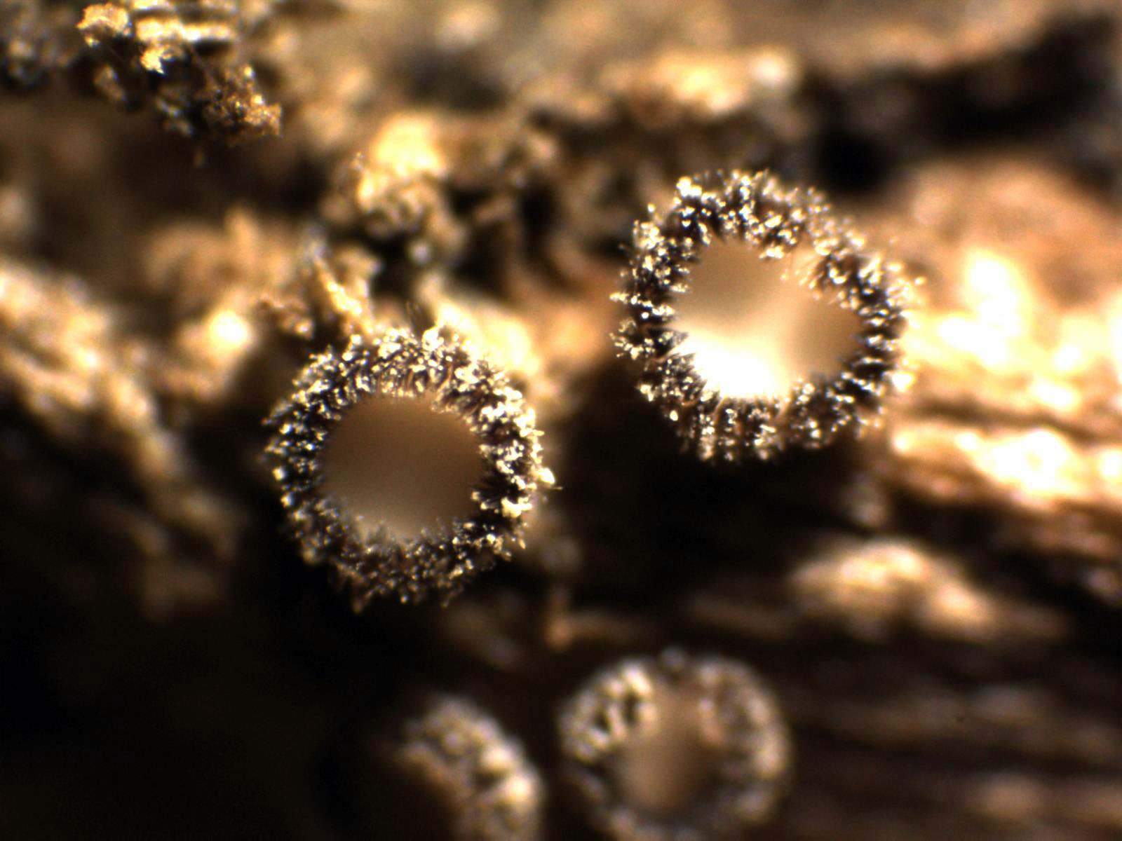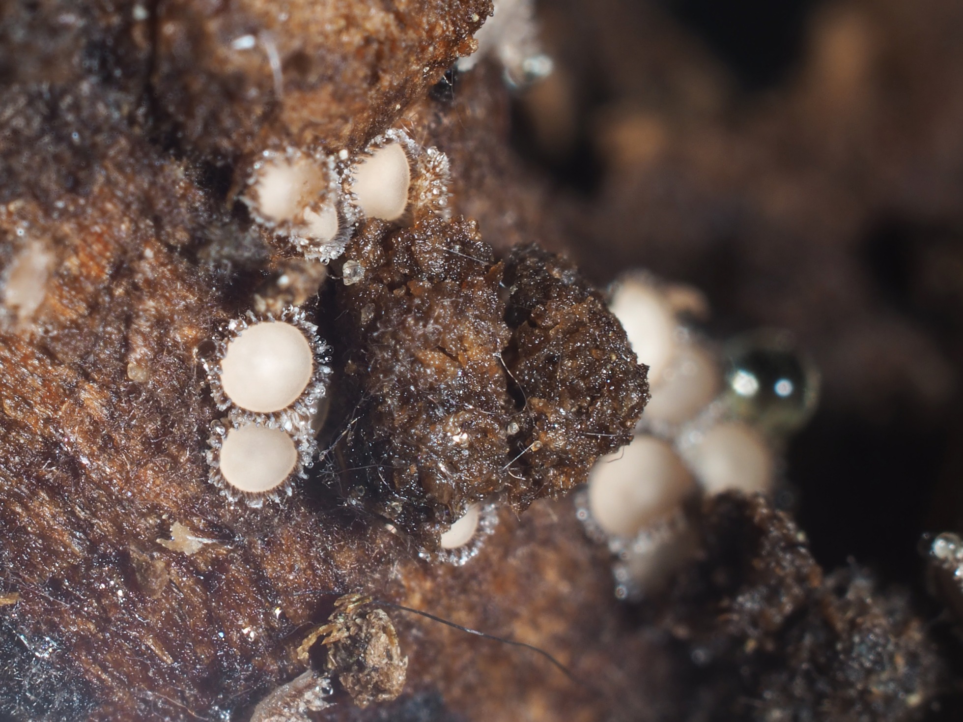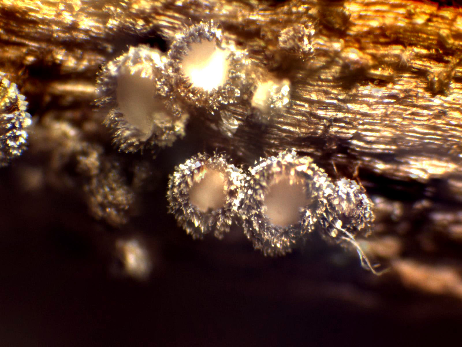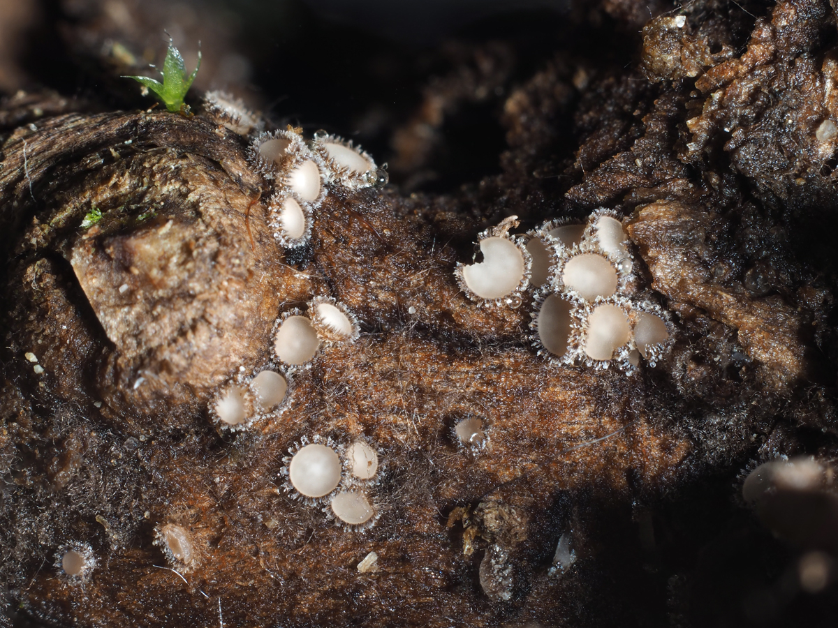 Apotecios de muy pequeño tamaño, entre 0,5 y 0,7 mm., con forma de taza y superficie exterior pilosa, de color gis crema y con el interior de los mismos mas claro y blanquecino.