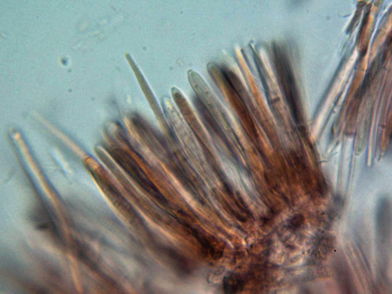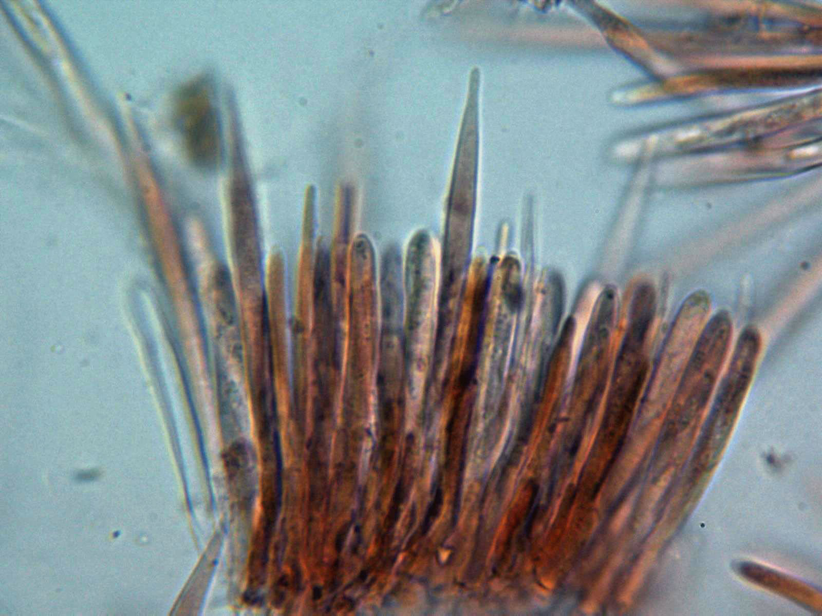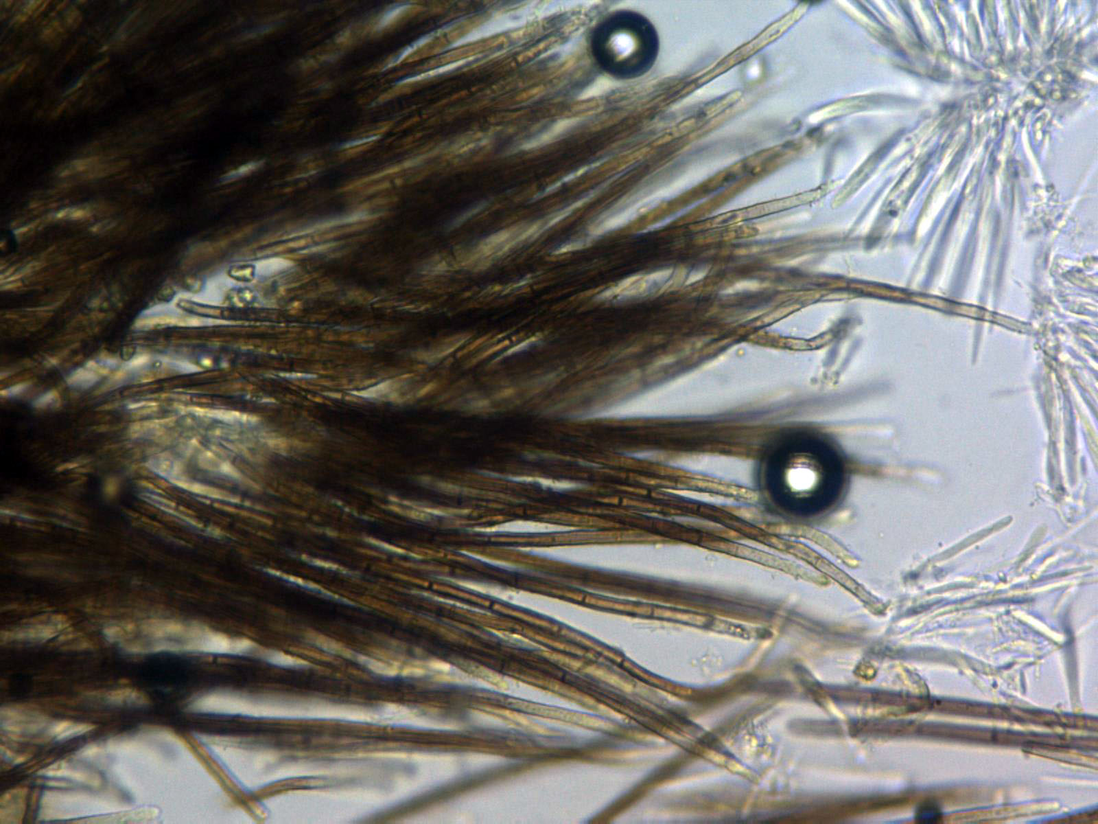 Aconsejo usar agua corriente en las micros de ascomycetes para no variar el color natural de los pelos y otras estructuras y solo utilizarlos para testar reacciones como la amiloide o hemiamiloide (IKI) o pigmentos (KOH), a veces para comprobar, si son o no uncinuladas.