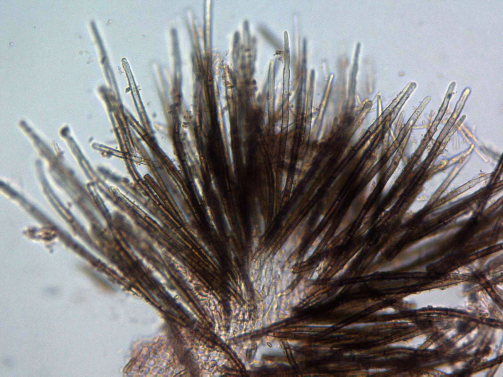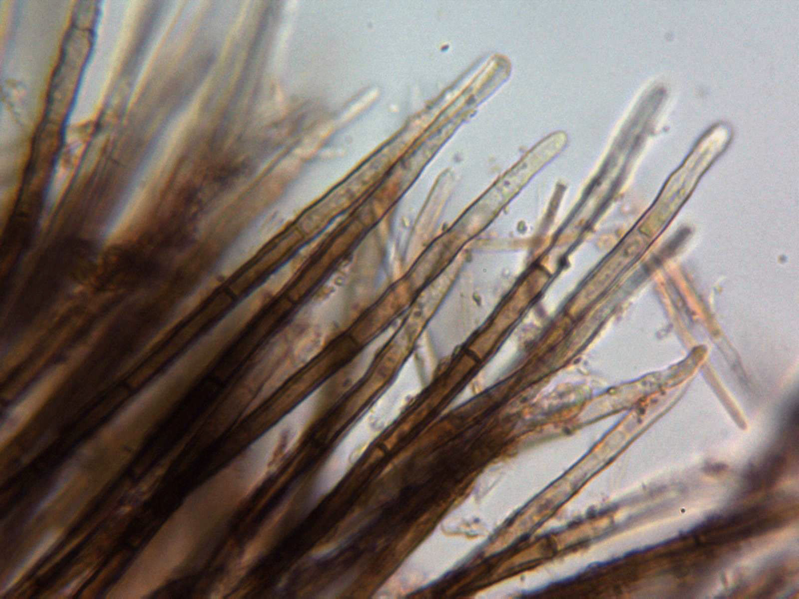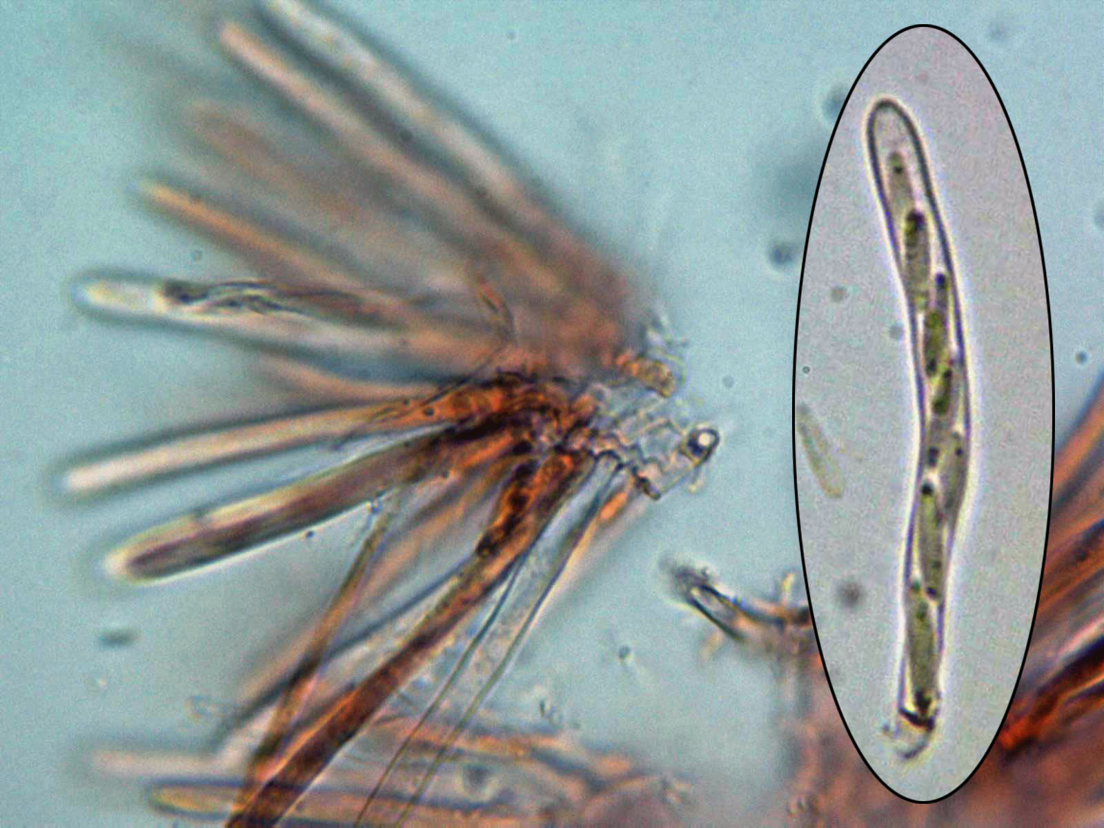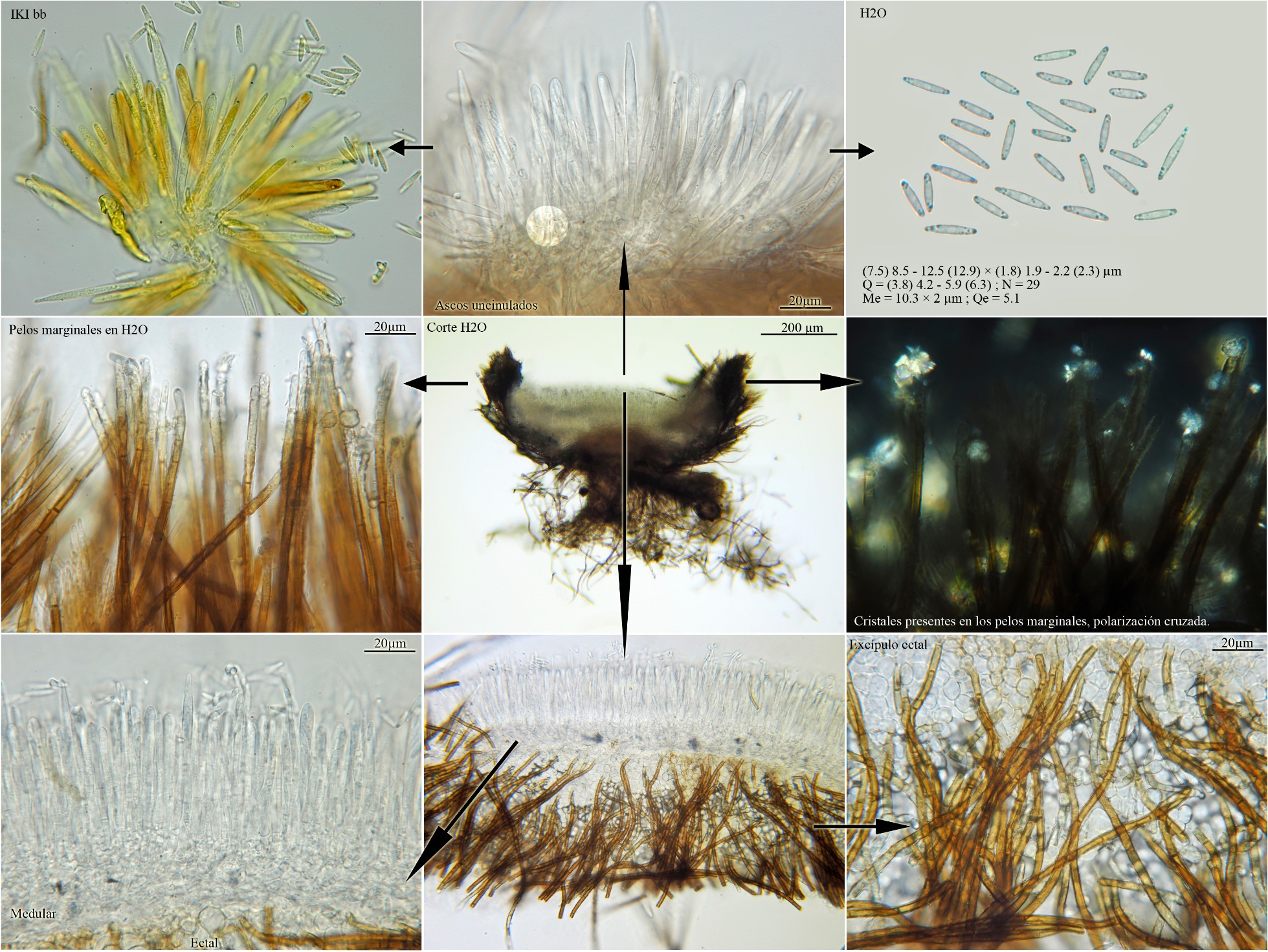 Aconsejo usar agua corriente en las micros de ascomycetes para no variar el color natural de los pelos y otras estructuras y solo utilizarlos para testar reacciones como la amiloide o hemiamiloide (IKI) o pigmentos (KOH), a veces para comprobar, si son o no uncinuladas.