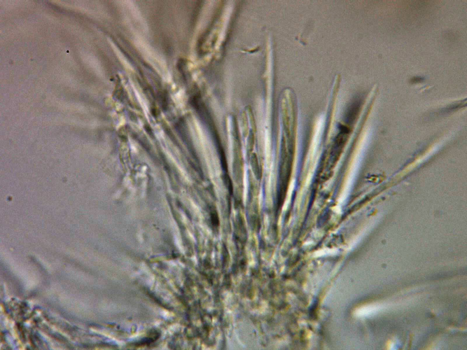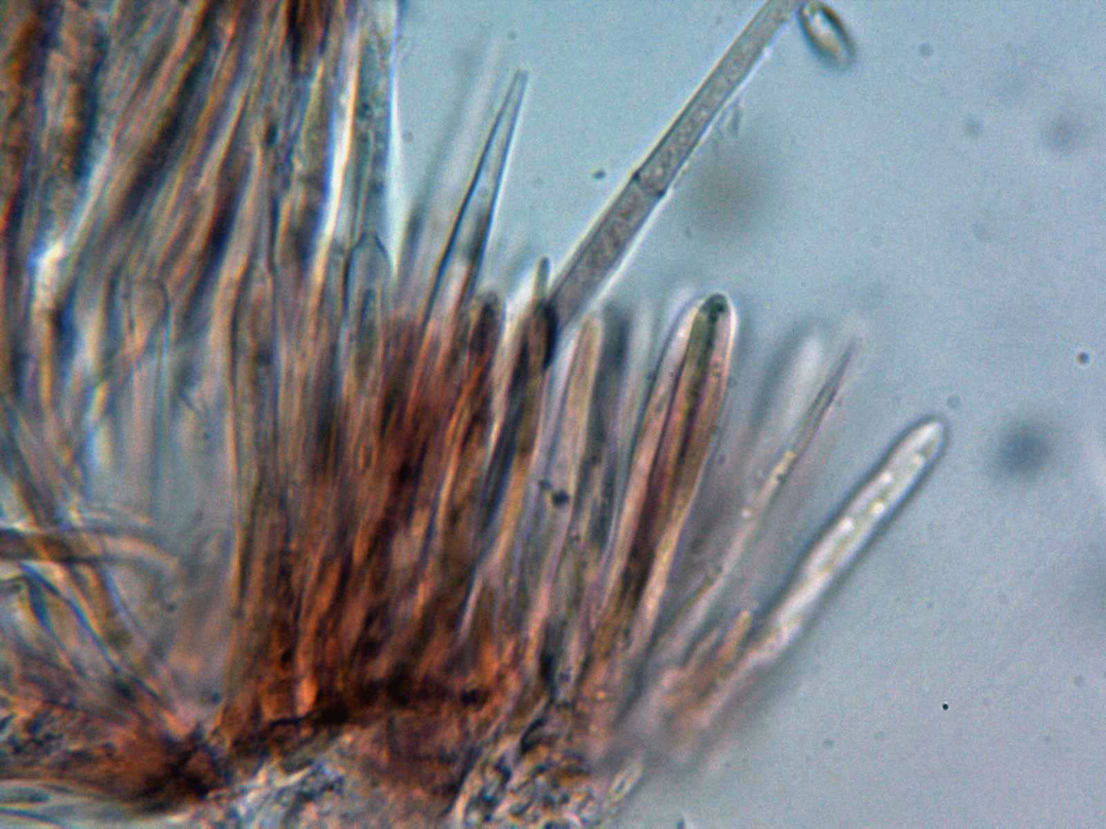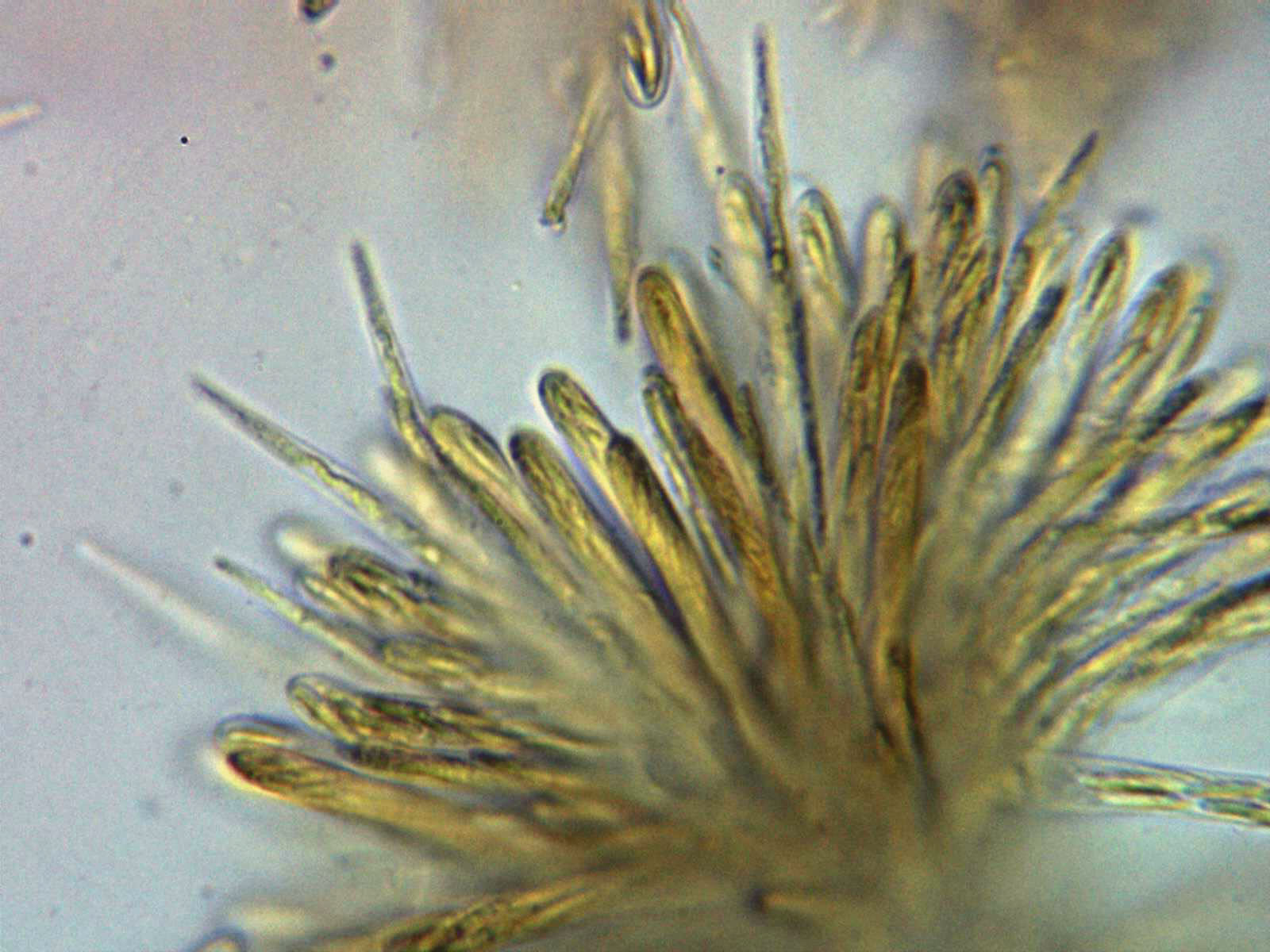 Paráfisis lanceoladas y sobresaliendo considerablemente por encima del nivel de las ascas.