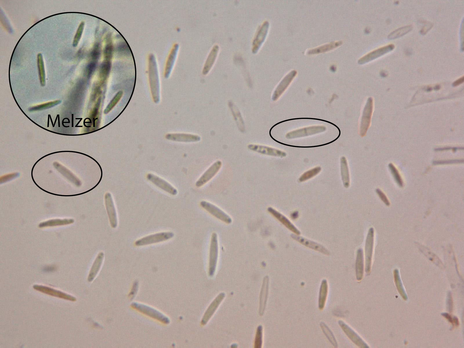 Esporas cilíndricas, alargadas, hialinas, mayoritariamente con dos gútulas, una en cada extremo (miniatura izquierda de la imagen), también se observa en las muestras alguna espora con un septo (miniatura derecha de la imagen). Inamiloides al Melzer.
