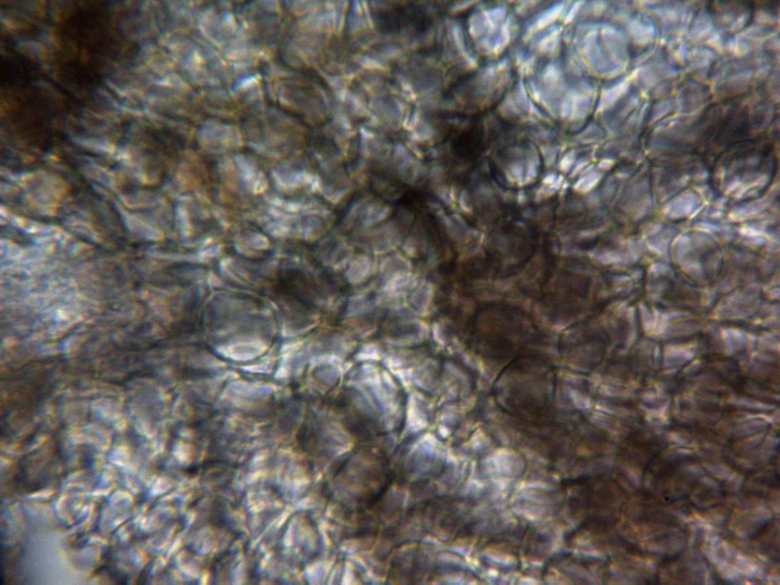 Excípulo a 1000 aumentos, con hifas asimismo entre globosas, piriformes y angulares.