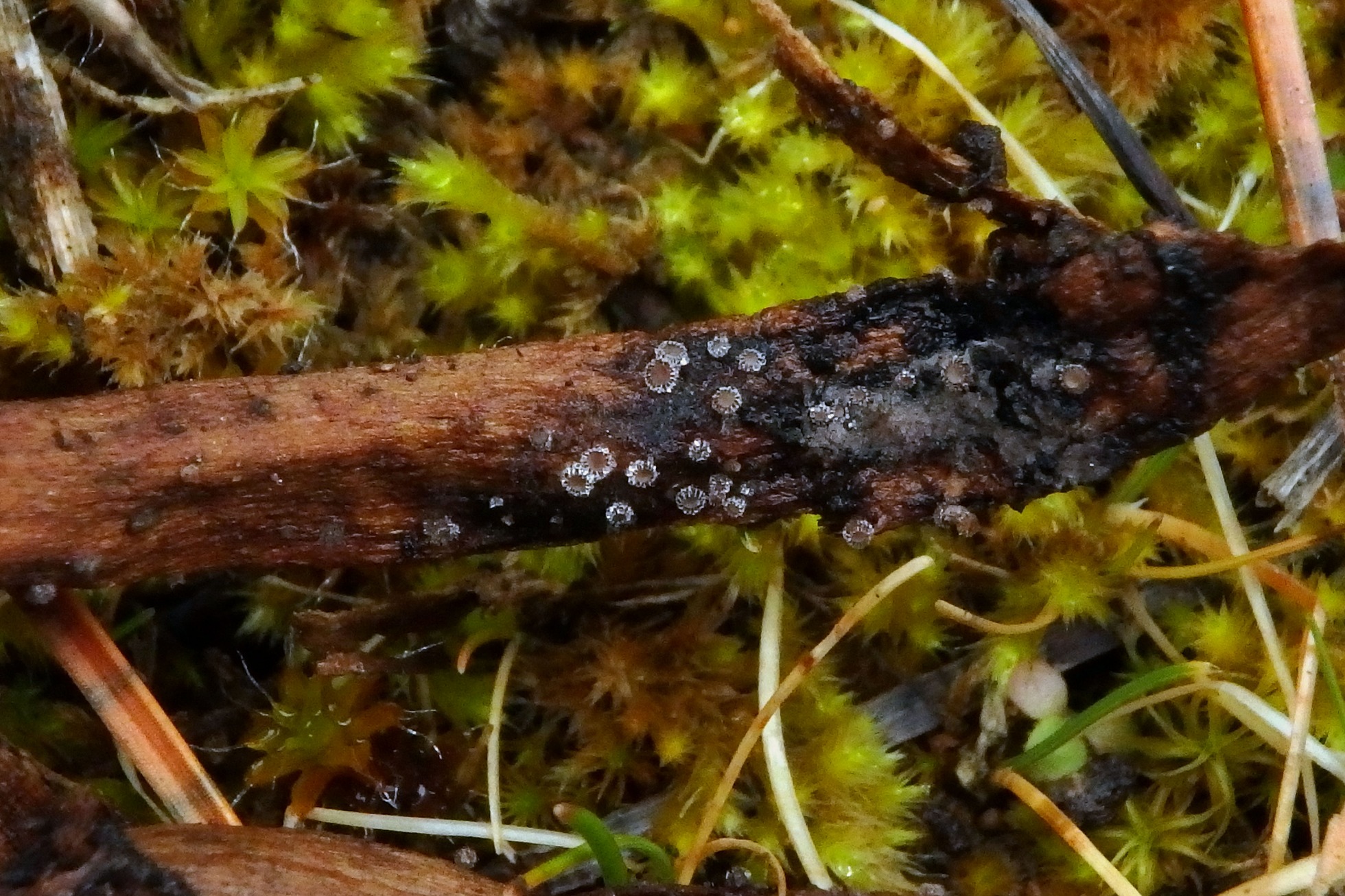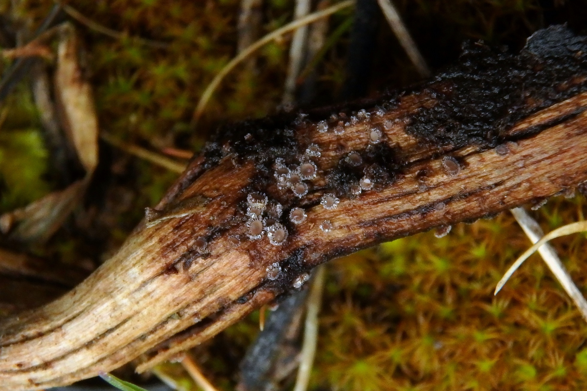 Pequeños apotecios brotando sobre restos de "Asparagus officinalis", lo que conocemos como "espárragos", estos restos procedentes de un campo de cultivo anexo y que los habían depositado ahí.