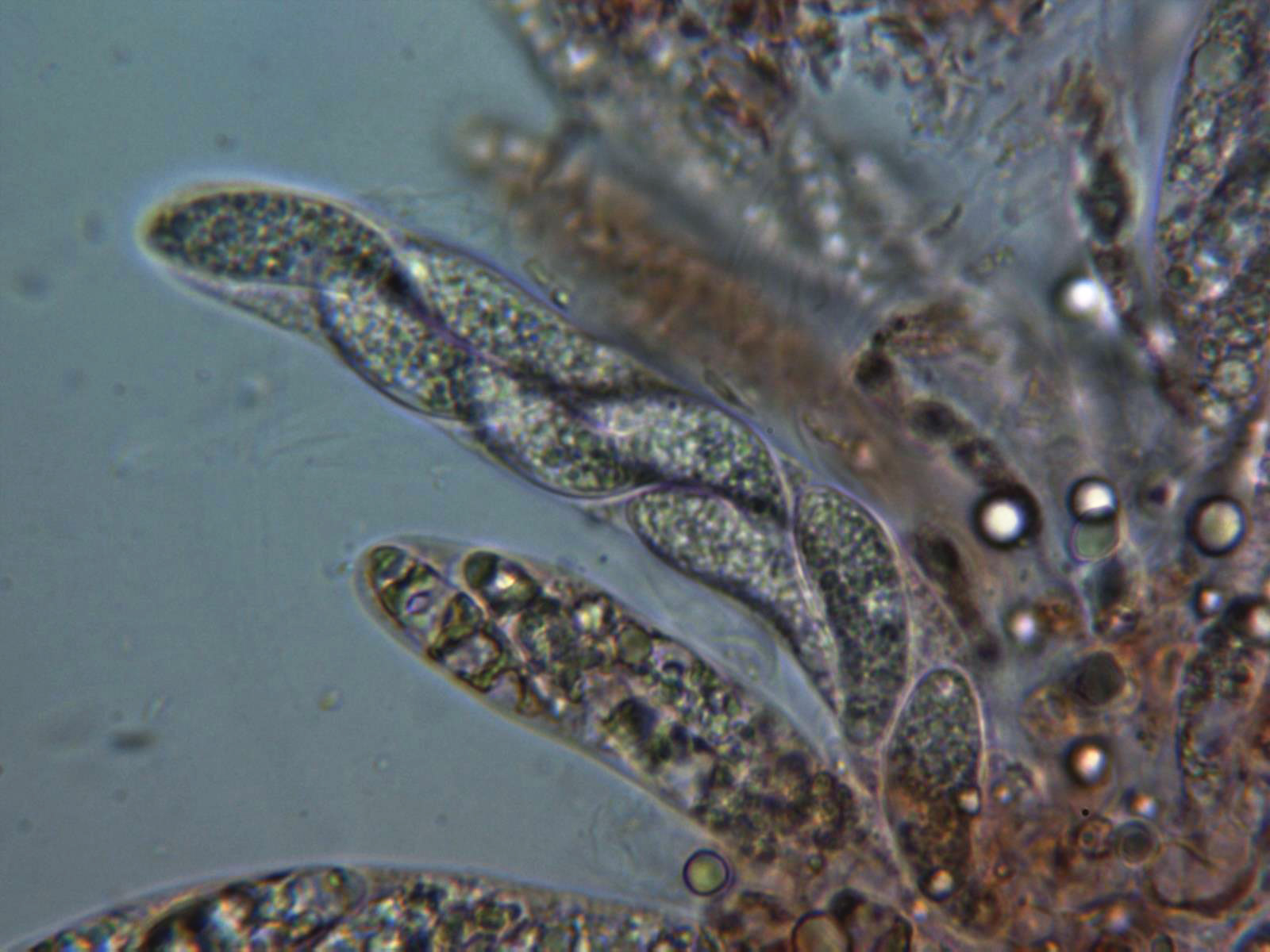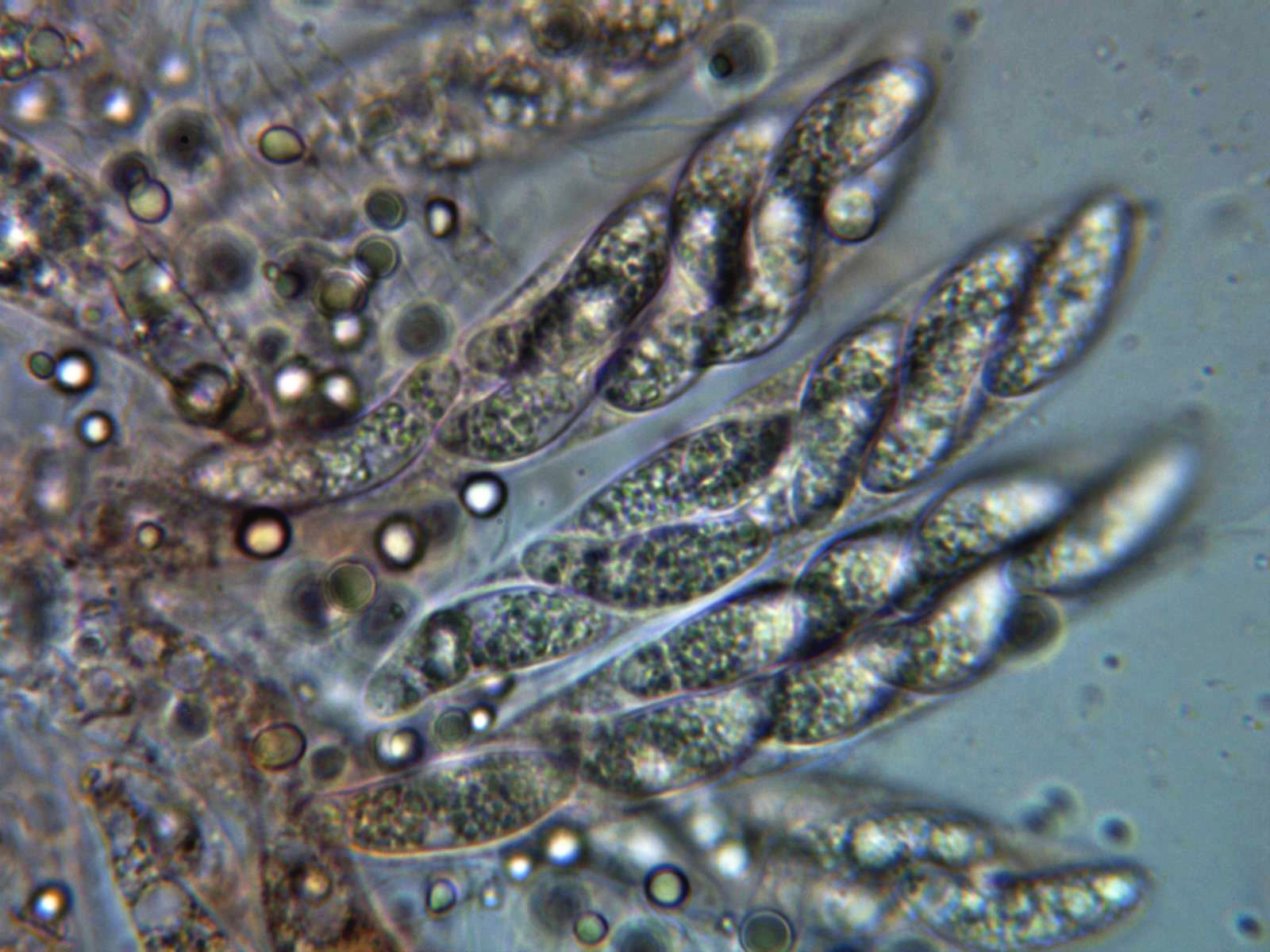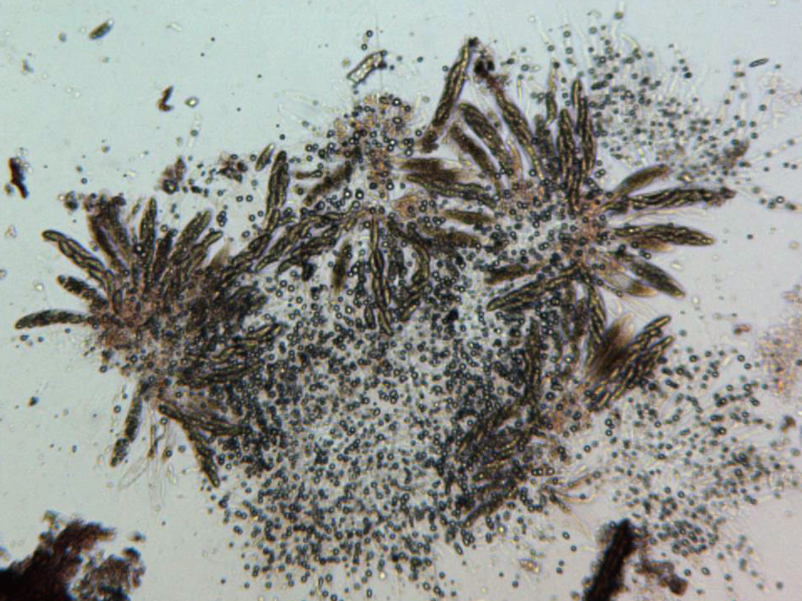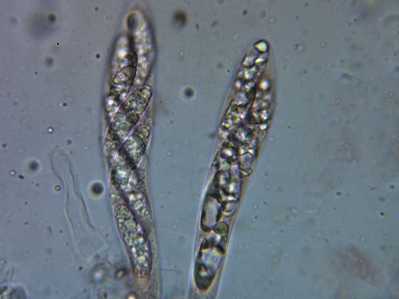 Esporas àmpliamente elipsoidales, alargadas, alantoides, con un septo al acercarse a un extremo, algo constreñidas en el mismo y con contenido granuloso, más hialinas en el extremo a partir del septo, con unas medidas de 23,6;29 X 7;8,5 micras.
