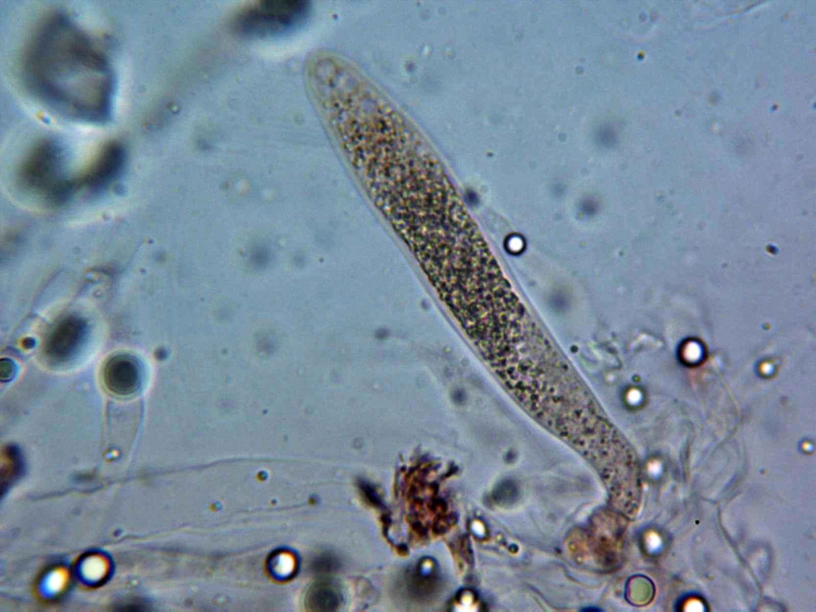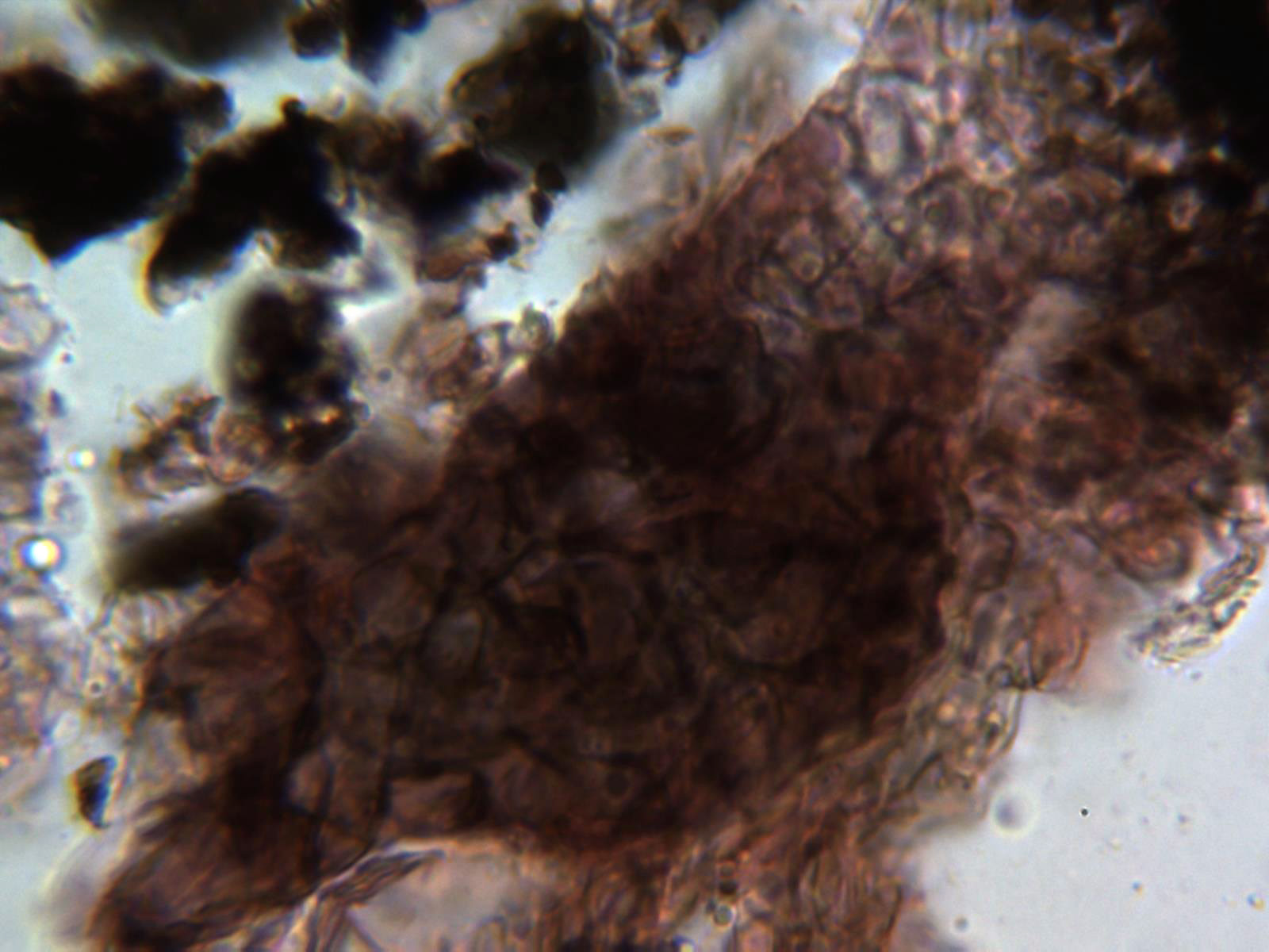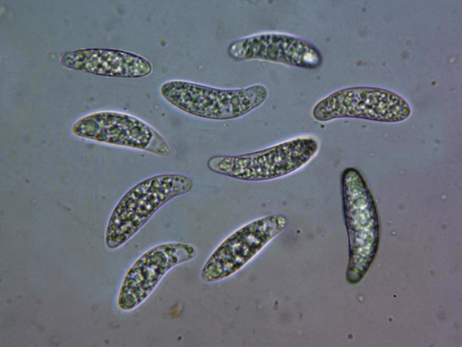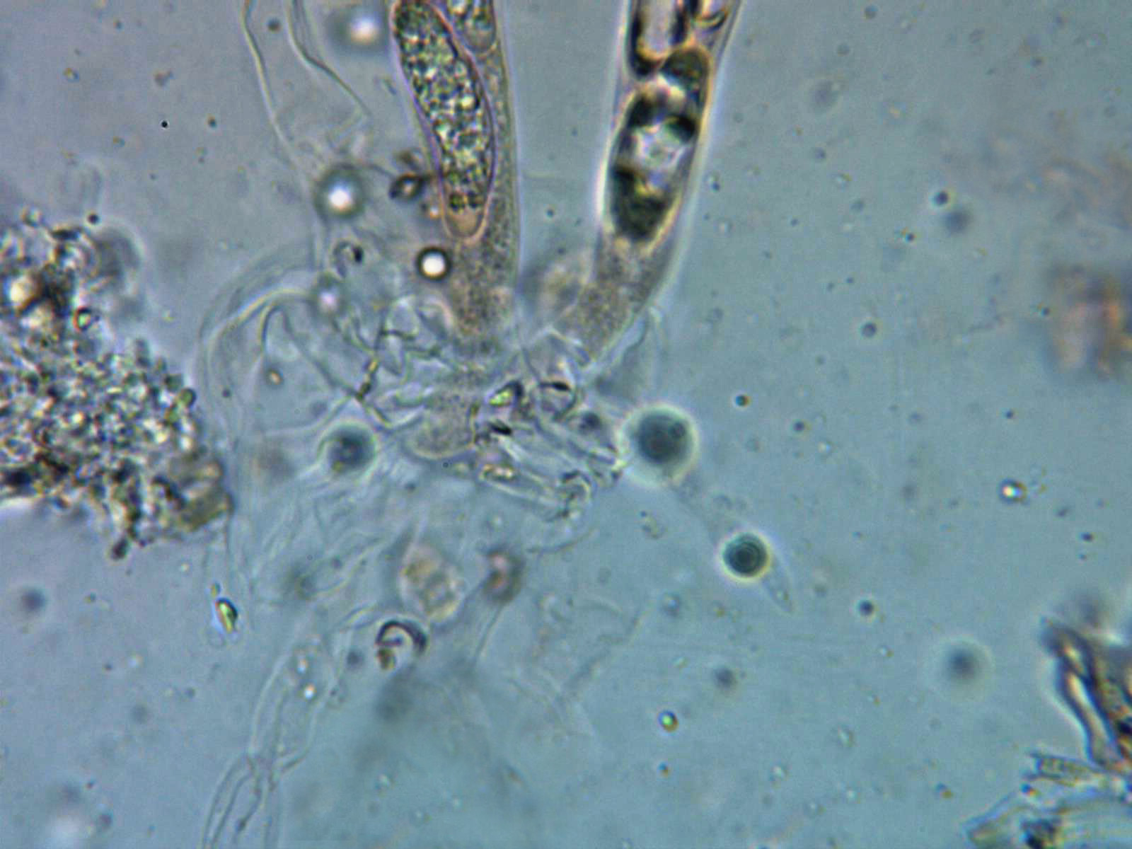 Esporas àmpliamente elipsoidales, alargadas, alantoides, con un septo al acercarse a un extremo, algo constreñidas en el mismo y con contenido granuloso, más hialinas en el extremo a partir del septo, con unas medidas de 23,6;29 X 7;8,5 micras.