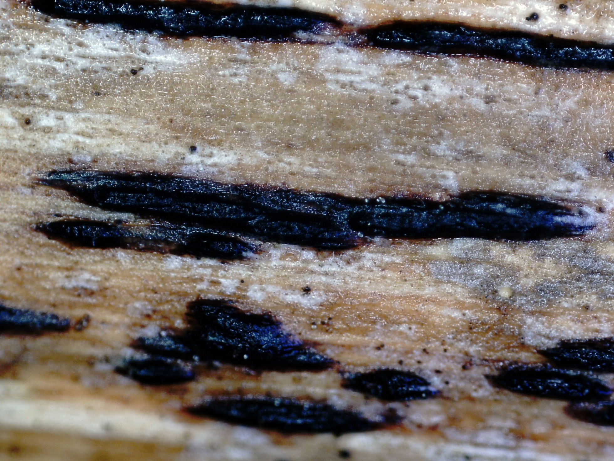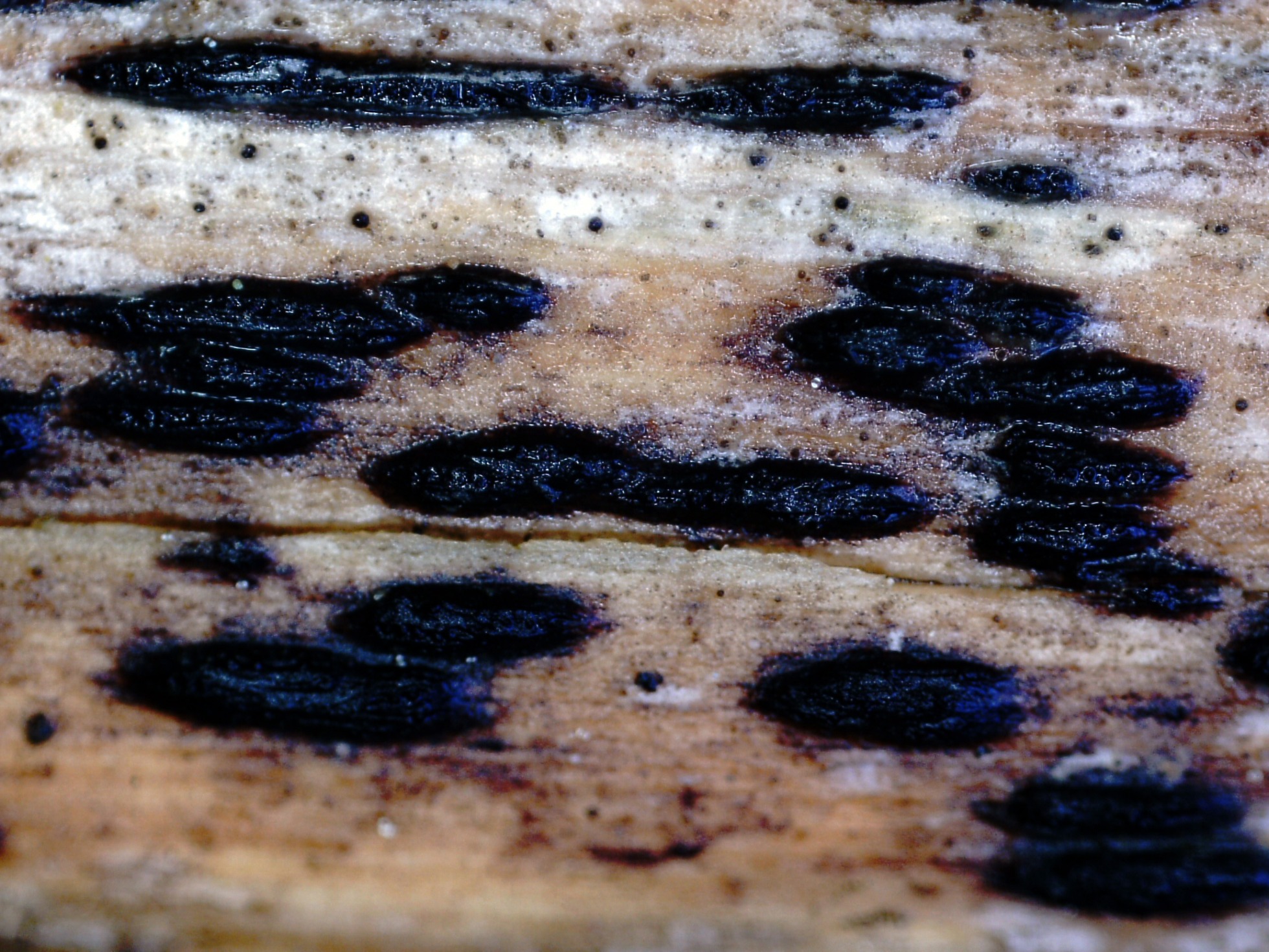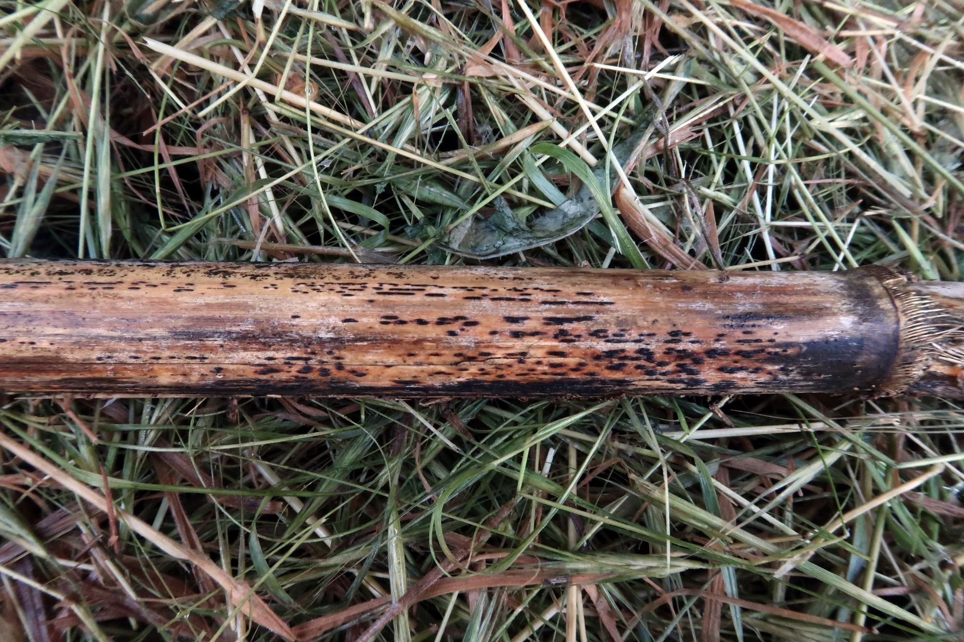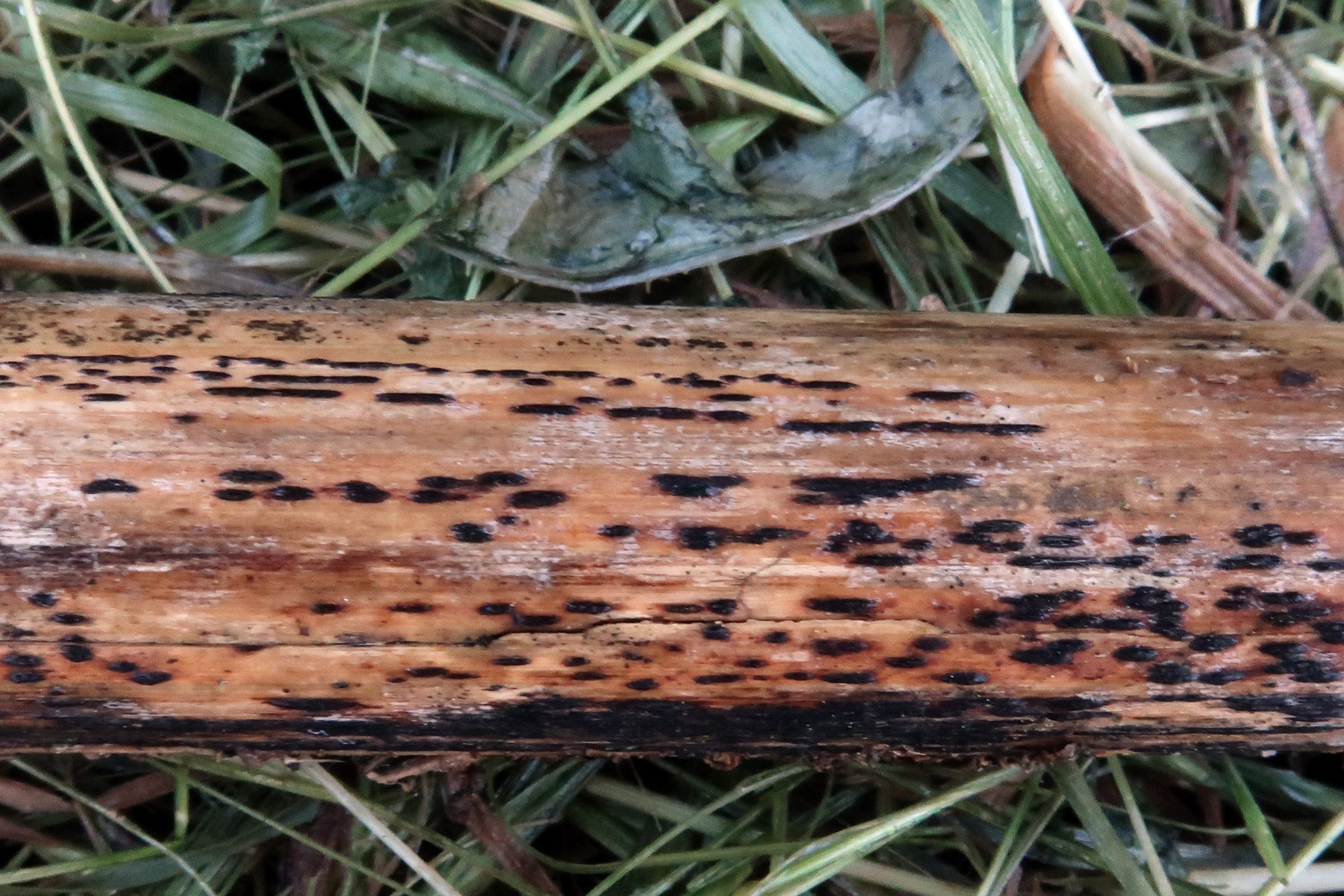 Unas pequeñas fructificaciones de color negro, sobre la superficie de una caña común , por mi zona llamada "Canya de Sant Joan","Arundo donax", especie invasora que ocupa grandes extensiones en pantanos y riberas de ríos.