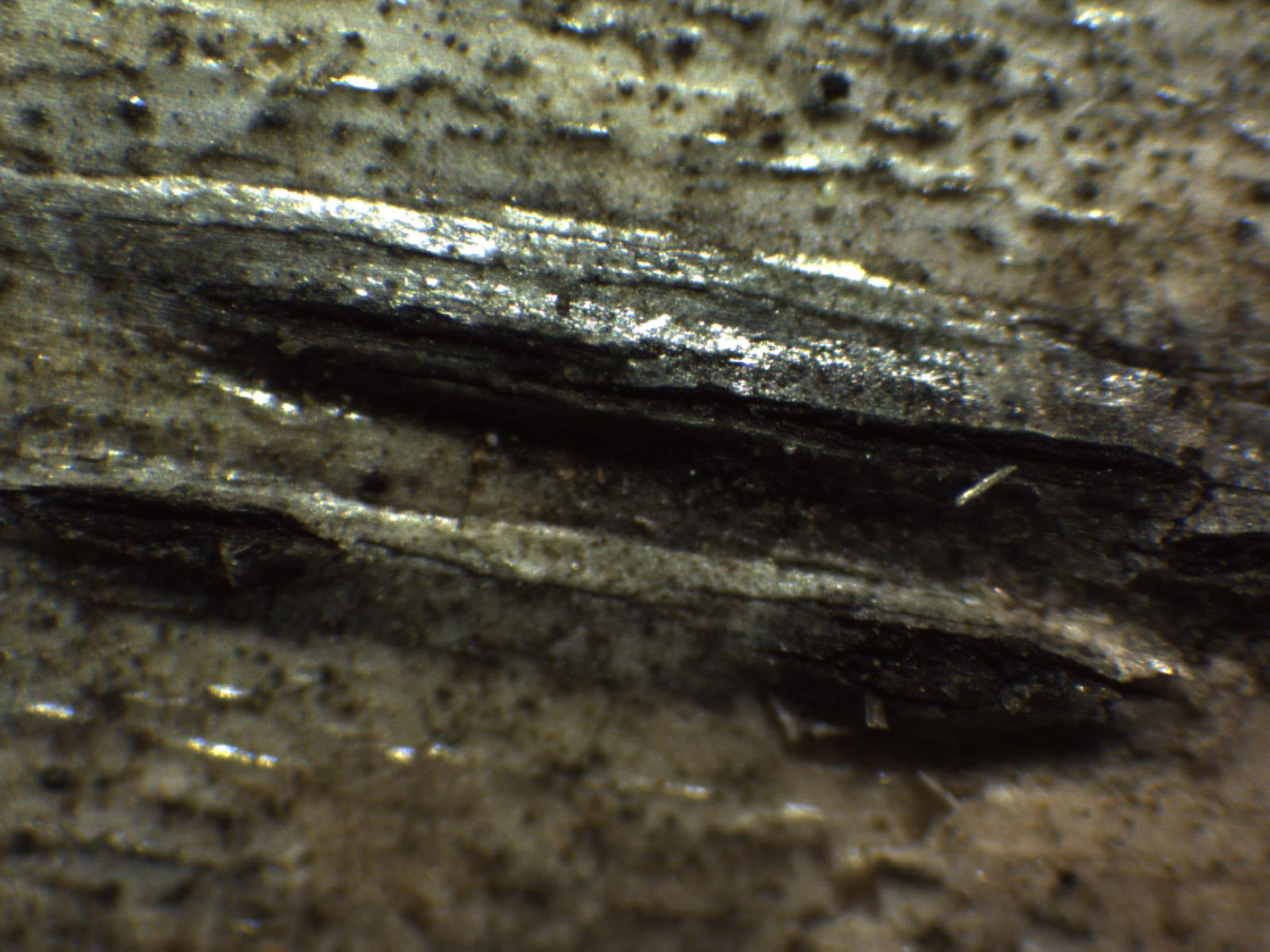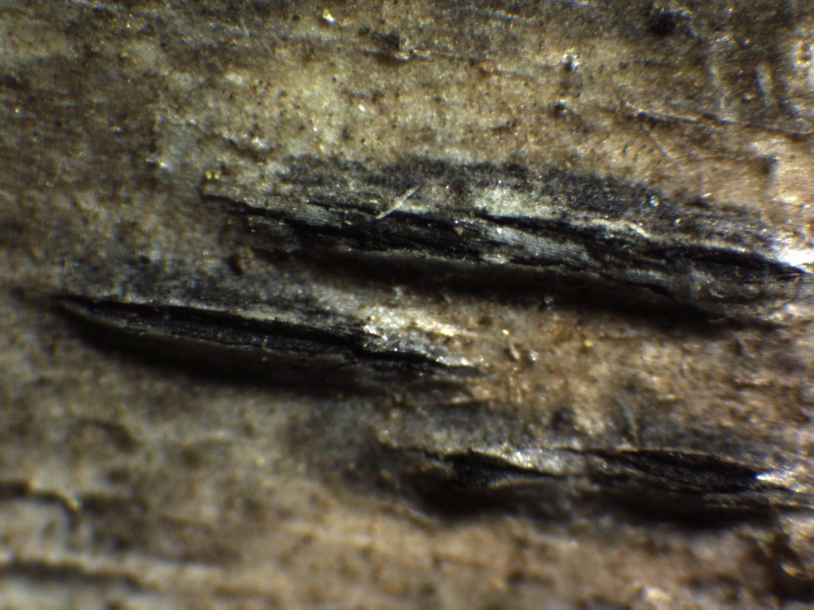 Pequeños carpóforos dispuestos paralelamente y sobresaliendo poco por la superficie.