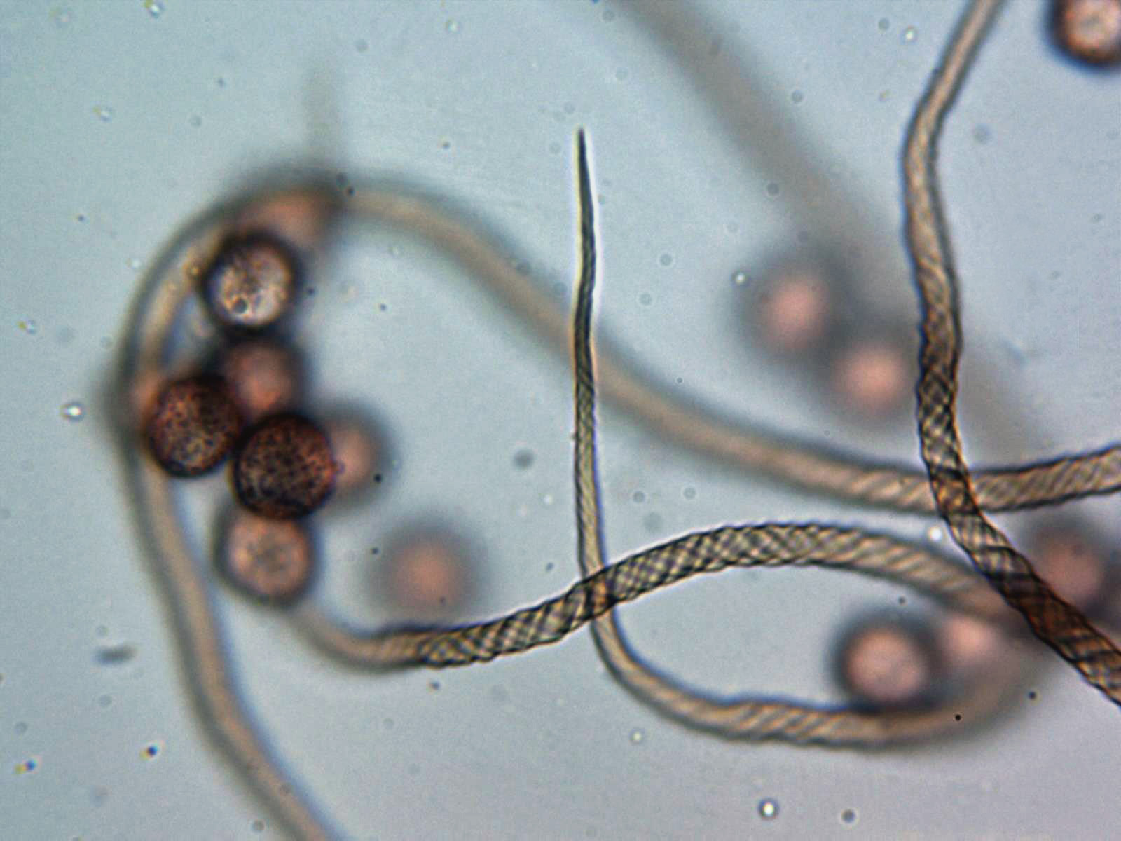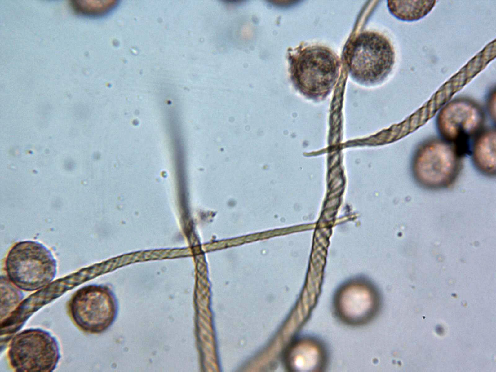Capilicio de entre 4,2 a 4,9 micras de ancho, con hasta cuatro bandas en espiral y sin aparentemente espinas ni crestas.