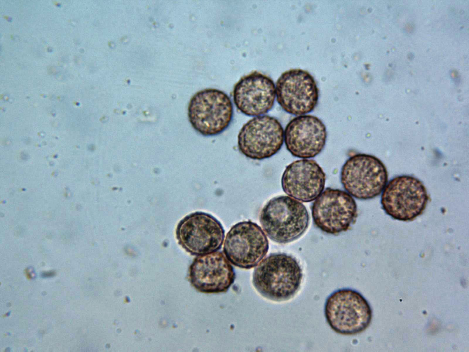 Esporas globosas, muy delicadamente verrucosas, dejando entrever en muchos casos una rudimentaria retícula, con doble pared gruesa según el plano observado. Sus medidas de entre 9,5 a 12,1 micras.
