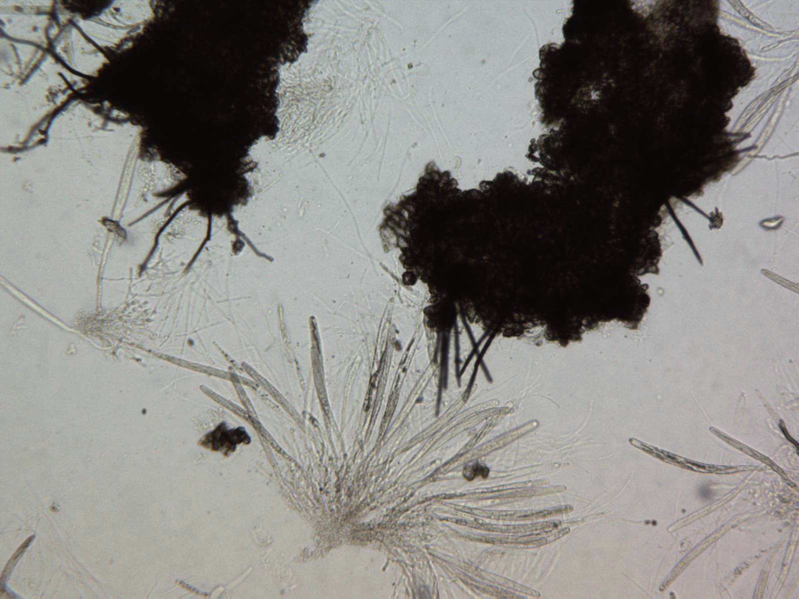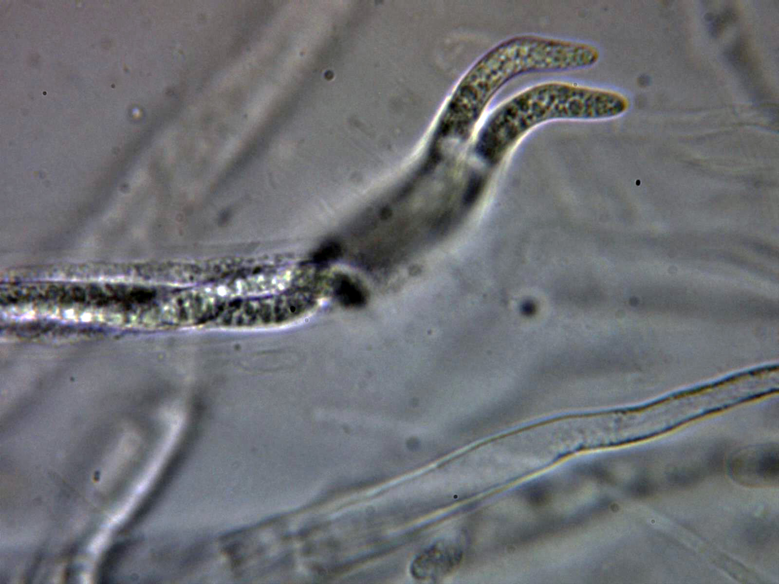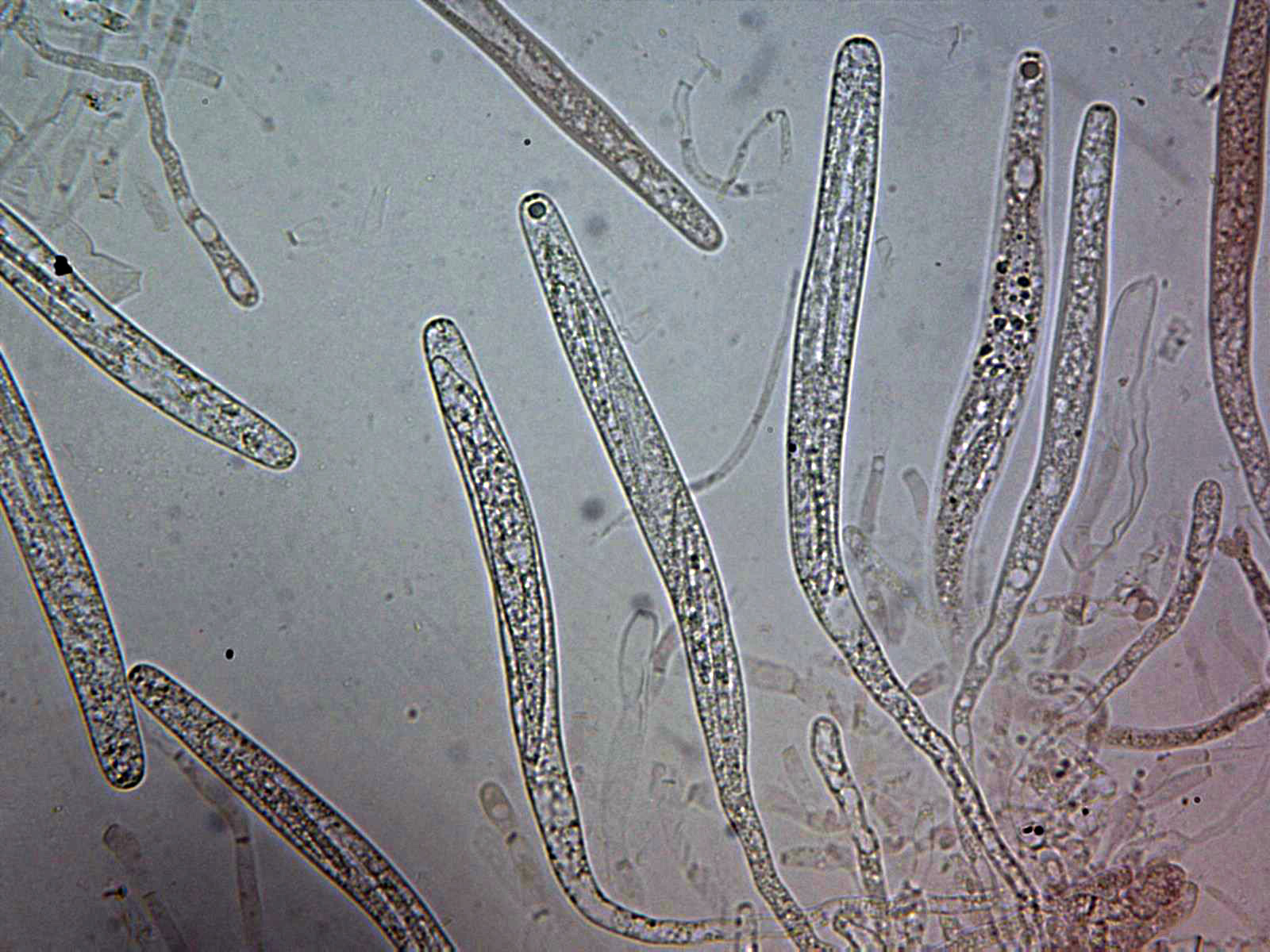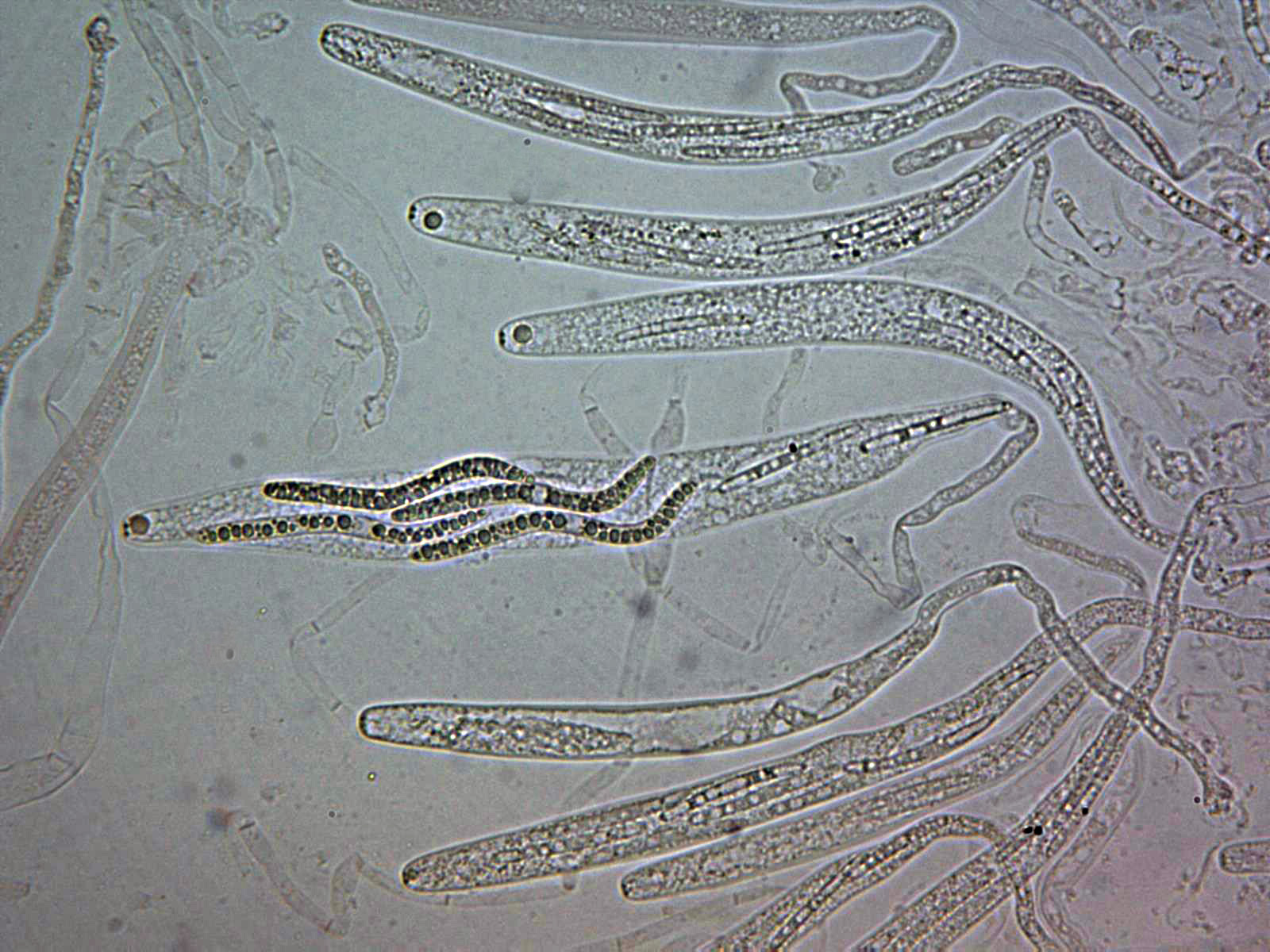 Un ejemplar eclosionado a tan solo 100 aumentos, ya se observan perfectamente las ascas y los pelos oscuros e hialinos en el ápice.
