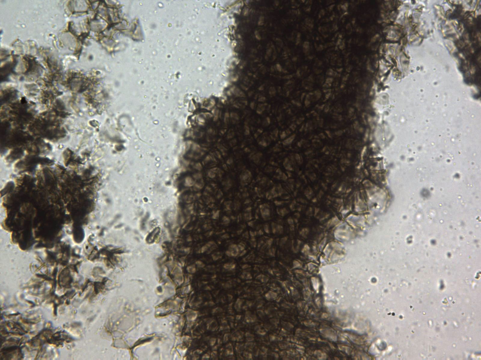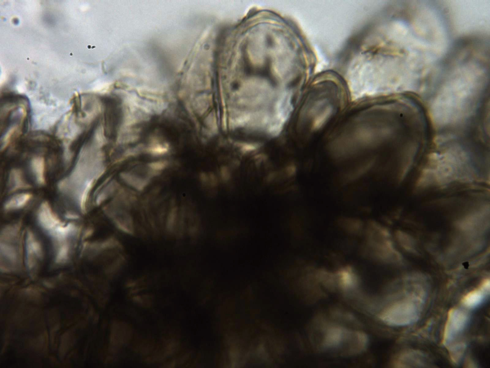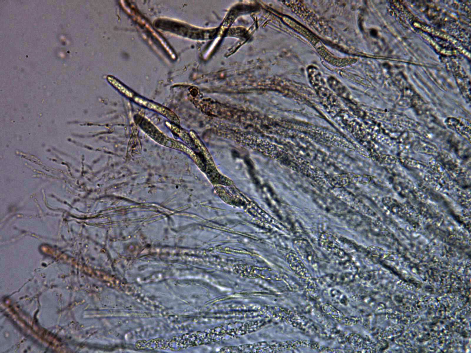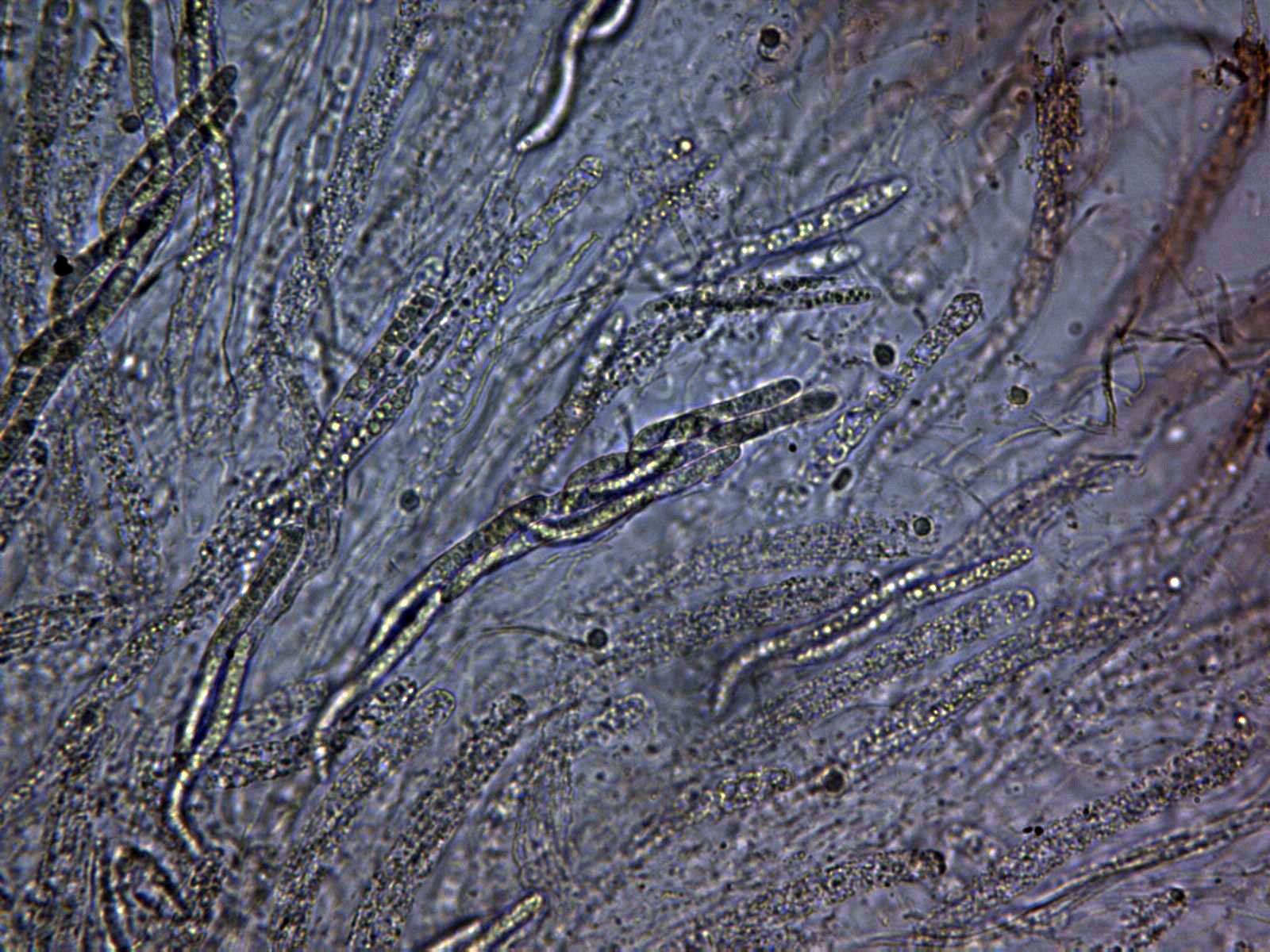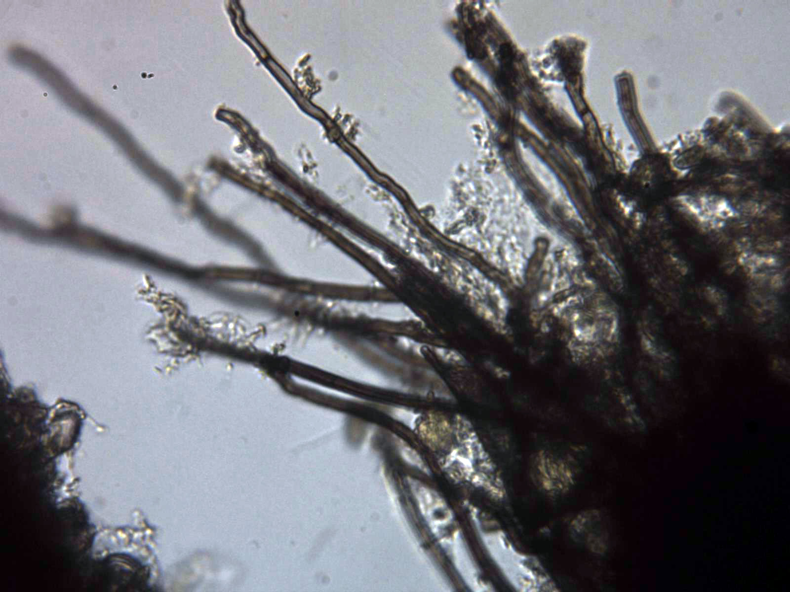 Hifas pigmentadas del excípulo externo a 1000 aumentos.