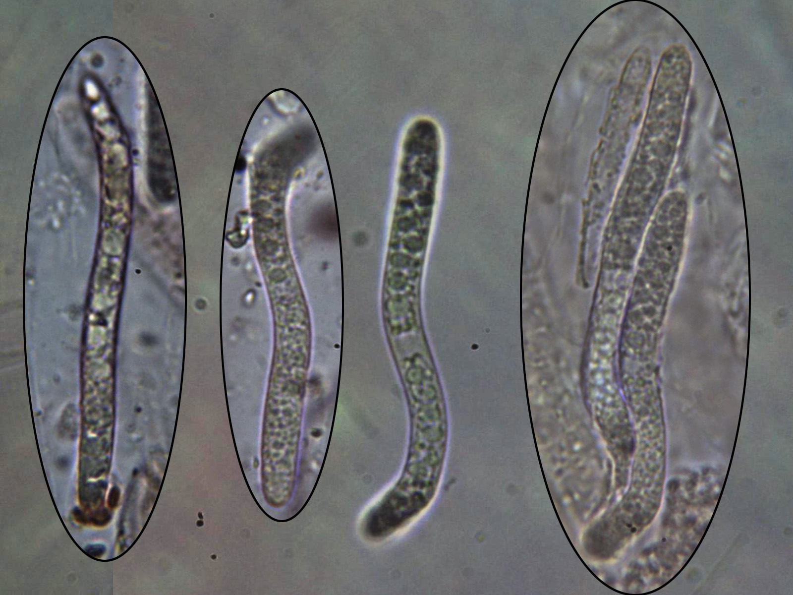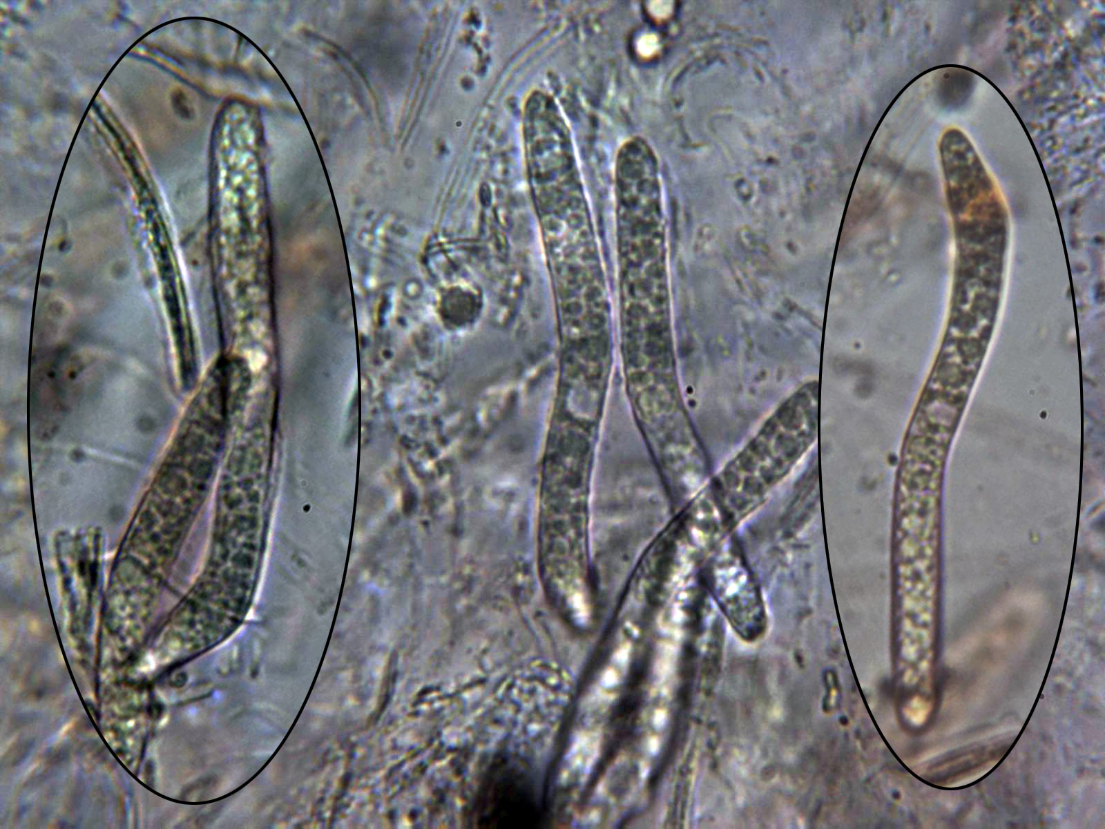 Esporas cilíndricas, alargadas, curvadas en los extremos, y con gutulaciones en su interior.