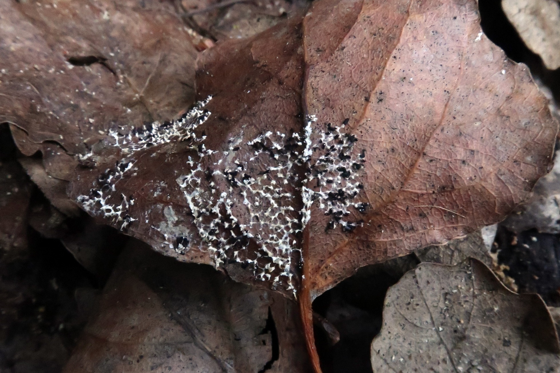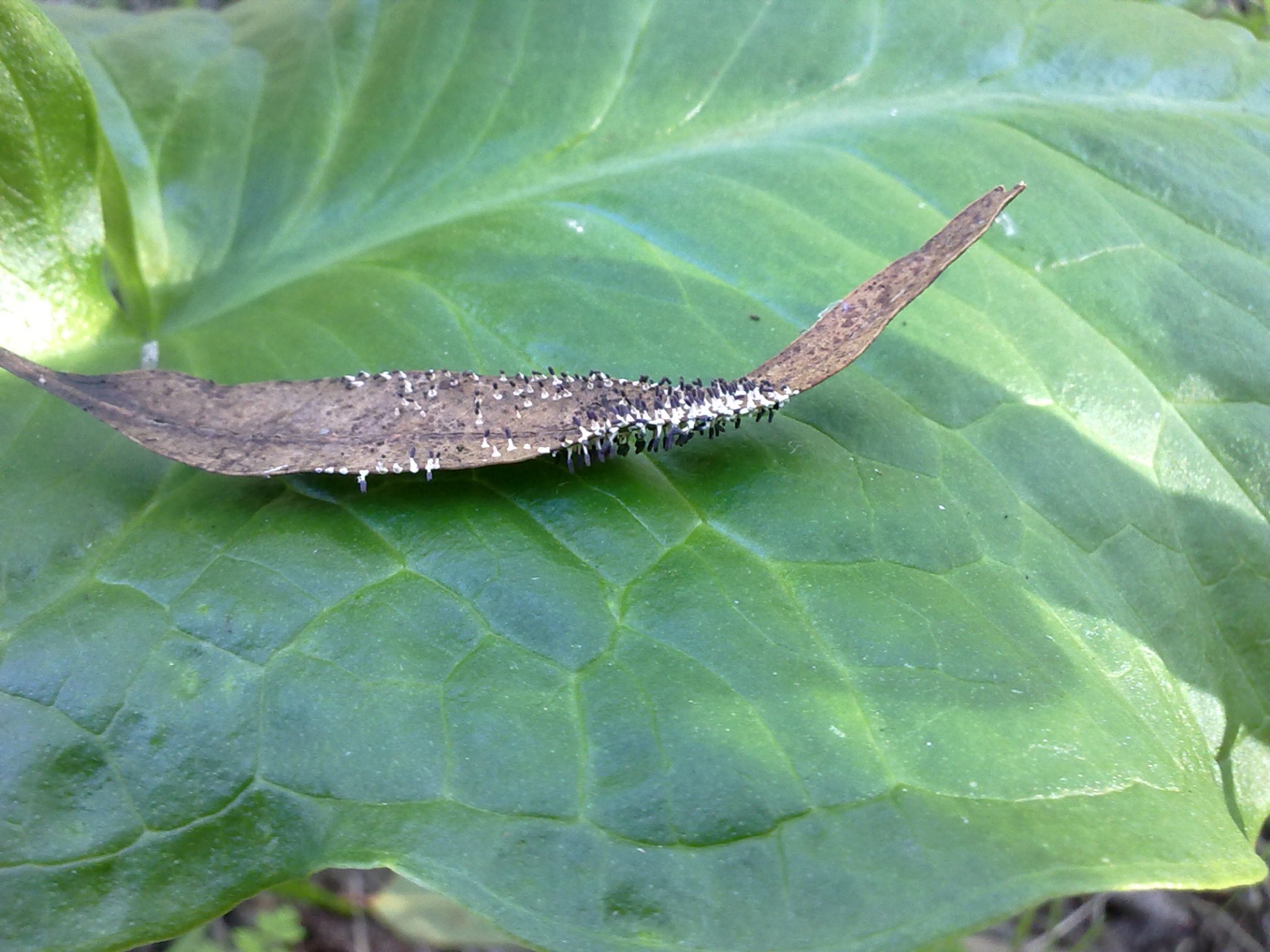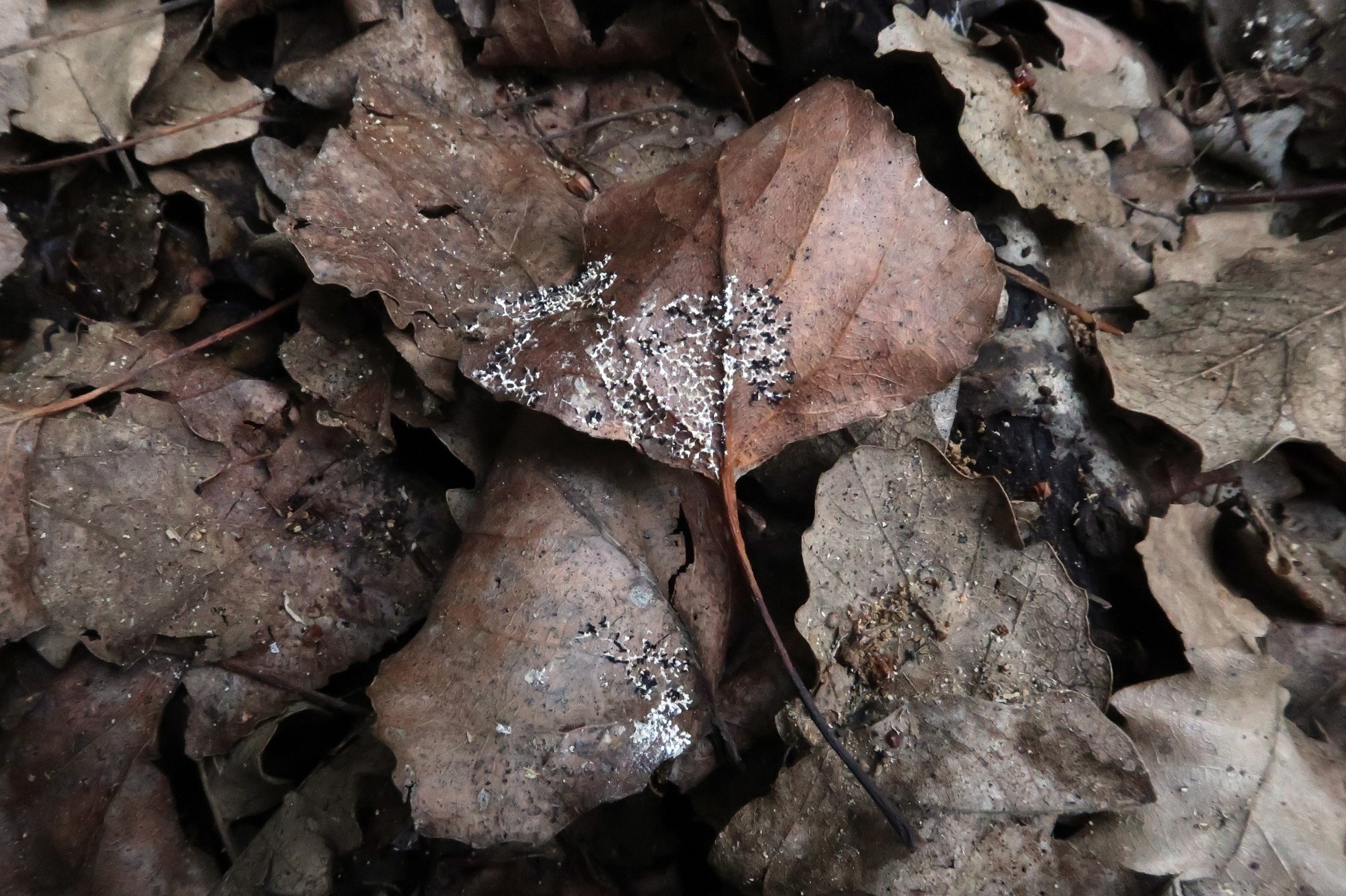 Otra especie del pasado domingo brotando sobre unas hojas de chopo.