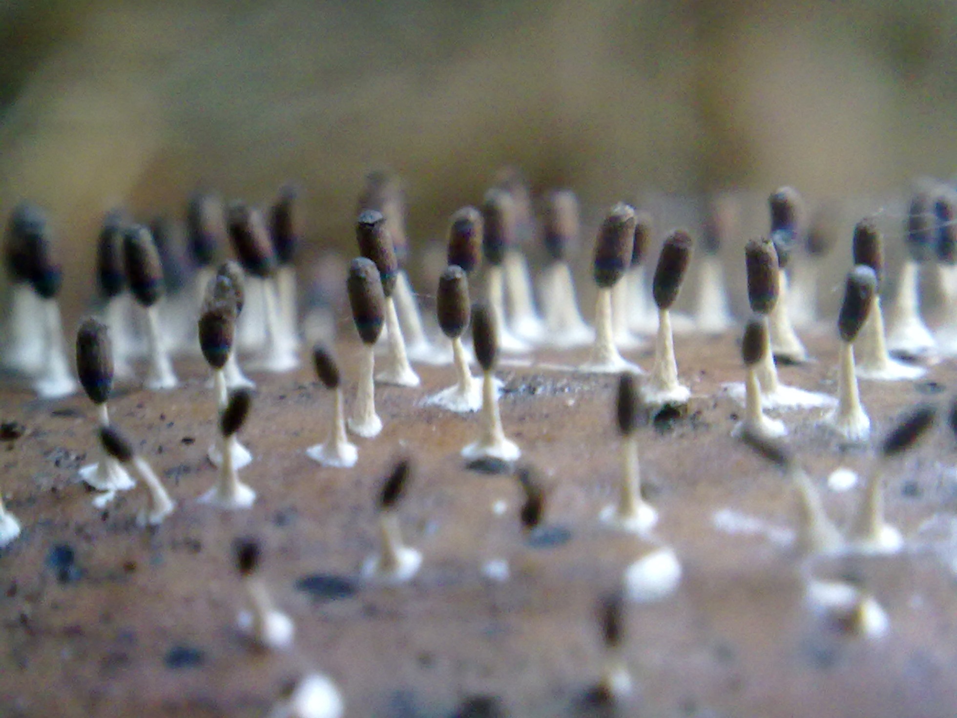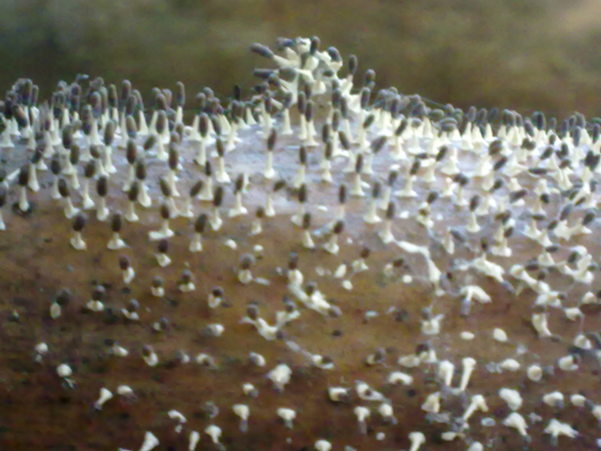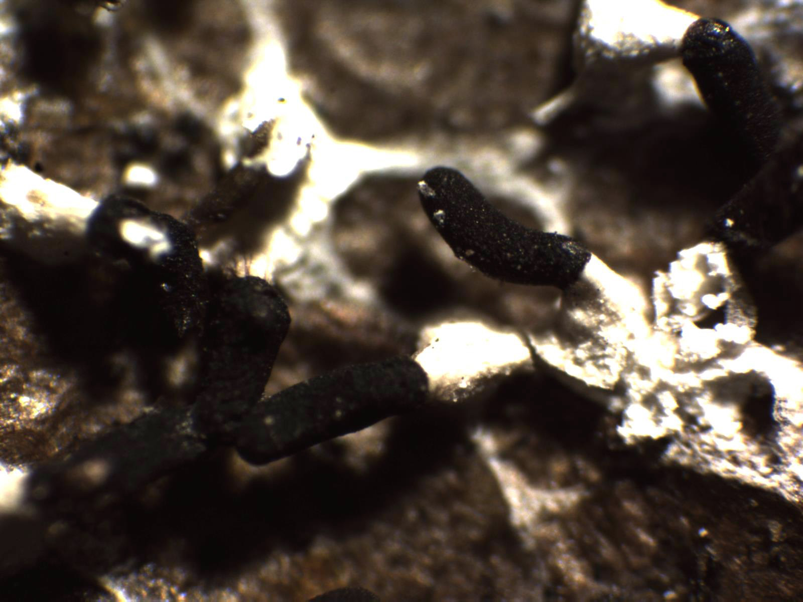 Esporocarpos de 1 a 1,8 mm,, ciilindricos, terminando con forma redondeada y con una anchura de 0,3 a 0,5 mm.