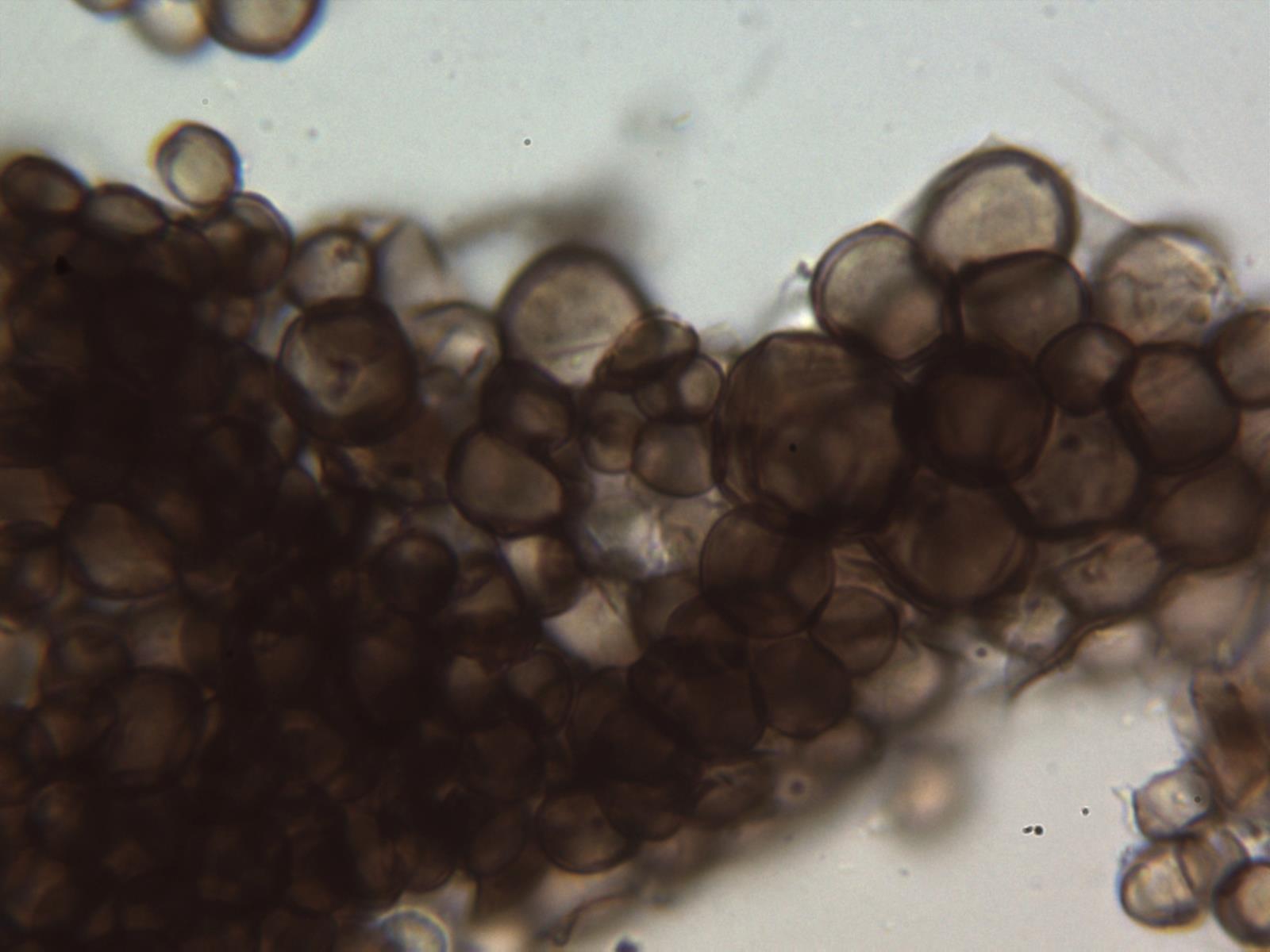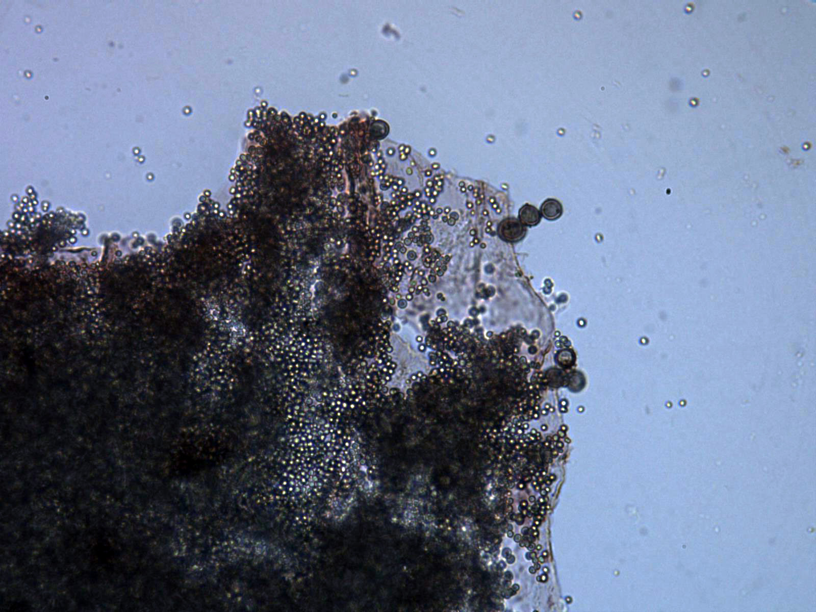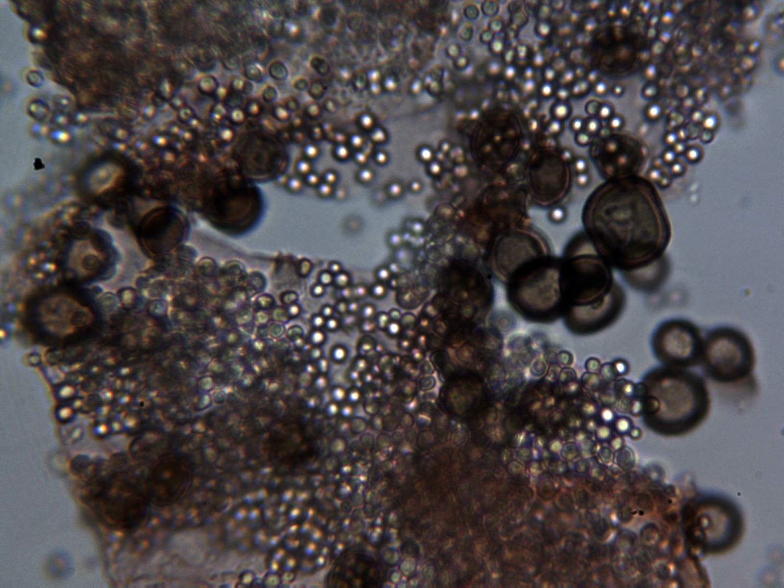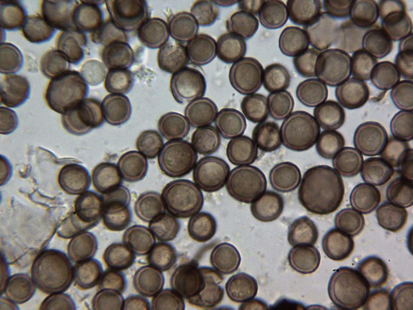 Esporas en agua destilada, muchas de ellas aún en período de formación, las desarrolladas con unas medidas de entre 7 y 10 micras.