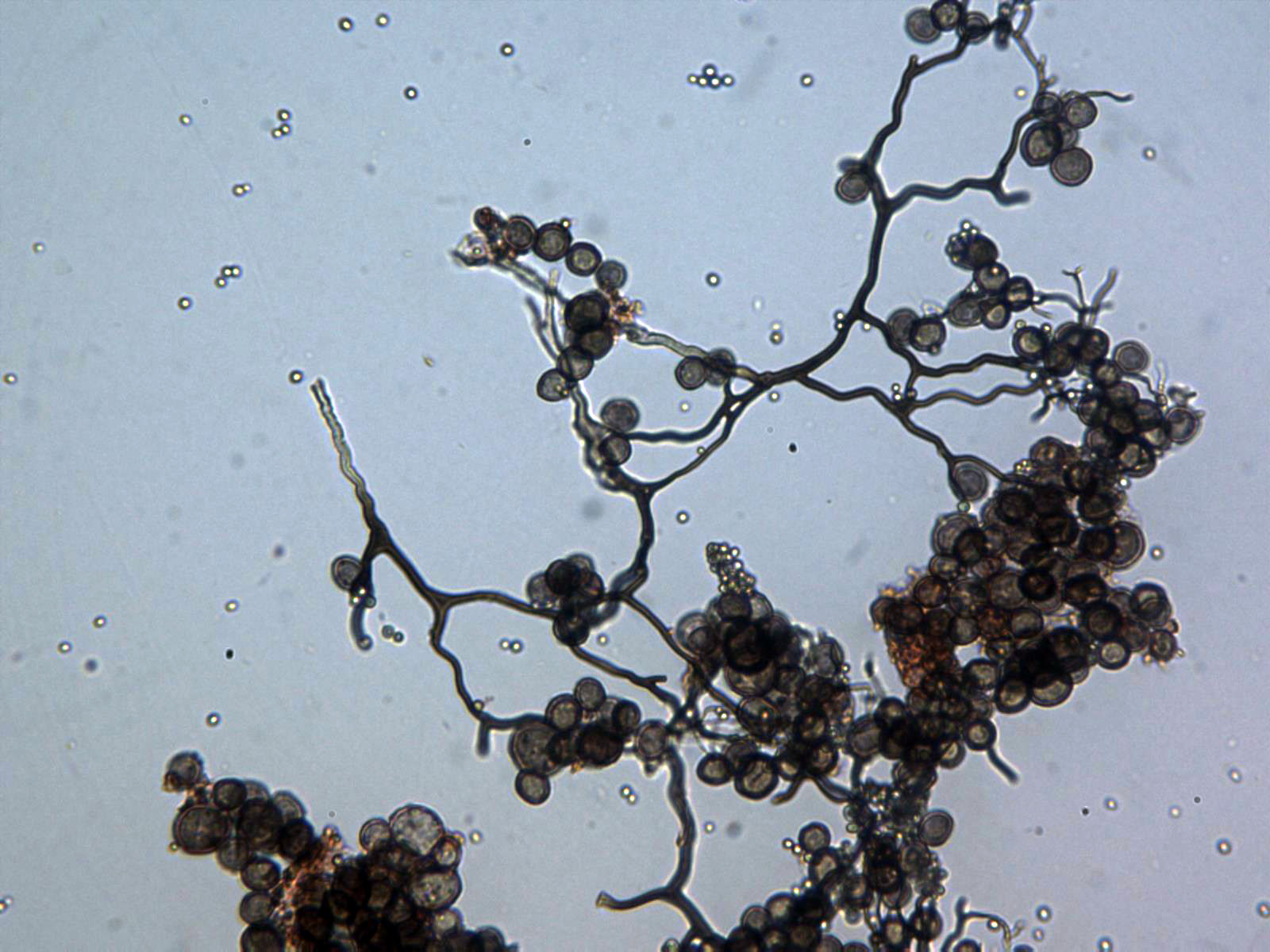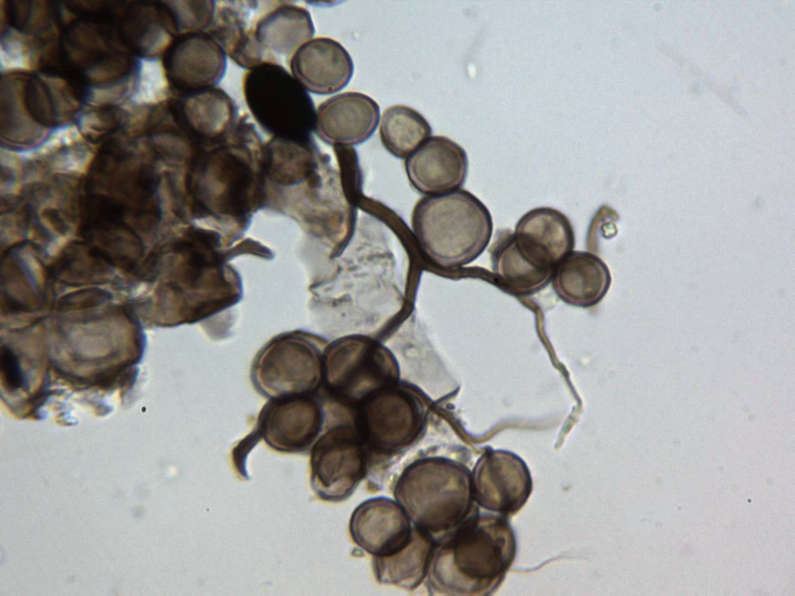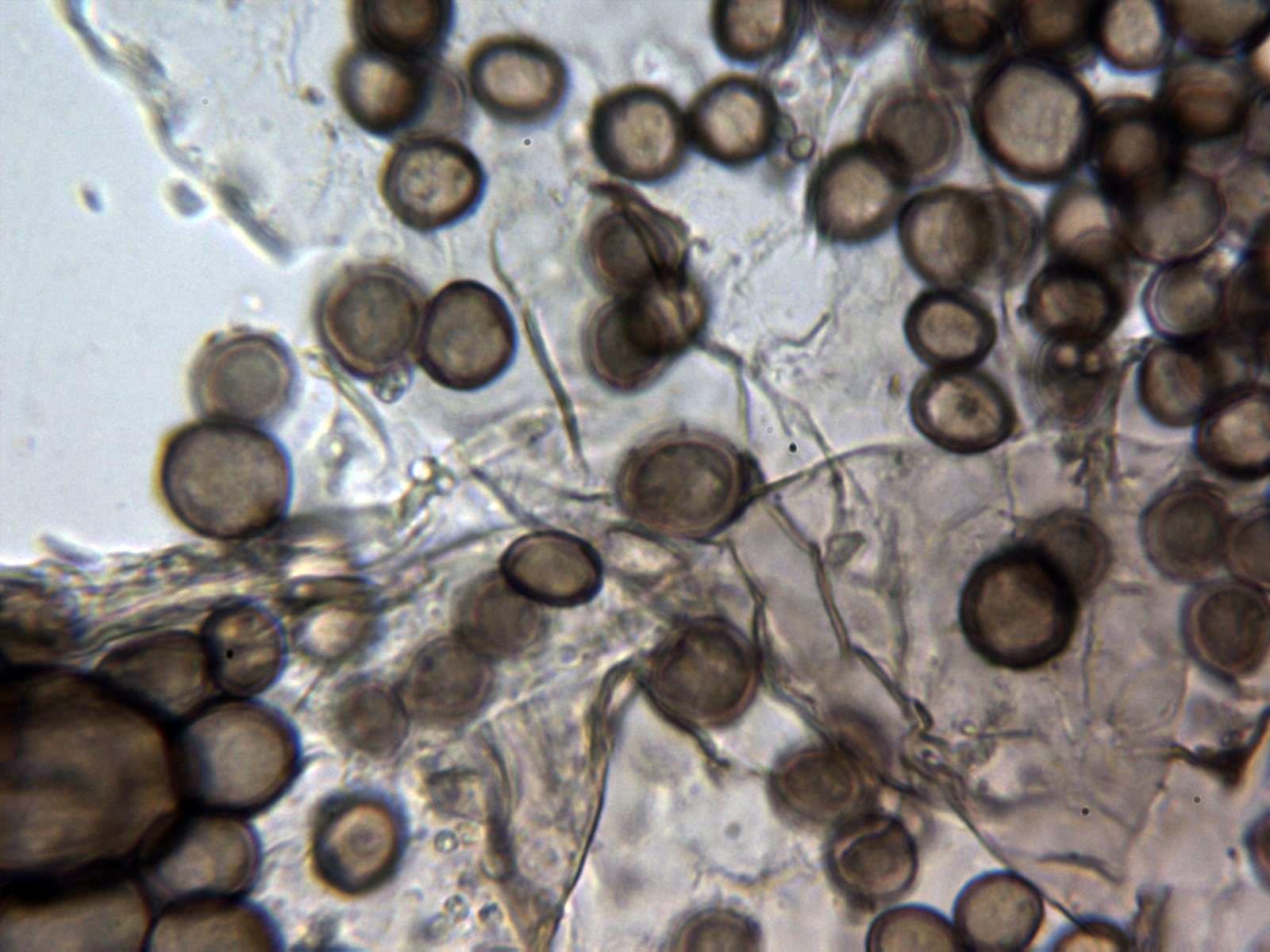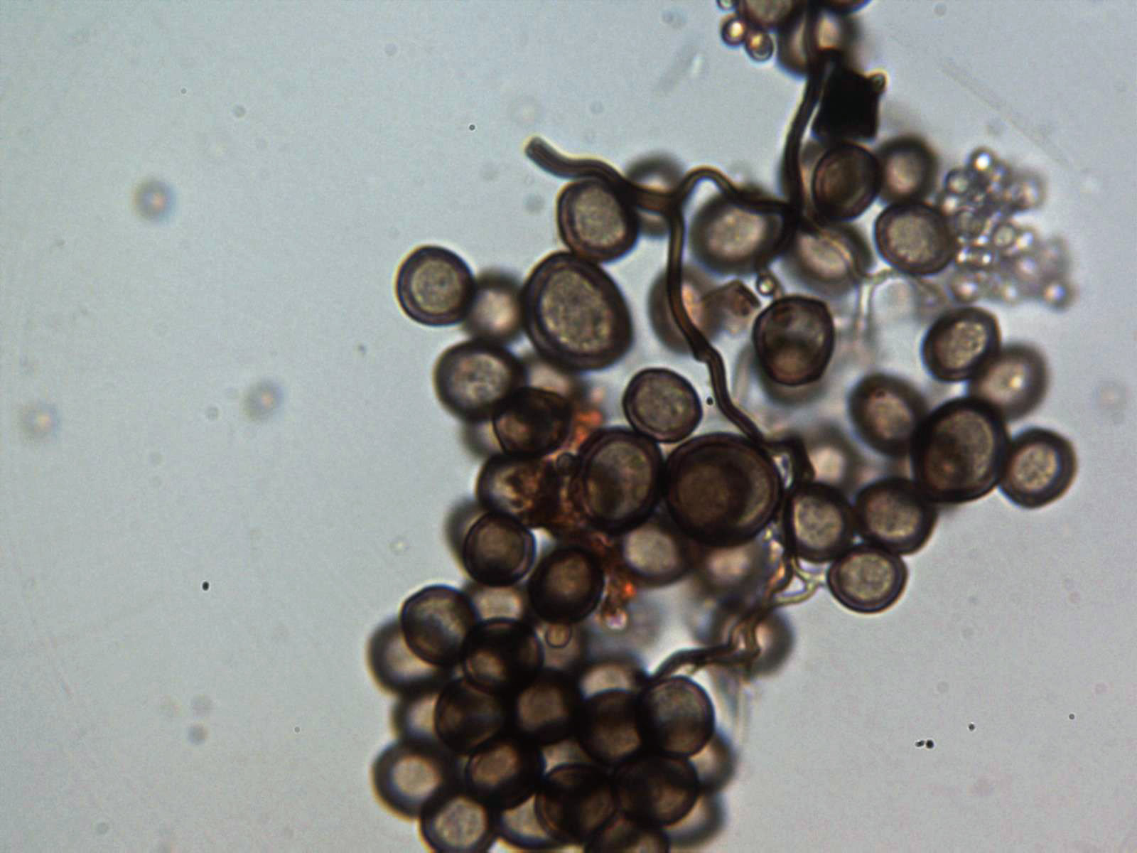 Esporas en agua destilada, muchas de ellas aún en período de formación, las desarrolladas con unas medidas de entre 7 y 10 micras.