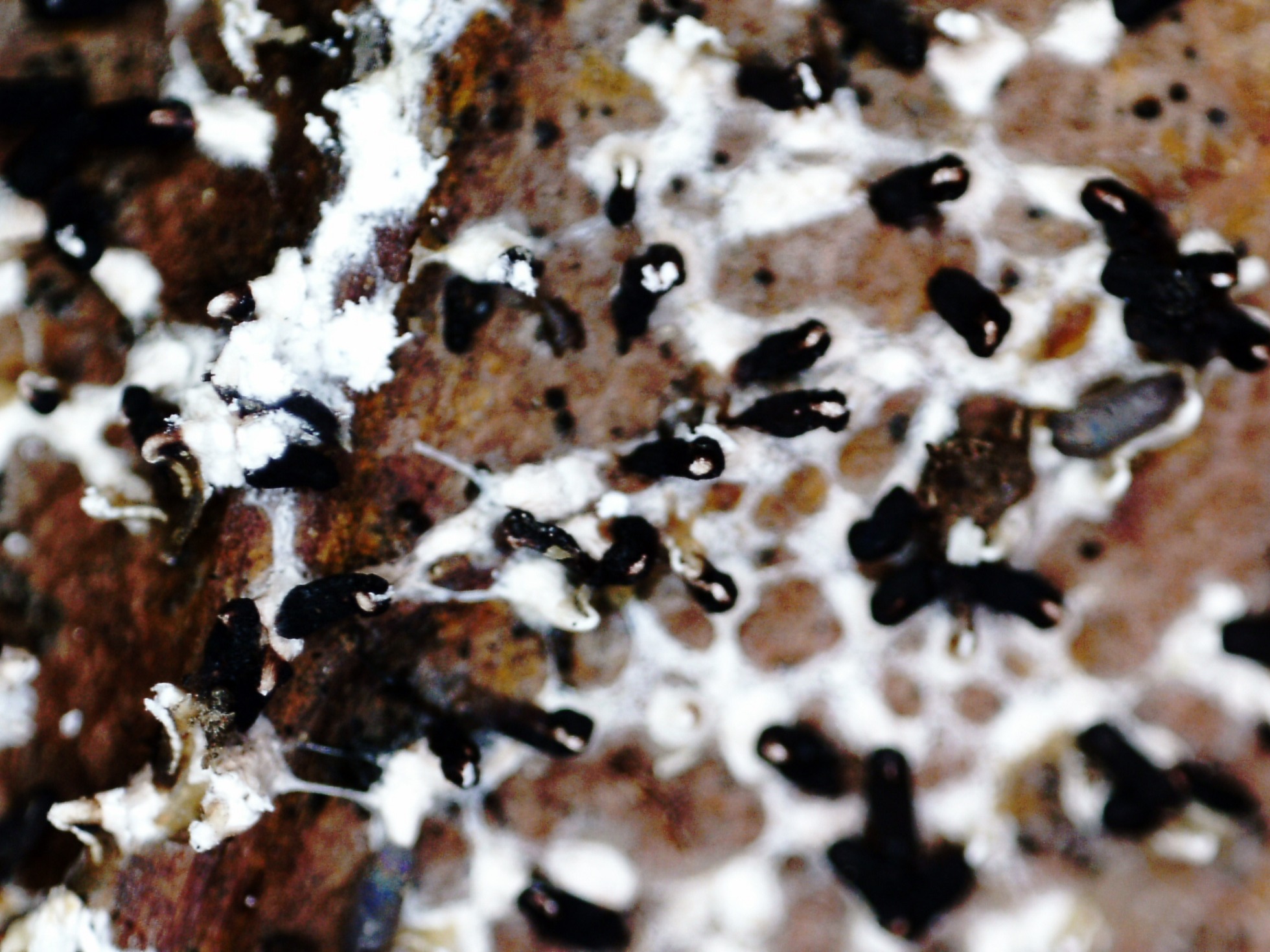 Esporocistos de color prácticamente negro, con el pié blanco y ensanchado en la base. Plasmodium color blanco opaco.