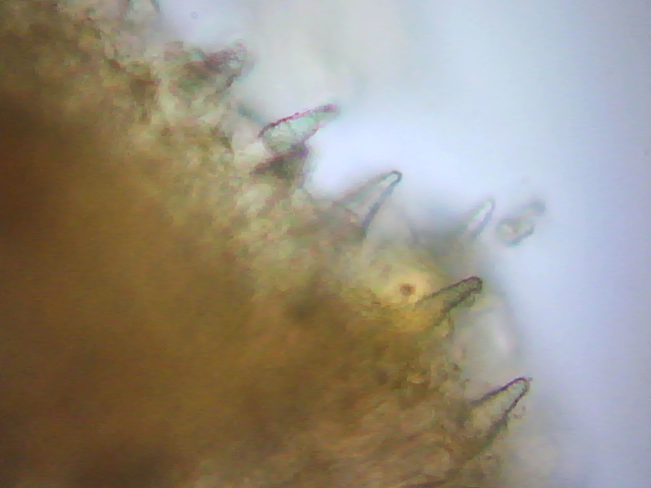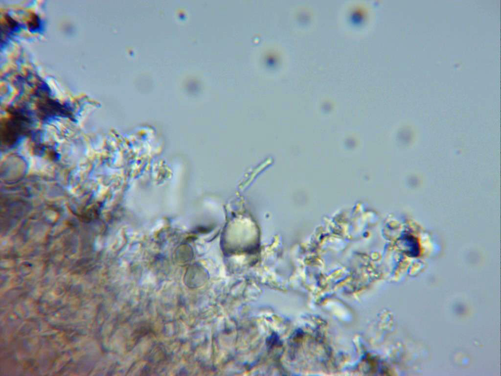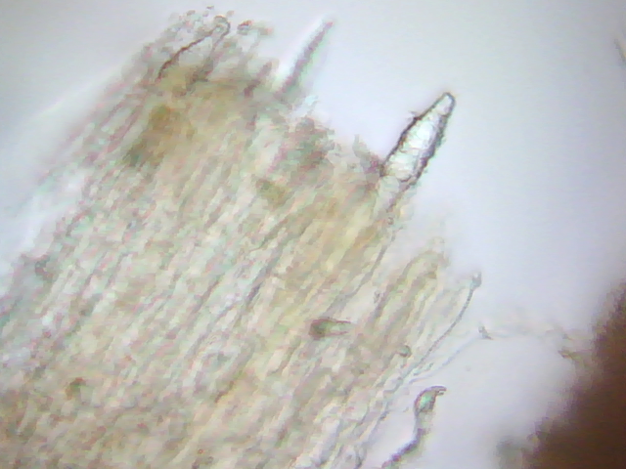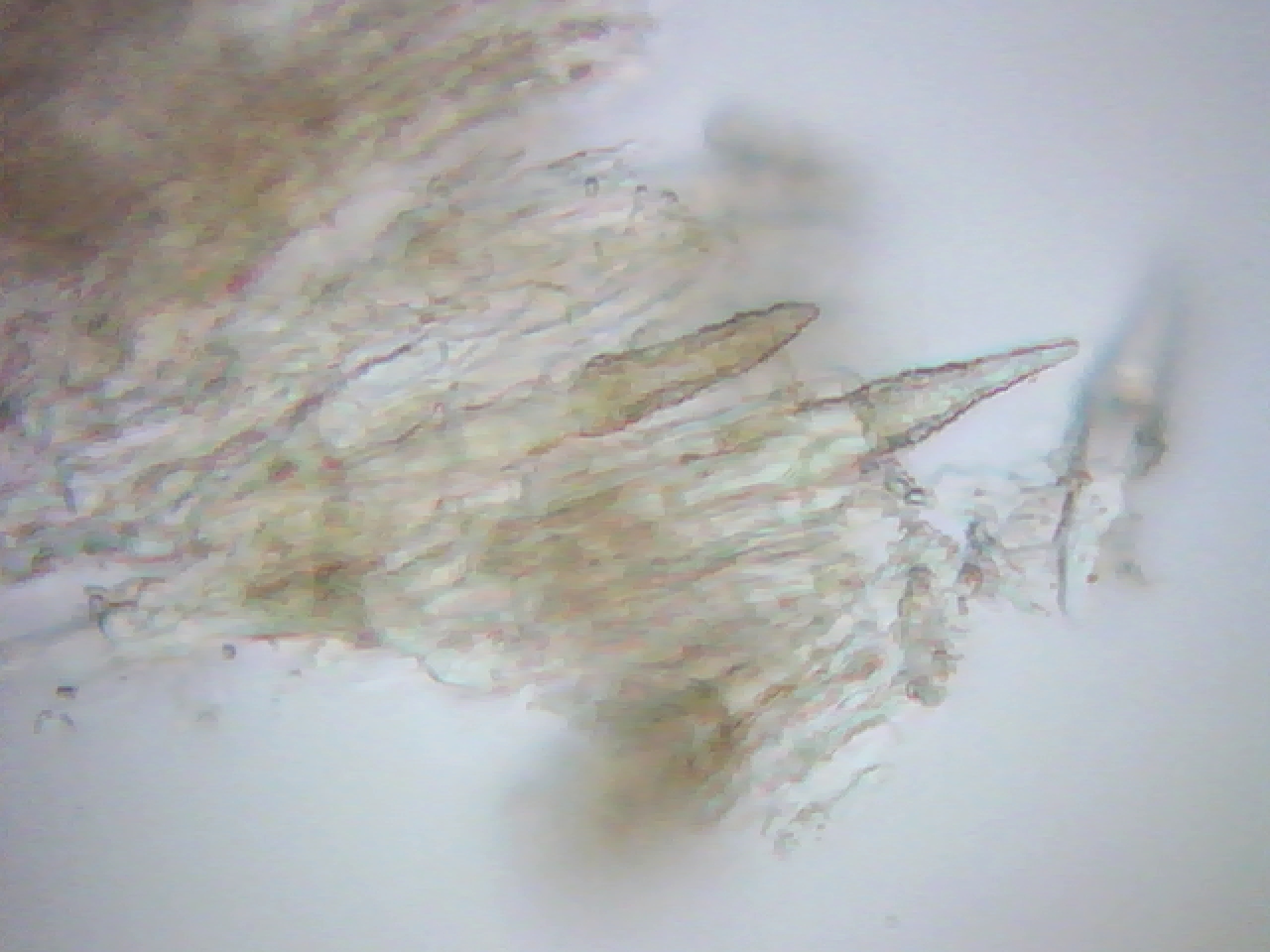 . Para conseguir la esporada con especies como esta a mí me ha dado mucho resultado el dejarlas un par de horas sumergidas en agua, luego las seco con mucho cuidado solo colocándolas encima de un paño suave, y seguidamente las coloco encima de un porta con el himenio para abajo y cubro todo con un recipiente (yo utilizo unos recipientes de plástico rectangulares a la medida de los portas, pero un vaso puede servir), en casi todos los casos a las 24 horas tienes ya una gran cantidad de esporas, si la misma muestra la cortas en tres trozos, al esporar tendrás 3 esporadas encima del cubre, en mi caso una la preparo con agua destilada, la otra con Rojo Congo diluido y la tercera con reactivo de Melzer, así y con una sola muestra ya tengo los tres resultados.