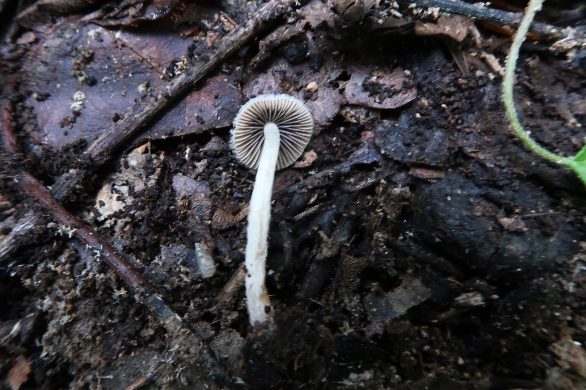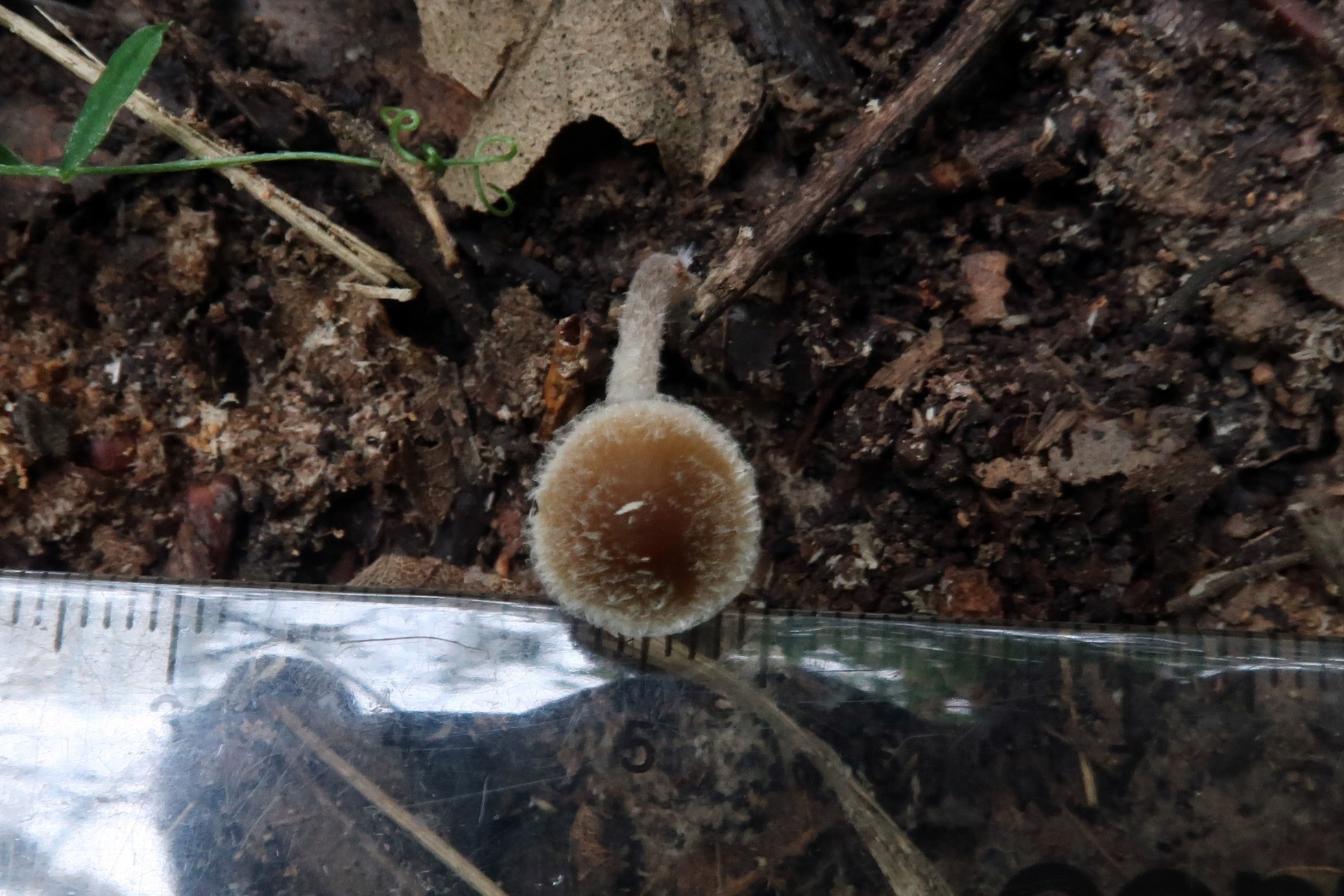 Sombrero de poco mas de 1 cm., de color marrón con el centro del mismo mas oscuro. Superficie del sombrero cubierta de fibrillas blanquecinas.