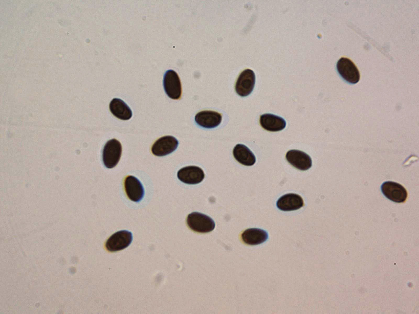 Esporas entre ovoides y elipsoides, de color marrón oscuro, con una discreta apícula excéntrica, dejando entrever una gota de grasa en su interior.
